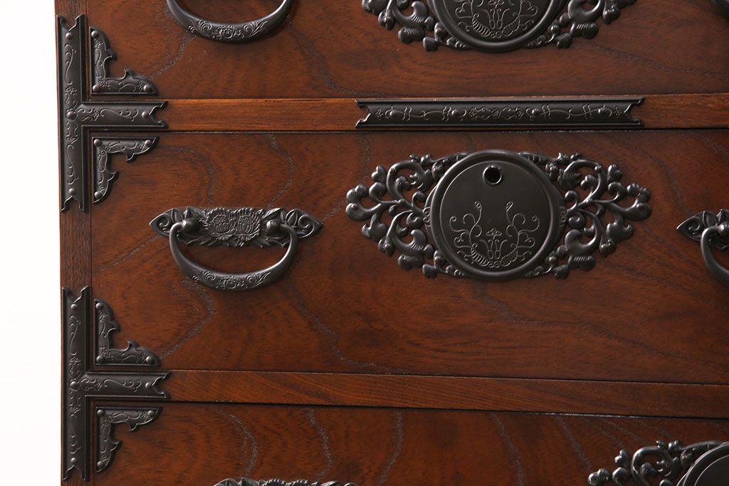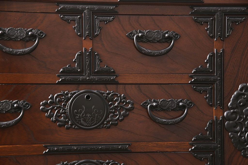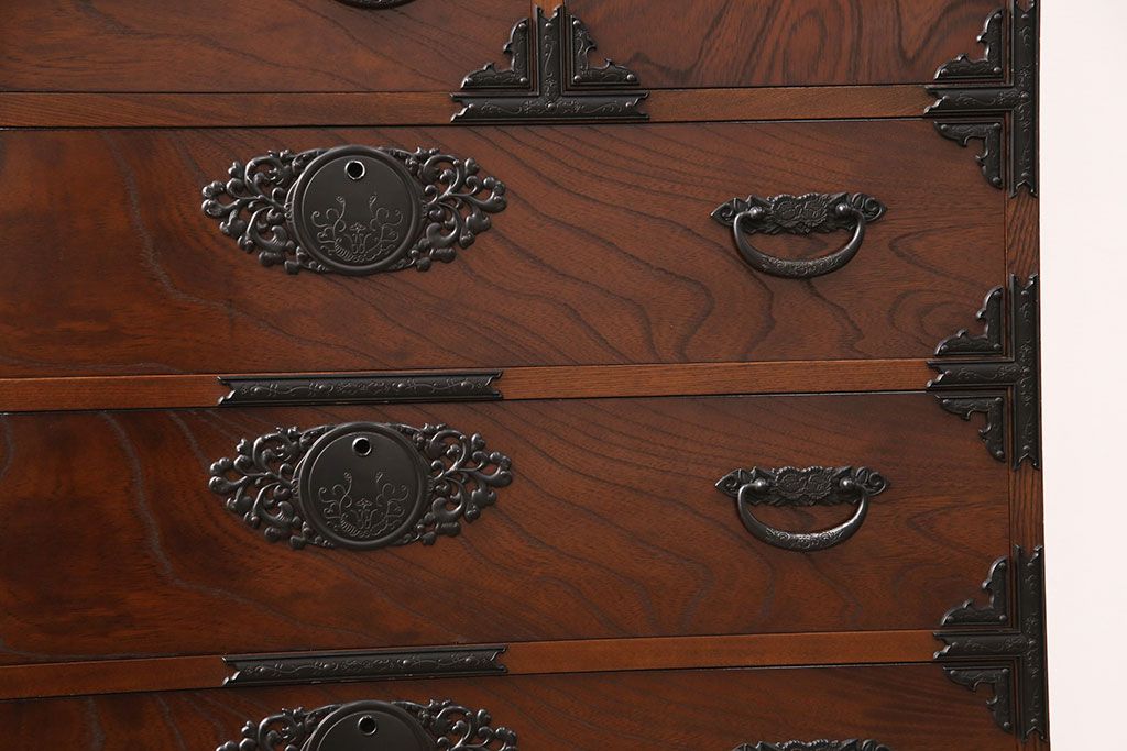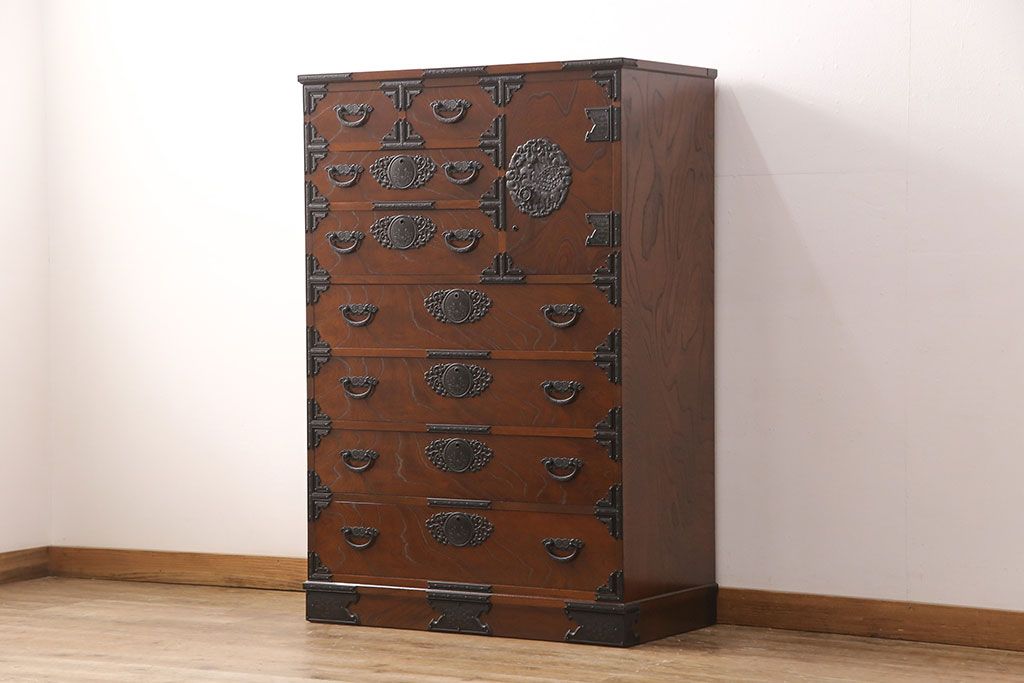和箪笥 > 中古 美品 国産民芸家具 内部総桐材 飾り金具の意匠が美しい衣装箪笥(和タンス、チェスト、引き出し)(R-051663)