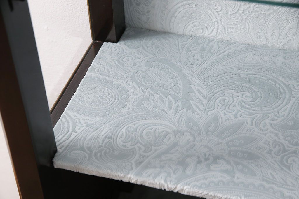 イタリアヴィンテージのショーケースをリペア&カスタム!扉内背面、底面の生地を張り替え。(ガラスケース、陳列棚、飾り棚、キャビネット)