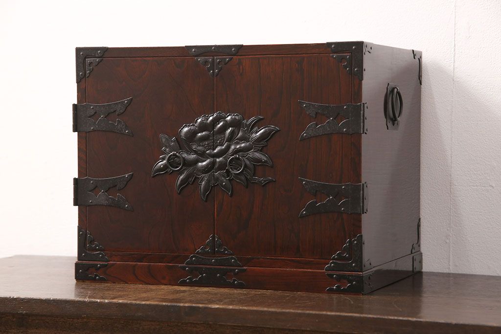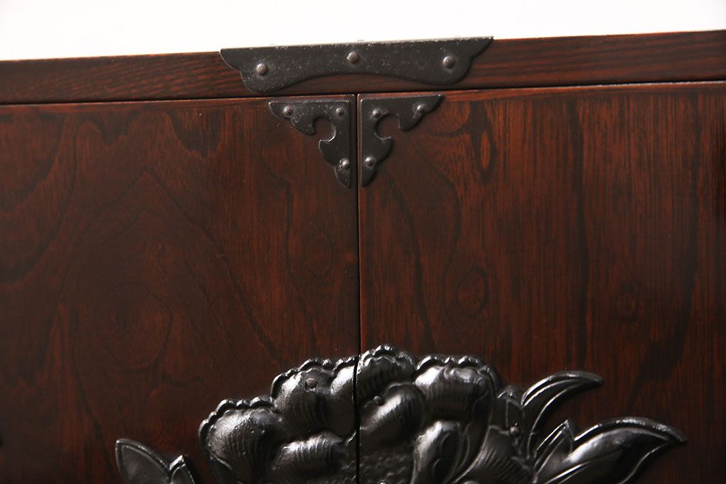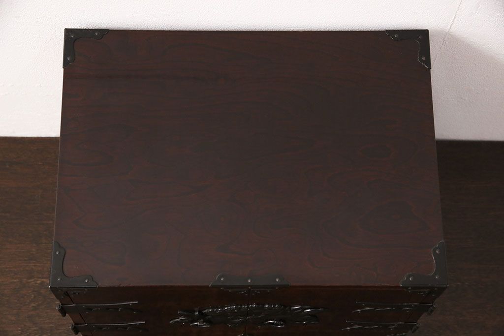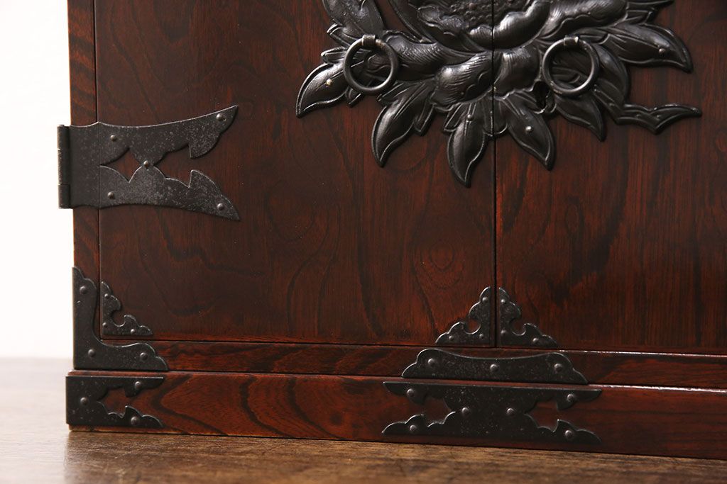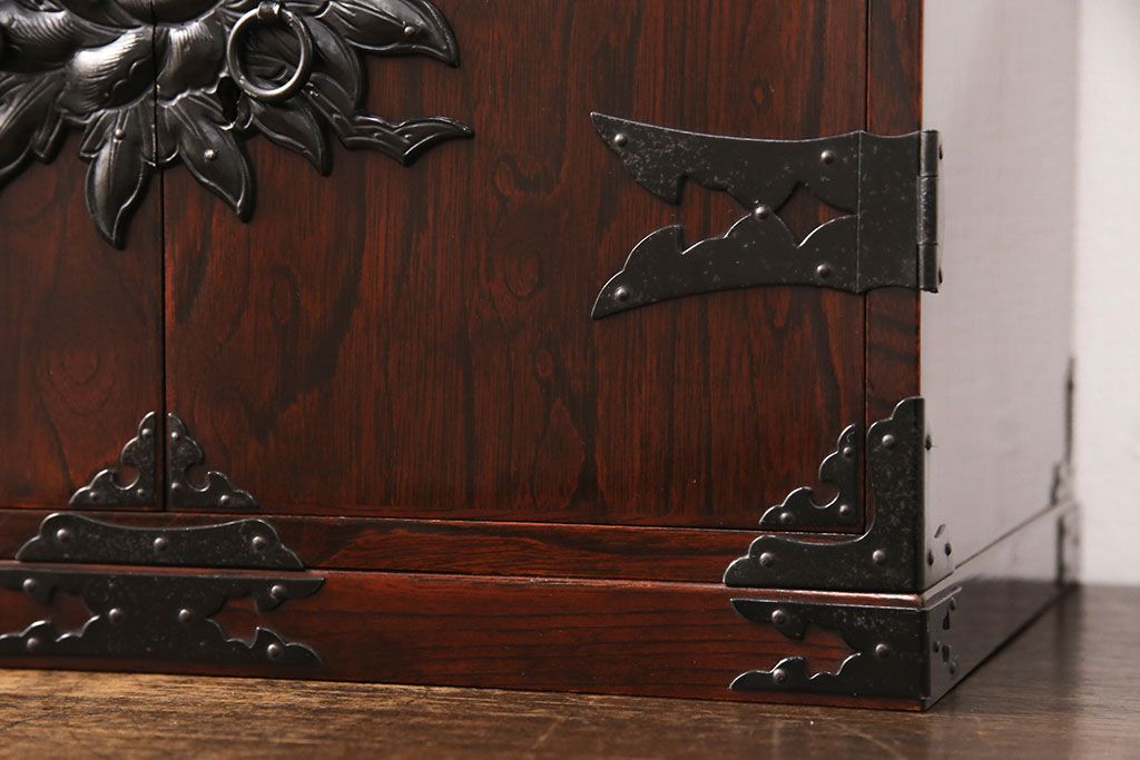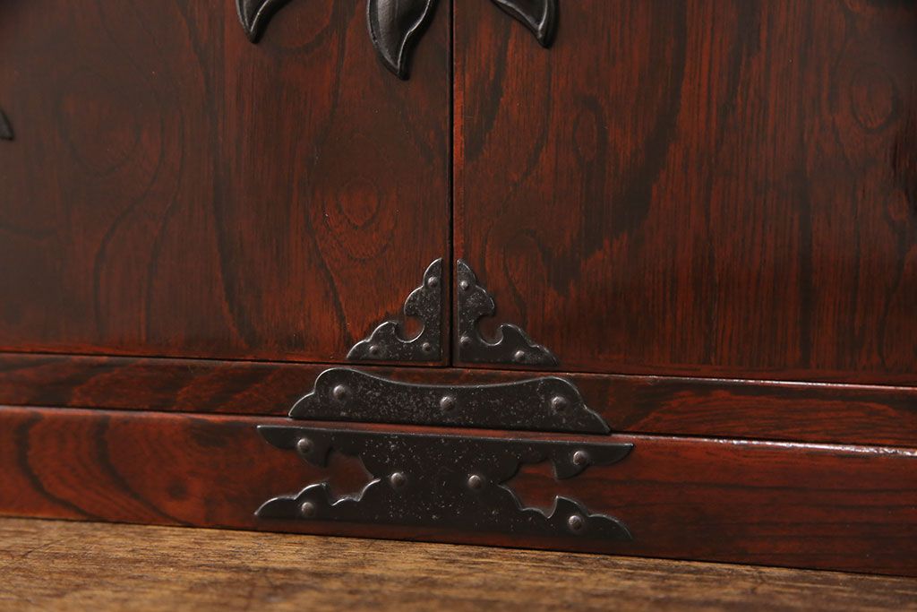 豪華な金具が目を惹く民芸家具の小箪笥です。