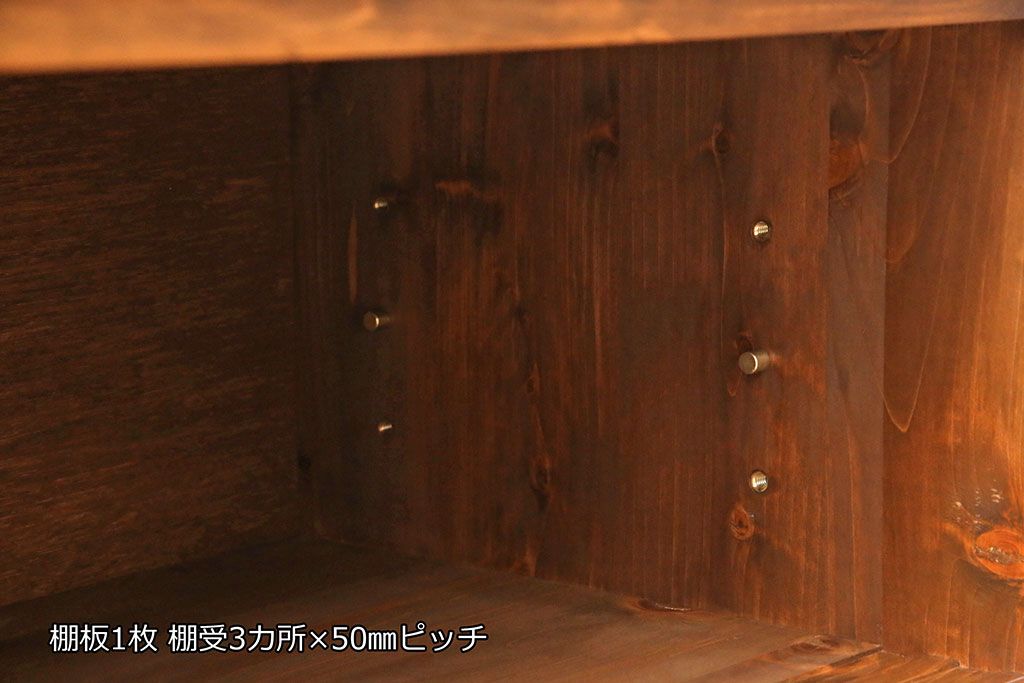 棚板は取り外しできます。棚板は1枚あります。棚受けは3ヶ所、50mmピッチで調整できます。棚幅サイズのものが1枚の作りです。