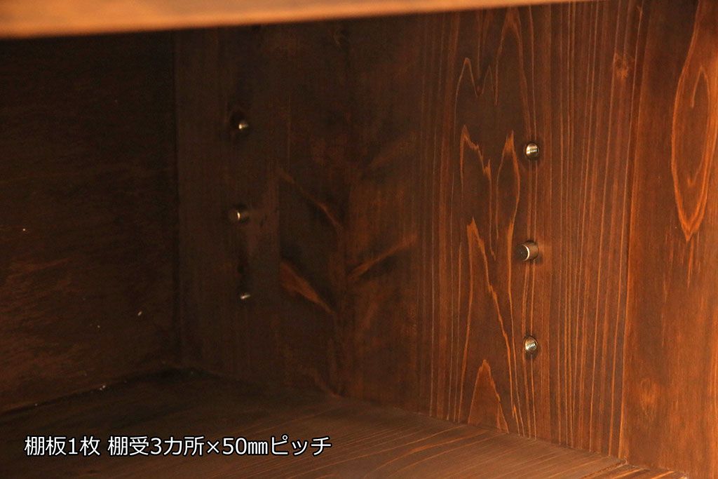 棚板は取り外しできます。棚板は1枚あります。棚受けは3ヶ所、50mmピッチで調整できます。棚幅サイズのものが1枚の作りです。