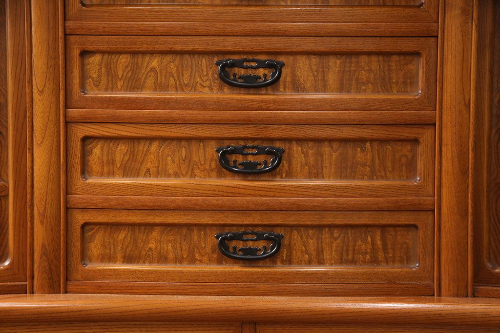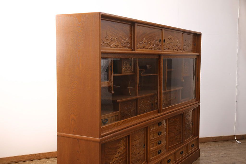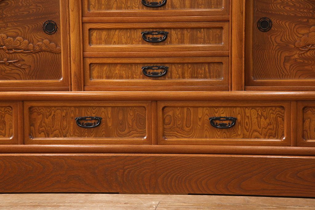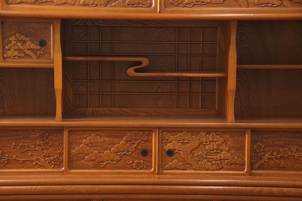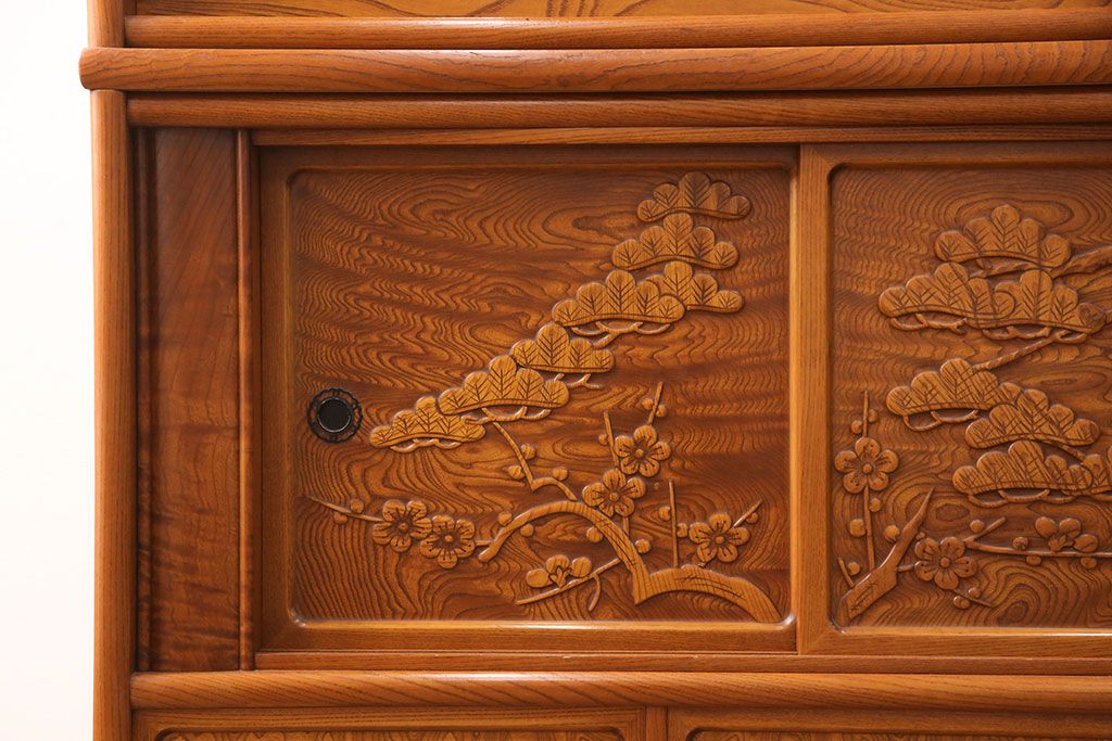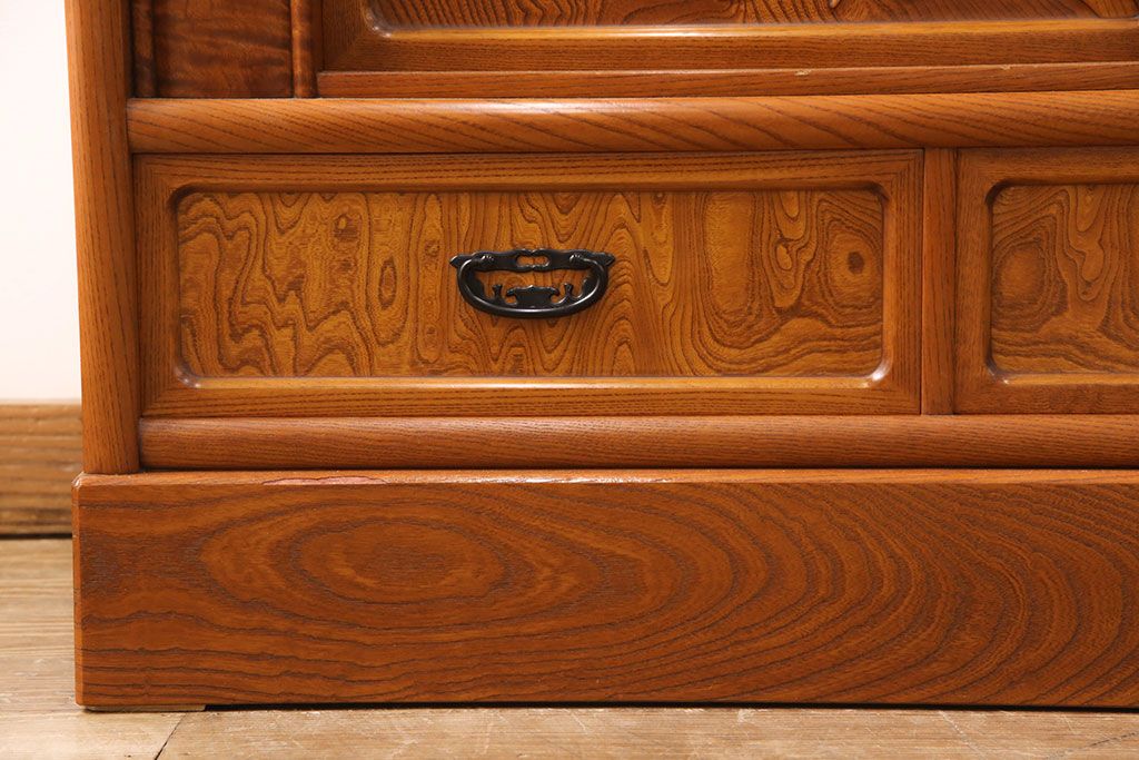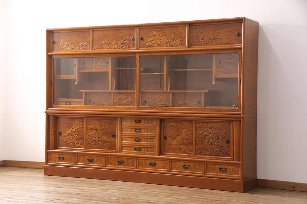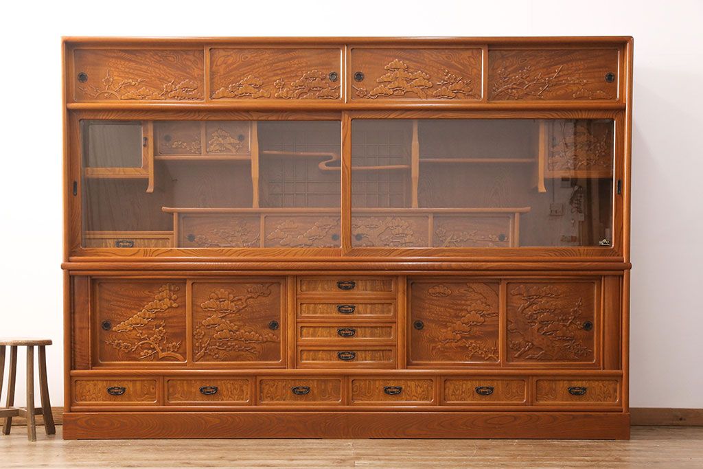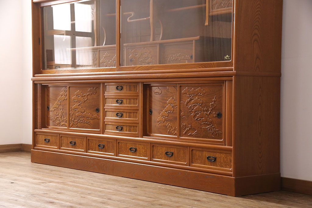 ラフジュ工房> 和箪笥> 茶箪笥・茶棚 > 中古 美品 前面ケヤキ材 なかなかお目にかかれない特大サイズの2段重ね茶箪笥(茶棚、食器棚、収納棚、キャビネット、戸棚)(定価約135万円)(R-051786)