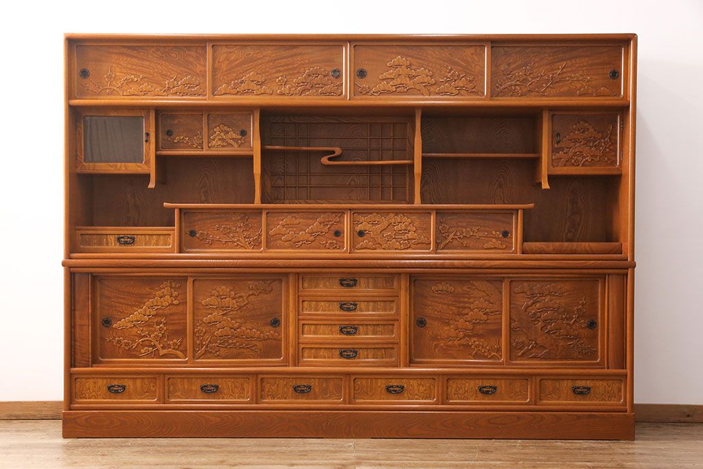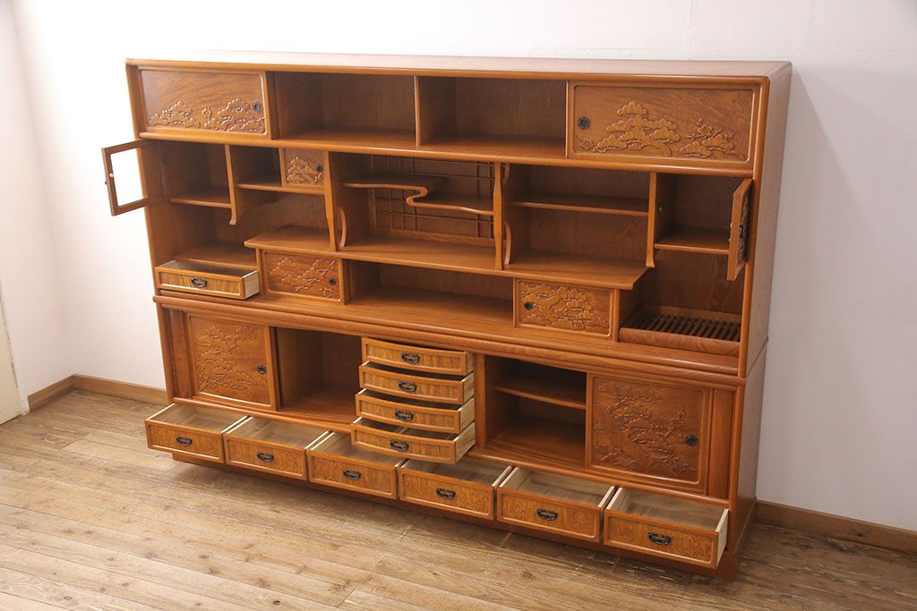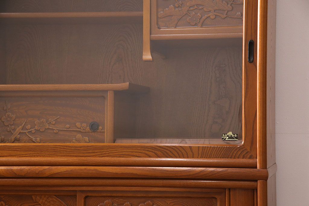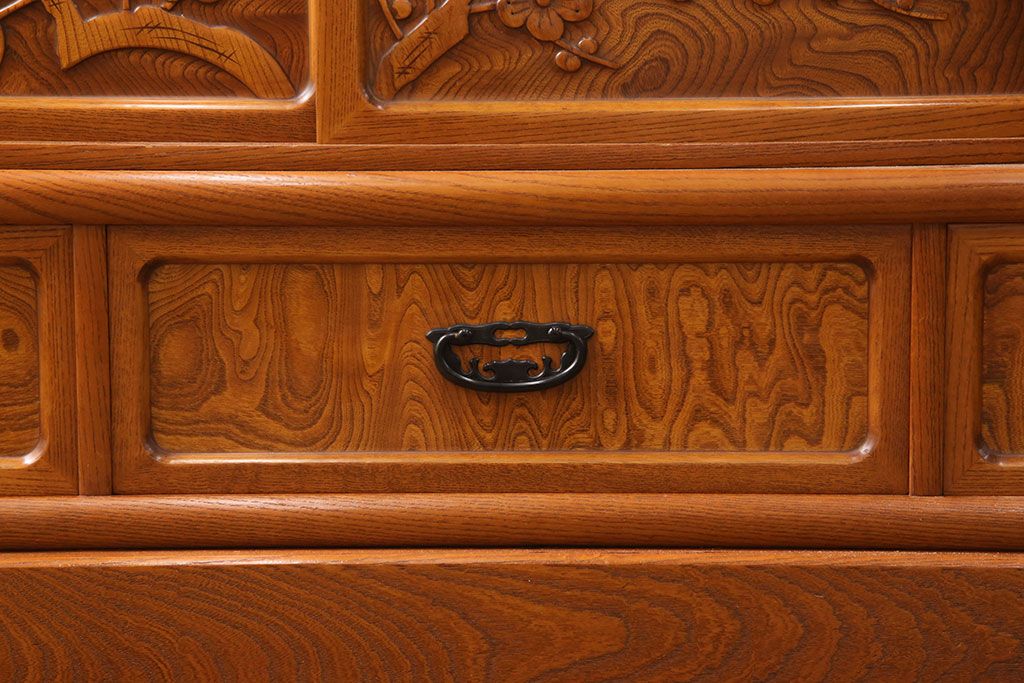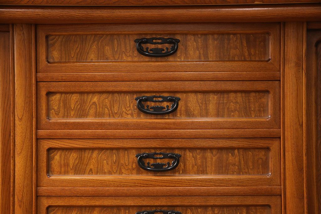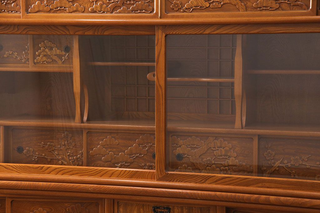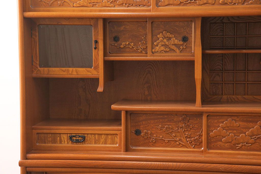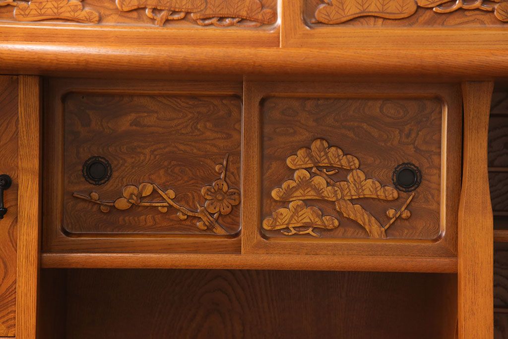 ラフジュ工房> 和箪笥> 茶箪笥・茶棚 > 中古 美品 前面ケヤキ材 なかなかお目にかかれない特大サイズの2段重ね茶箪笥(茶棚、食器棚、収納棚、キャビネット、戸棚)(定価約135万円)(R-051786)