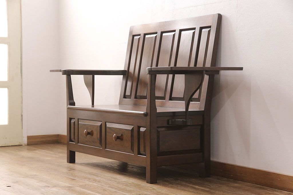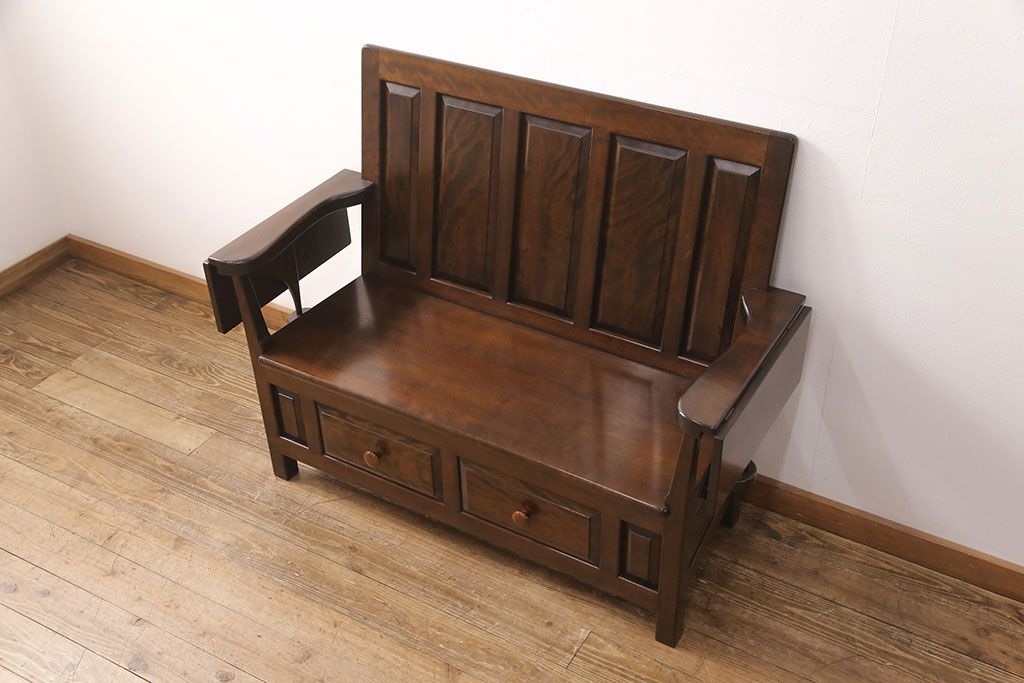 中古 美品 松本民芸家具 シックな大人の空間を演出する羽根付ベンチ(長椅子、二人掛けベンチ、板座)(R-051783)です。