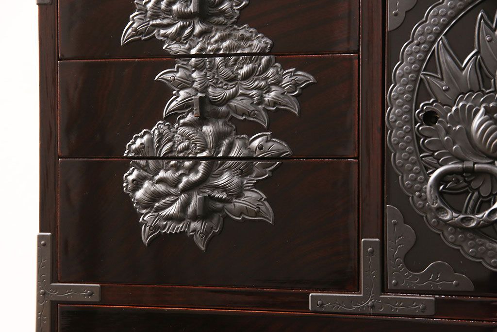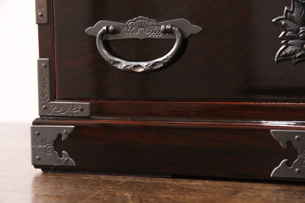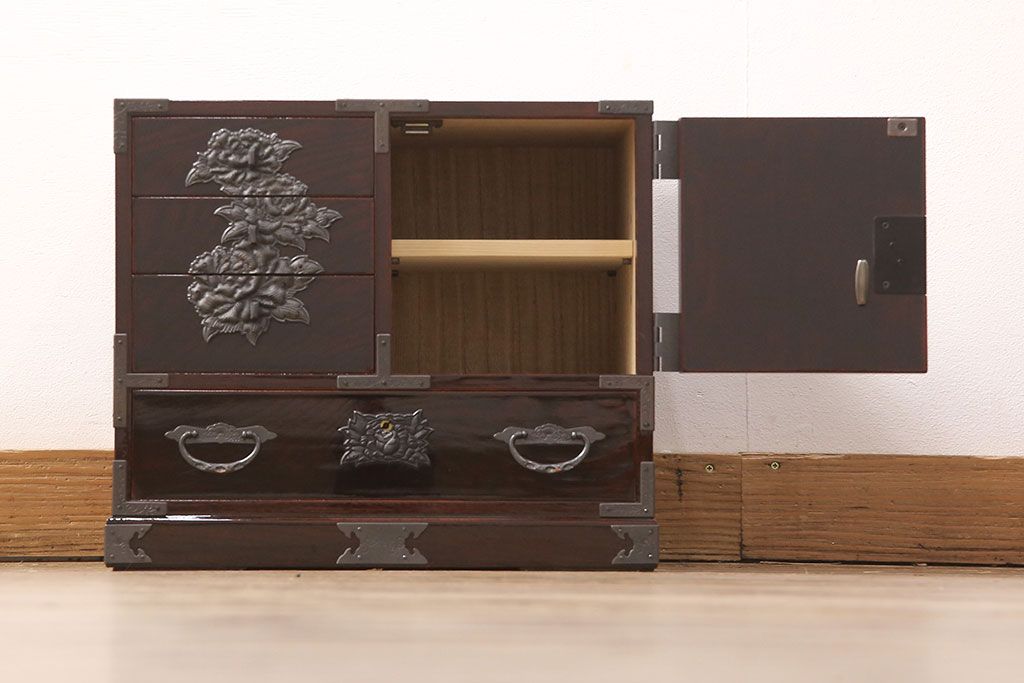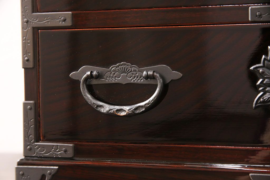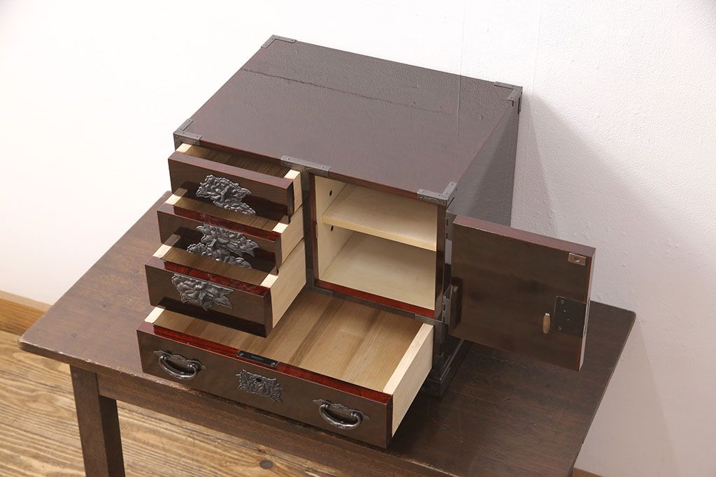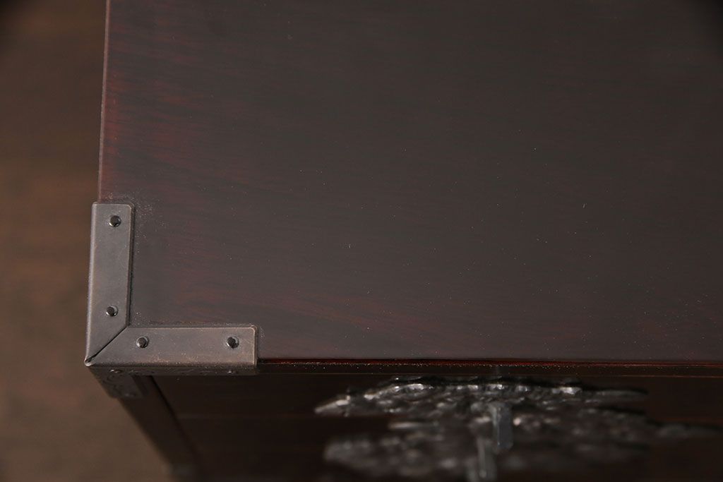 小物収納・トランク> 小引き出し > 中古 極美品 欅産業 KM-3D 木地呂漆塗り 迫力のある手打ち金具が目を引く仙台民芸小箪笥(片開小箪笥、小引き出し)(R-051800)