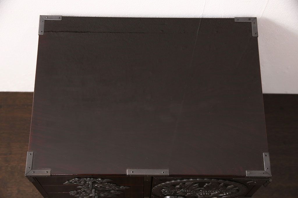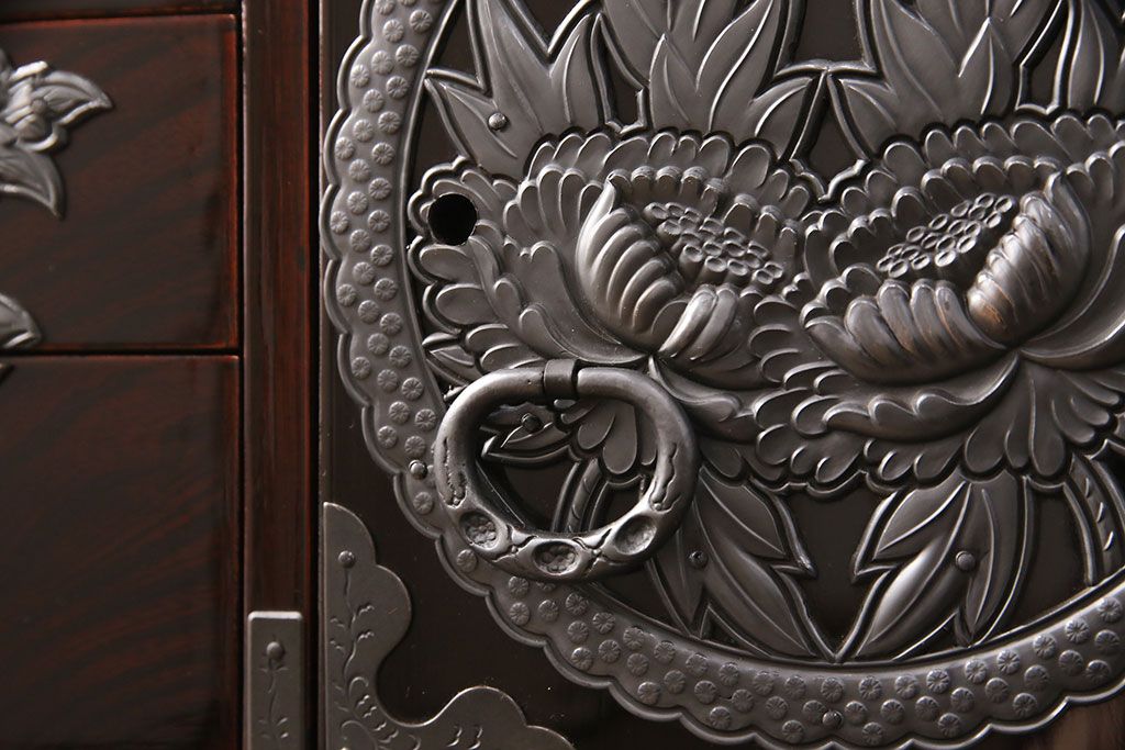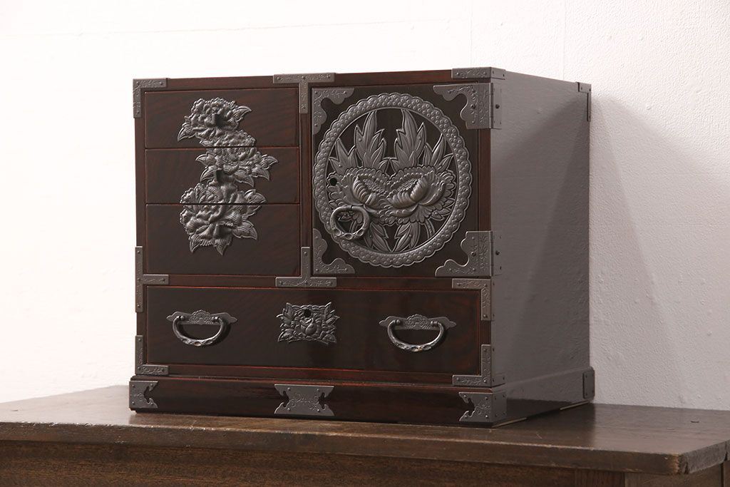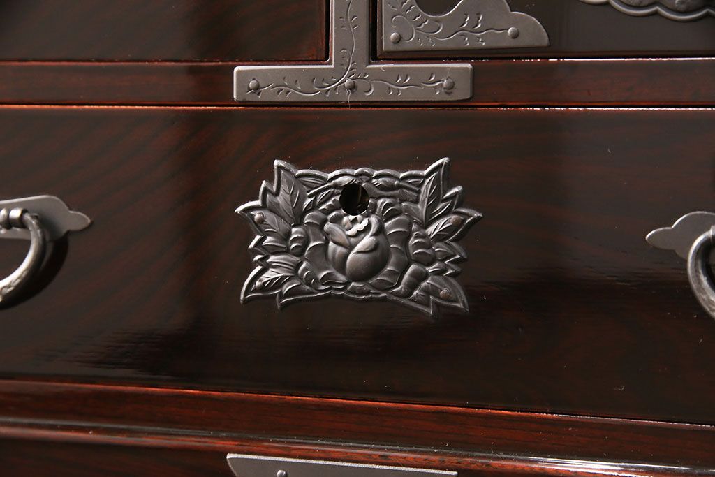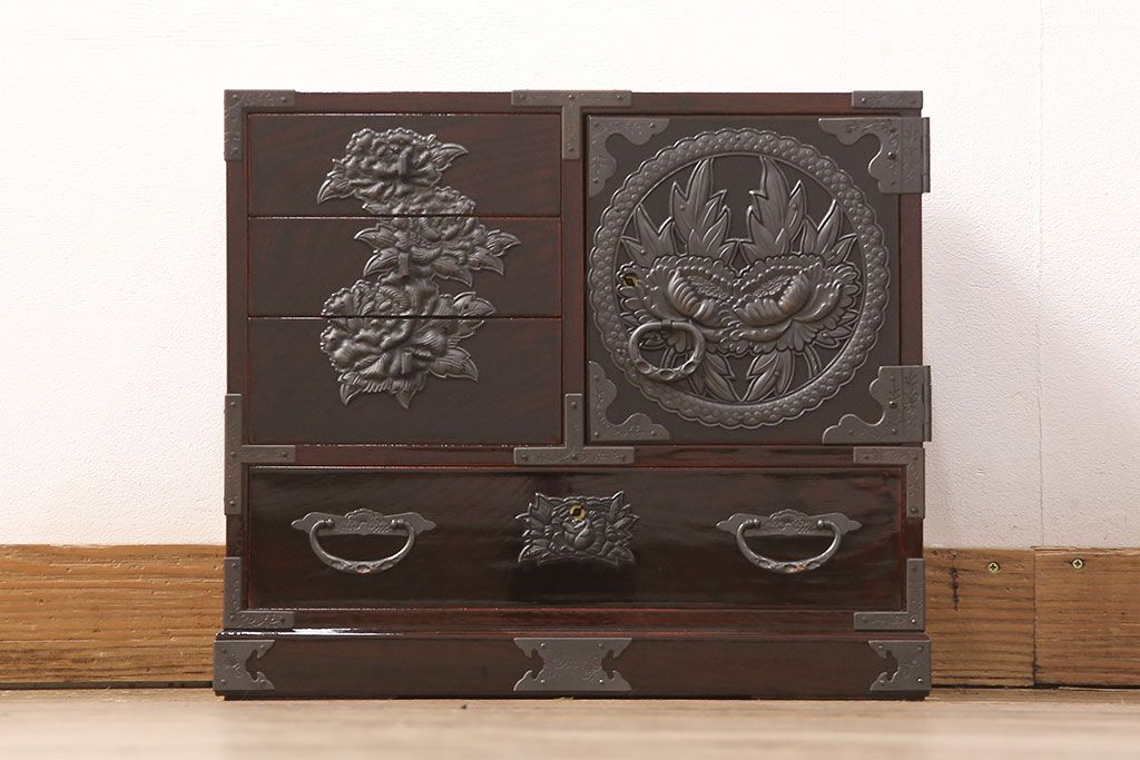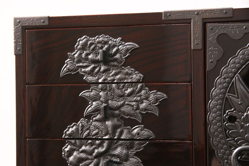 小物収納・トランク> 小引き出し > 中古 極美品 欅産業 KM-3D 木地呂漆塗り 迫力のある手打ち金具が目を引く仙台民芸小箪笥(片開小箪笥、小引き出し)(R-051800)