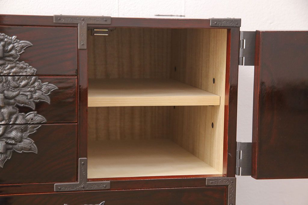 中古 極美品 欅産業 KM-3D 木地呂漆塗り 迫力のある手打ち金具が目を引く仙台民芸小箪笥(片開小箪笥、小引き出し)(R-051800)