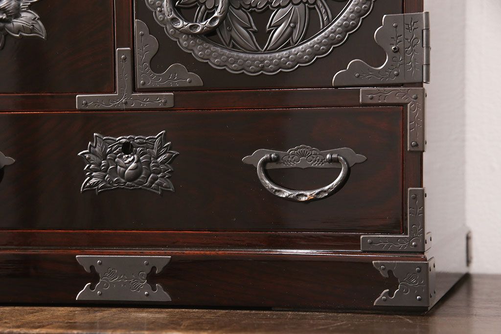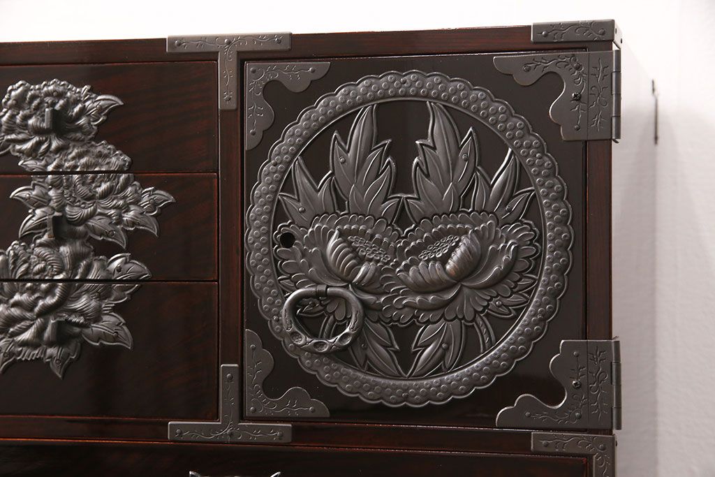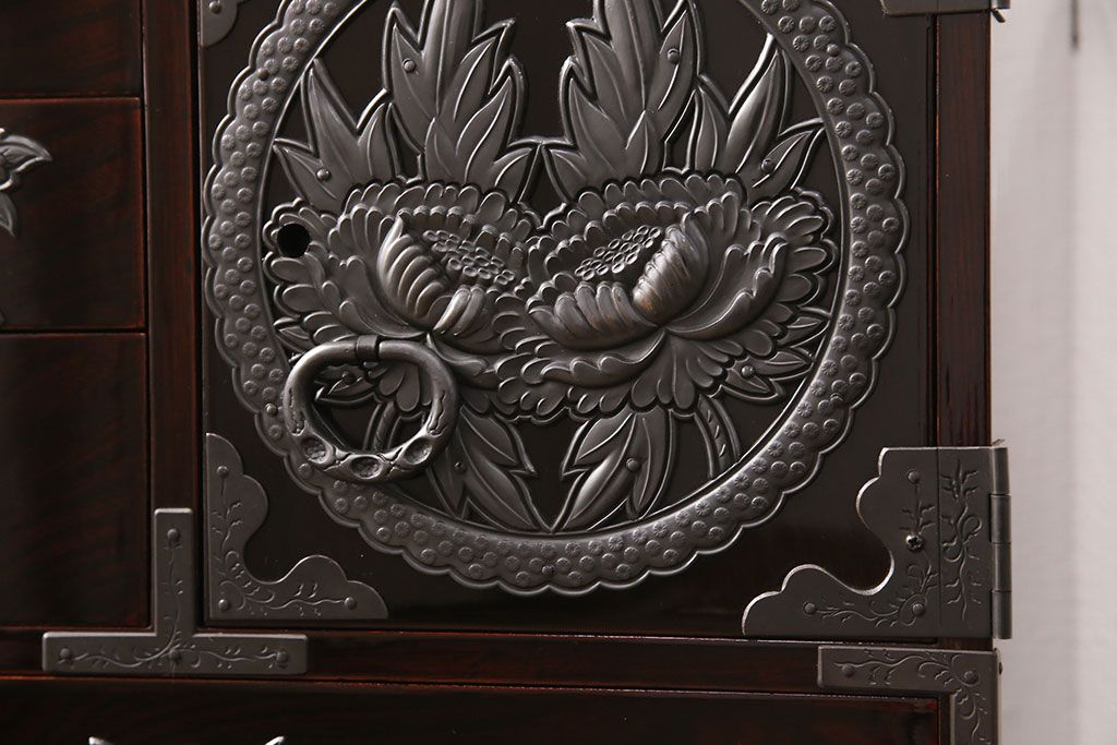 民芸家具 > 中古 極美品 欅産業 KM-3D 木地呂漆塗り 迫力のある手打ち金具が目を引く仙台民芸小箪笥(片開小箪笥、小引き出し)(R-051800)