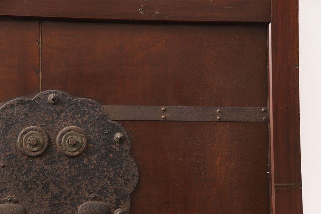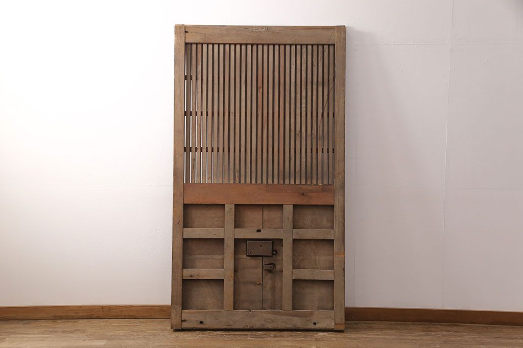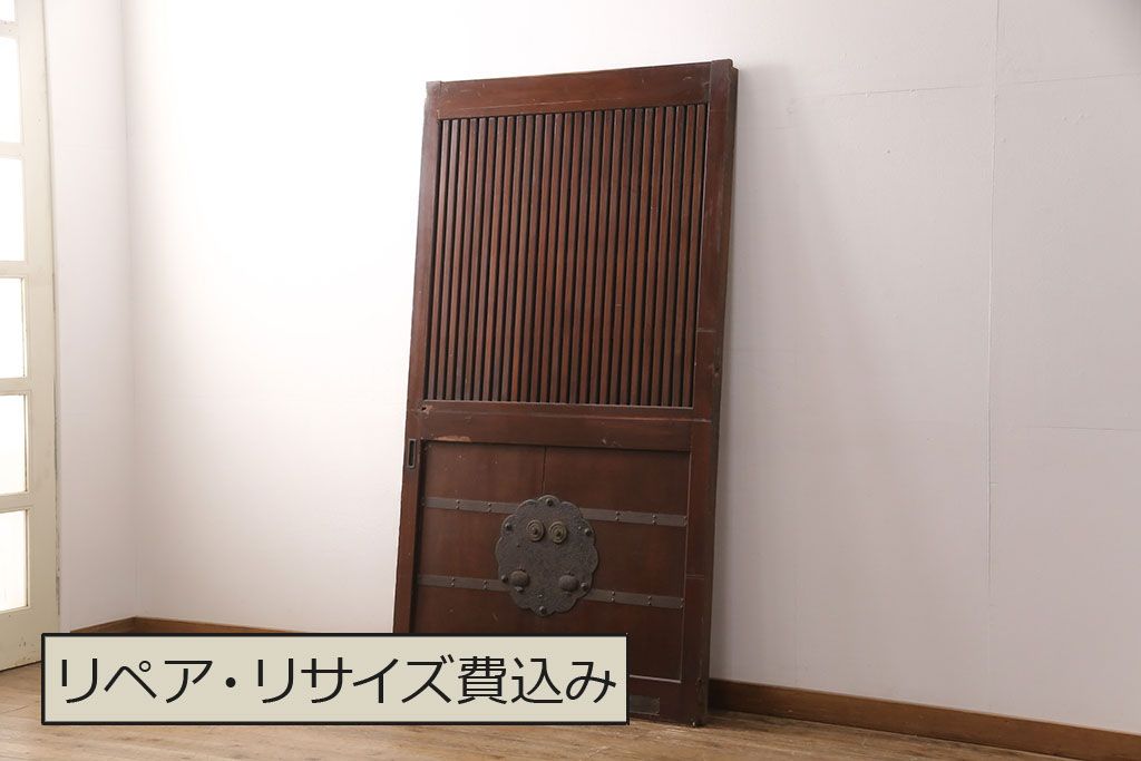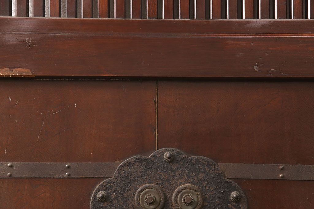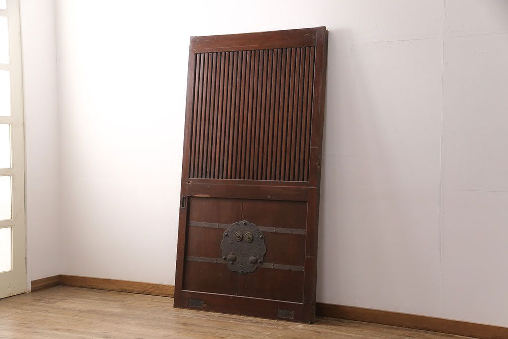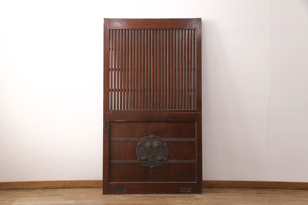 アンティーク建具 ヒノキ材・腰板ケヤキ材 玉杢 赤みがかった木肌と品のある金具が魅力の格子蔵戸1枚(玄関戸、玄関ドア、引き戸)(R-051731)