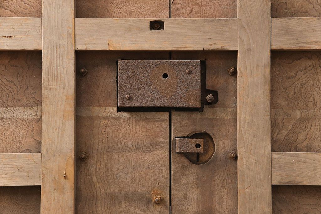 ラフジュ工房> ドア・建具> 蔵戸 > アンティーク建具 ヒノキ材・腰板ケヤキ材 玉杢 赤みがかった木肌と品のある金具が魅力の格子蔵戸1枚(玄関戸、玄関ドア、引き戸)(R-051731)