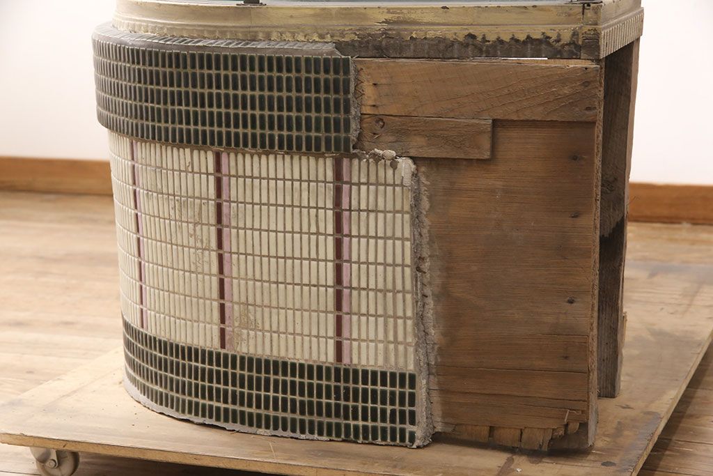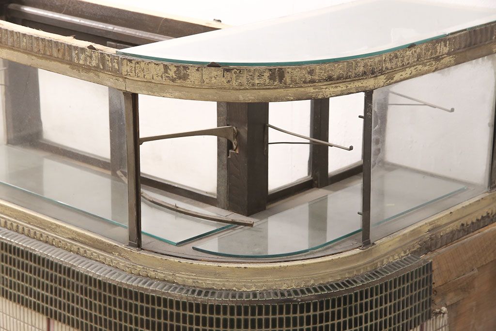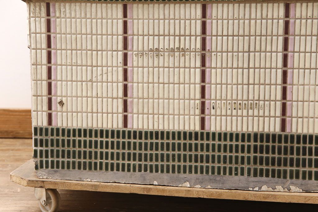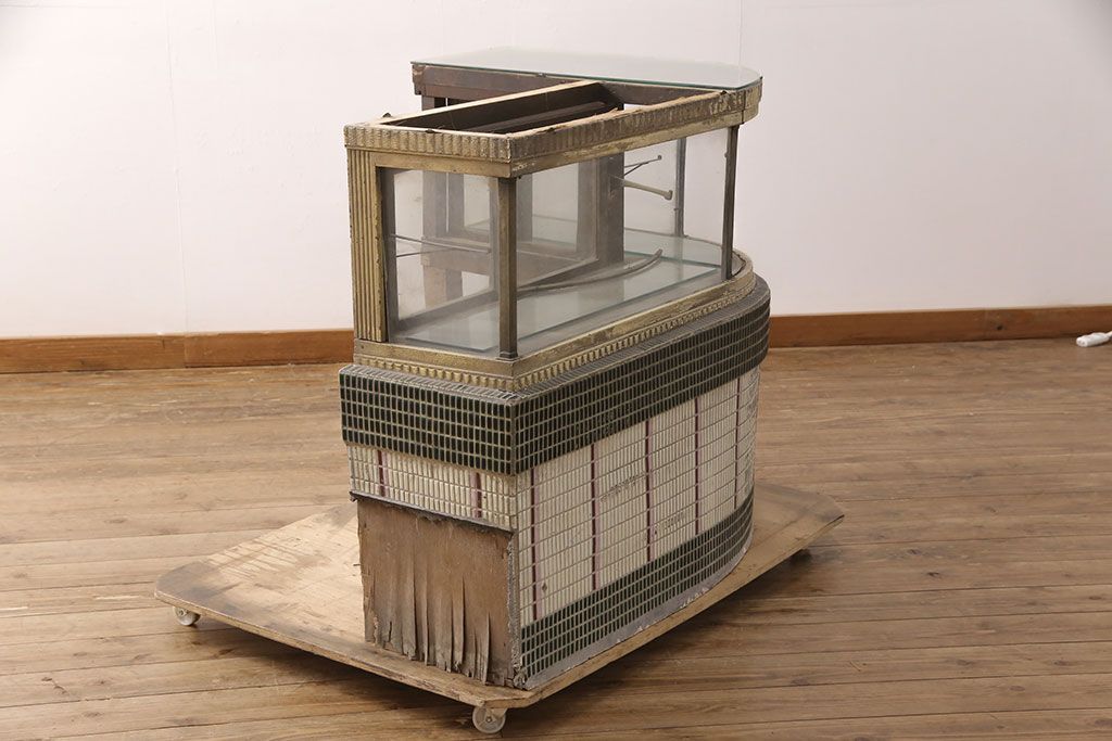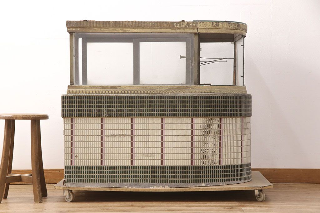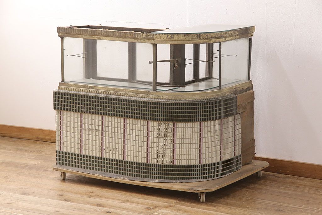 ラフジュ工房> 店舗什器 > 和製アンティーク Rガラス タイル張りが魅力!レトロな空間づくりに活躍するガラスケース(ショーケース、陳列棚、店舗什器、曲げガラス、L型ガラスケース)(R-051727)