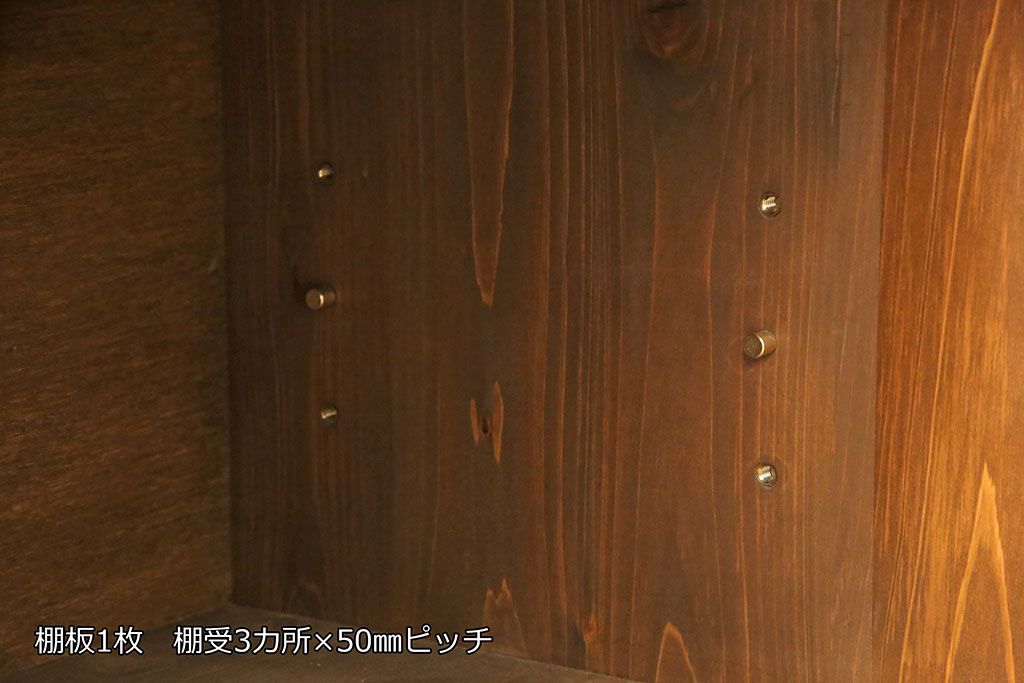 棚板は取り外しできます。棚板は1枚あります。棚受けは3ヶ所、50mmピッチで調整できます。棚幅サイズのものが1枚の作りです。