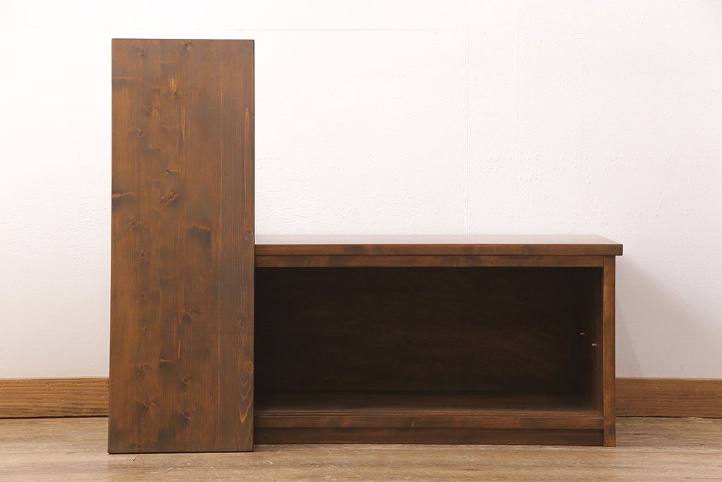 棚板は取り外しできます。棚板は1枚あります。棚受けは3ヶ所、50mmピッチで調整できます。棚幅サイズのものが1枚の作りです。