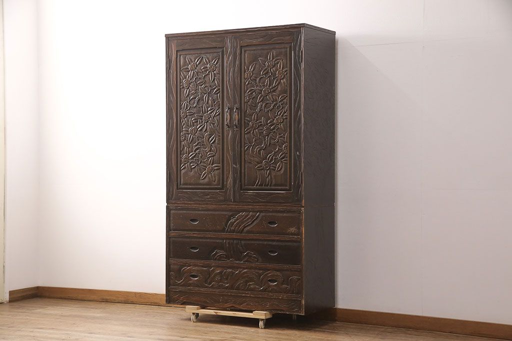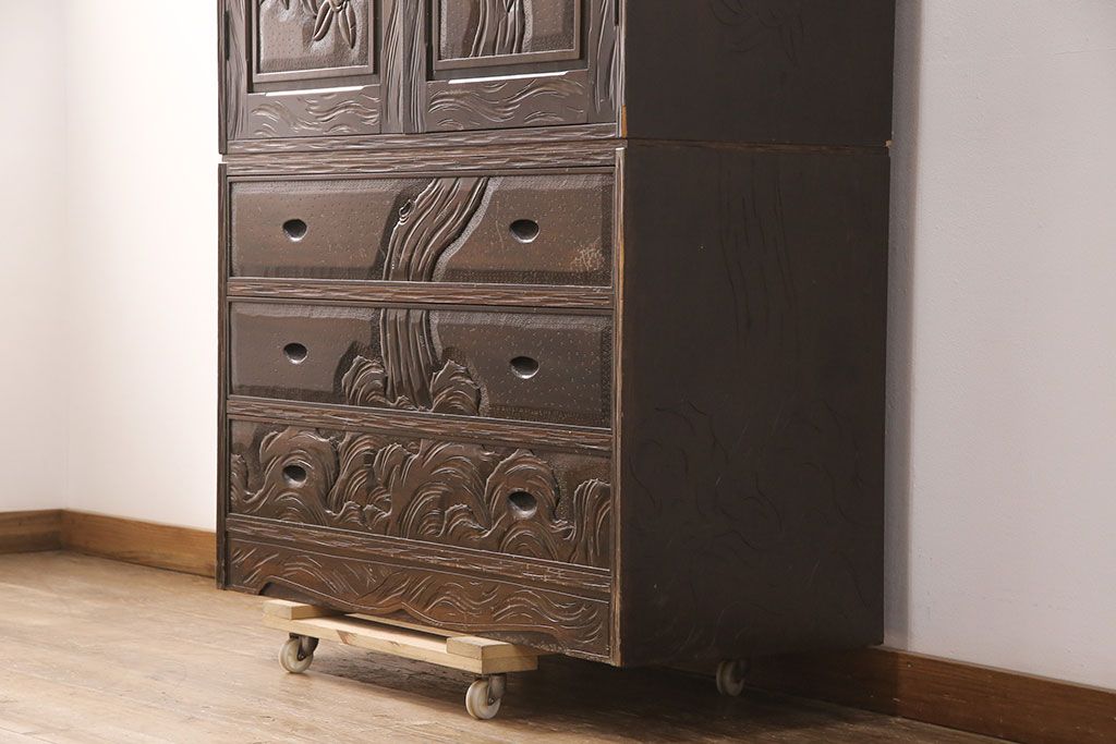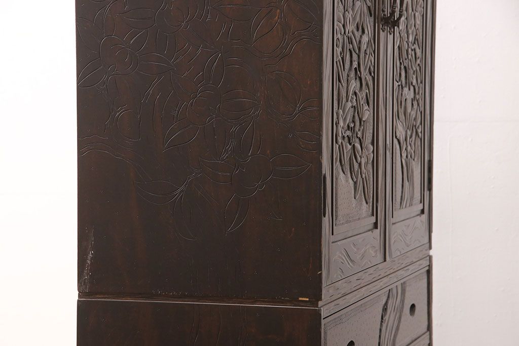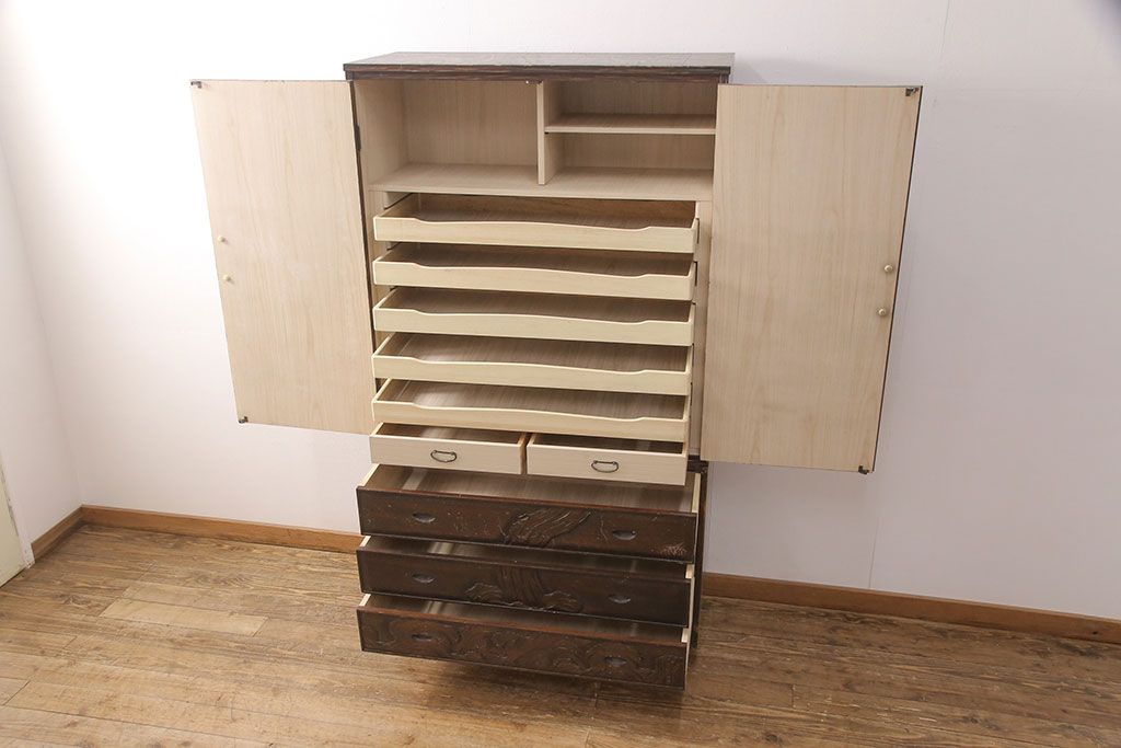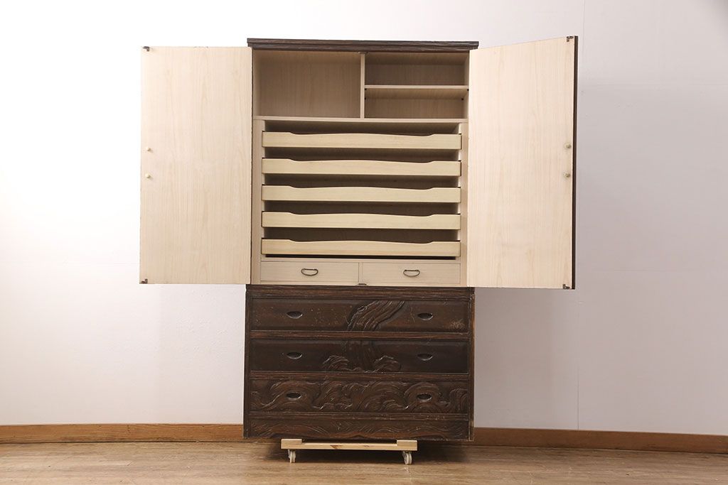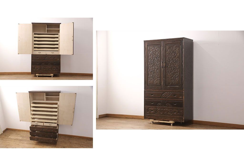 和箪笥> 衣装箪笥 > 中古 伝統工芸 軽井沢彫り 図柄が珍しい!! 細やかな彫刻の意匠に目を奪われる衣装盆付きの和箪笥(和タンス、チェスト、着物箪笥、収納箪笥)(R-051567)