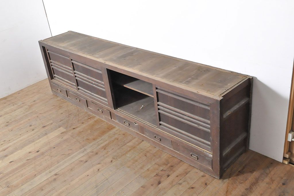 和製アンティーク 前面ヒノキ材 特大サイズ!九尺収納箪笥キャビネット(水屋箪笥、食器棚、収納棚、サイドボード)(R-051517)