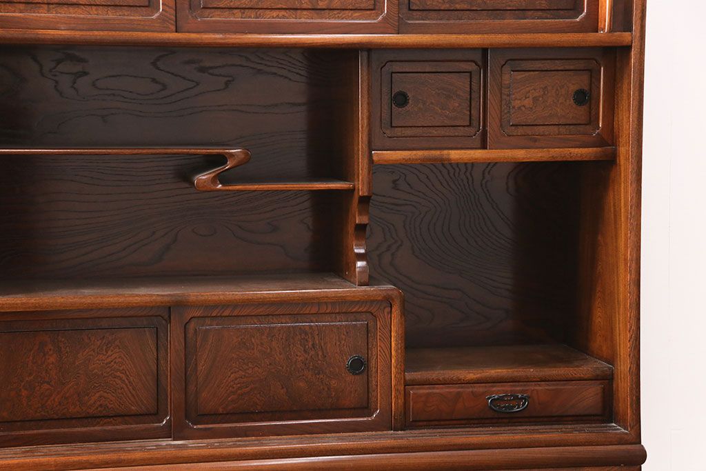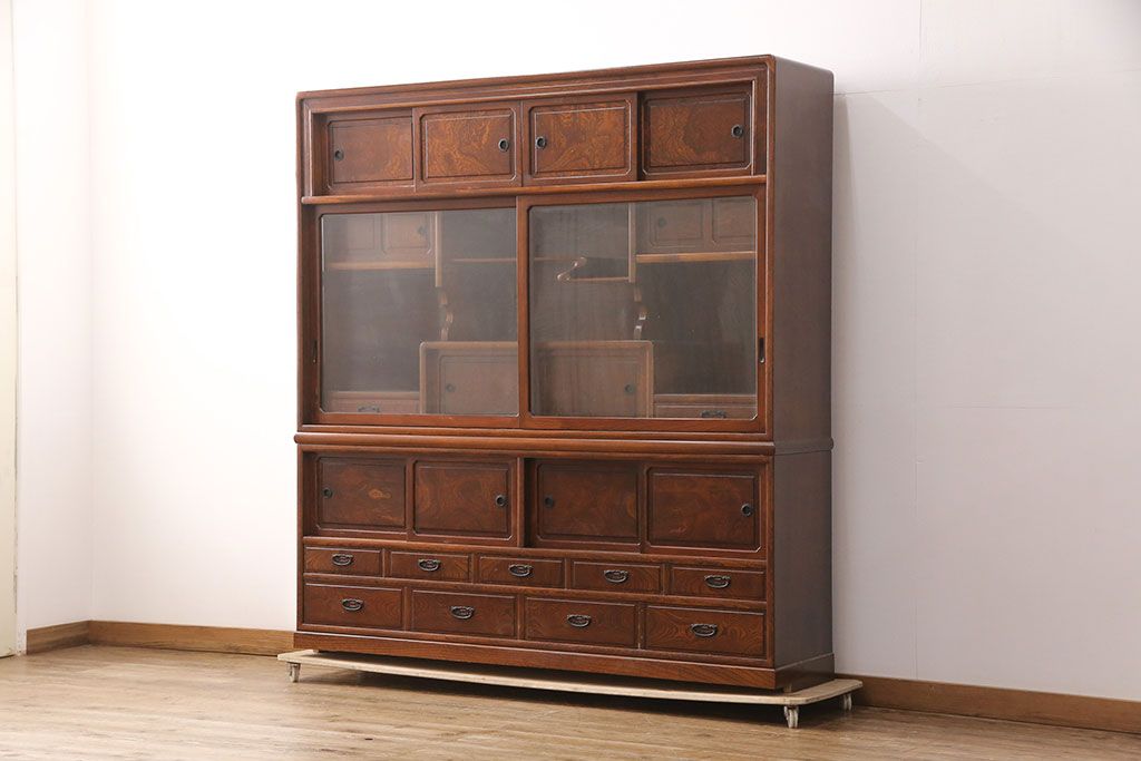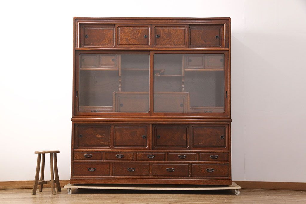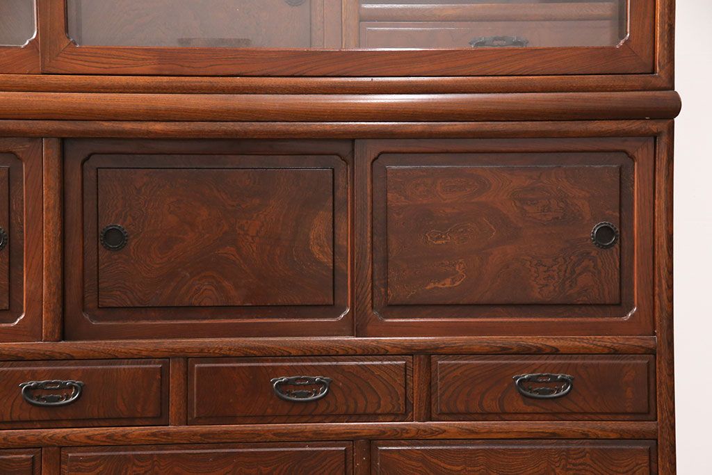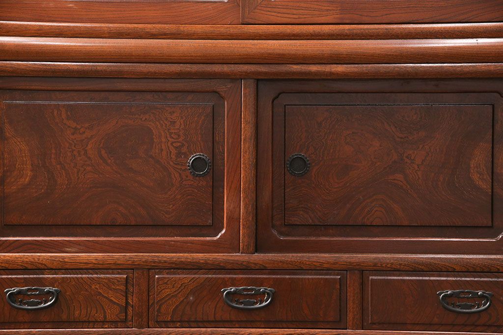 中古 極上品 総漆塗り 前面ケヤキ無垢材 玉杢 最高級品の二段重ね大型茶箪笥(茶棚、飾り棚、収納棚、キャビネット)(定価約250万円)(R-051772)