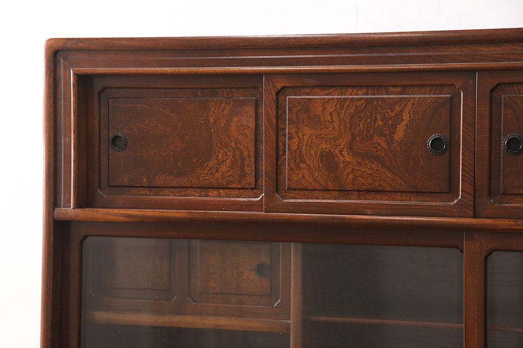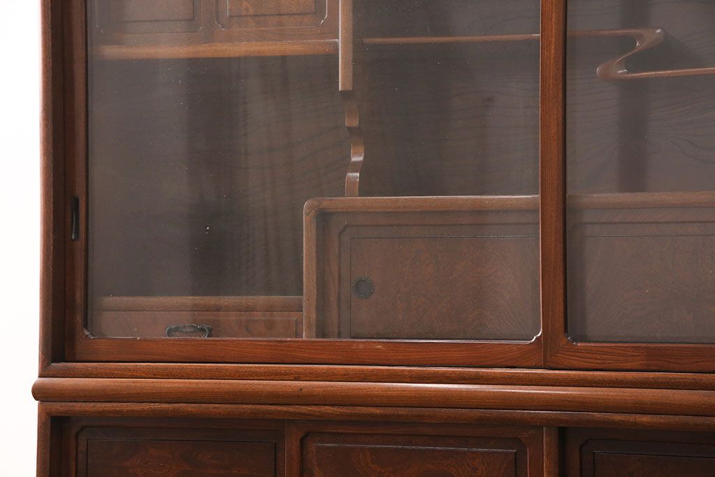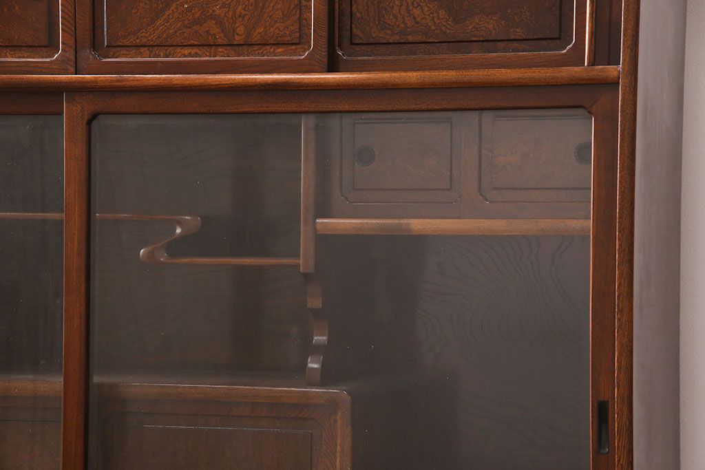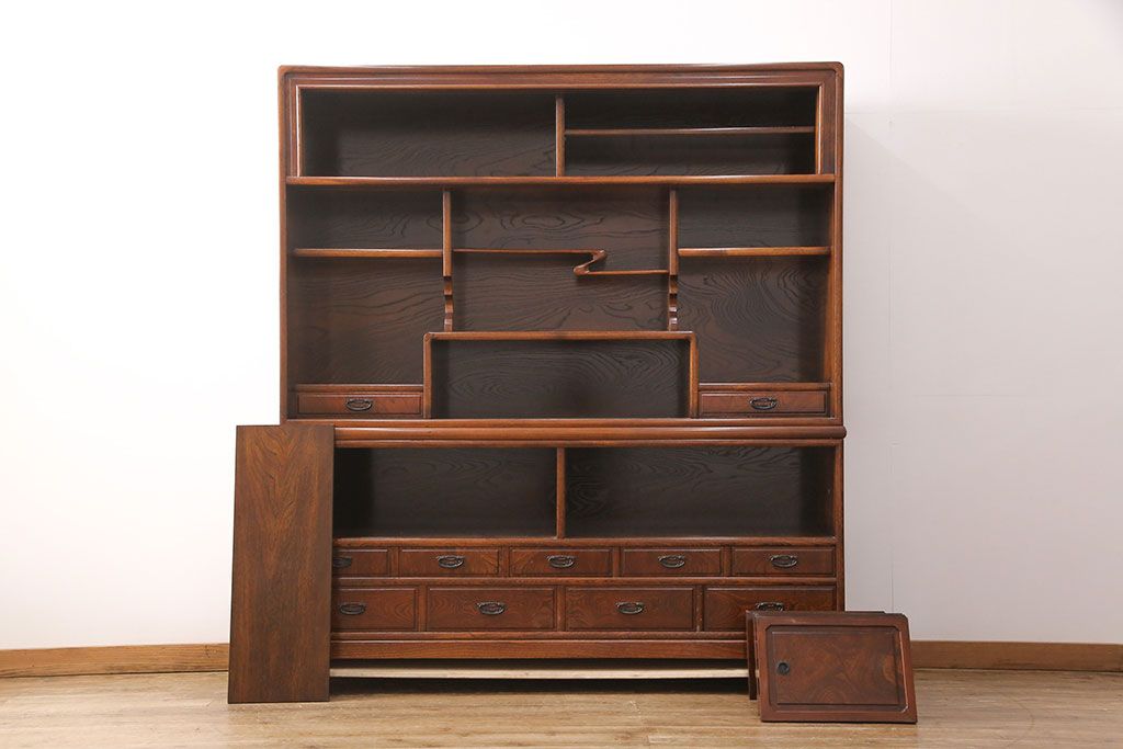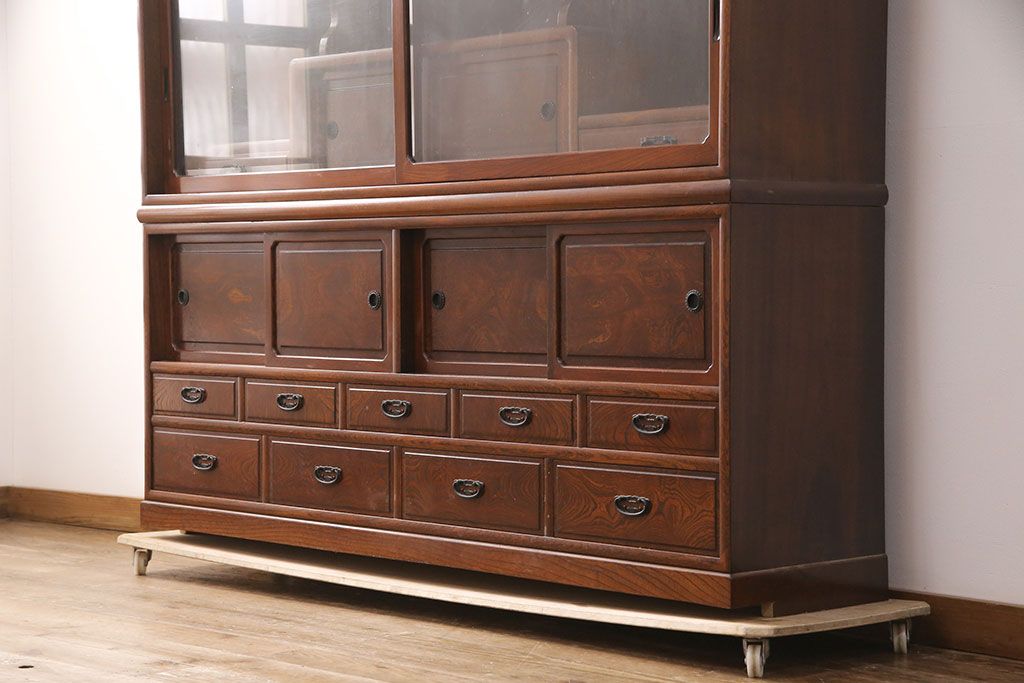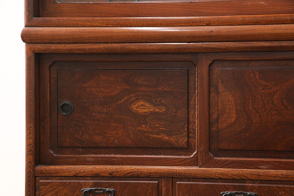 中古 極上品 総漆塗り 前面ケヤキ無垢材 玉杢 最高級品の二段重ね大型茶箪笥(茶棚、飾り棚、収納棚、キャビネット)(定価約250万円)(R-051772)