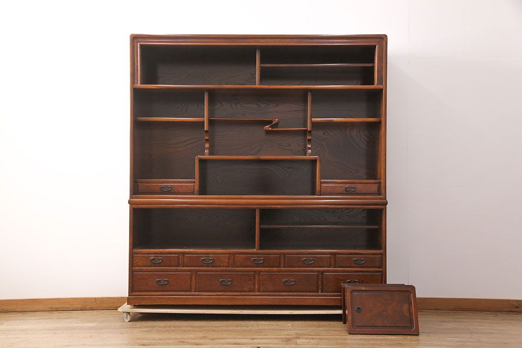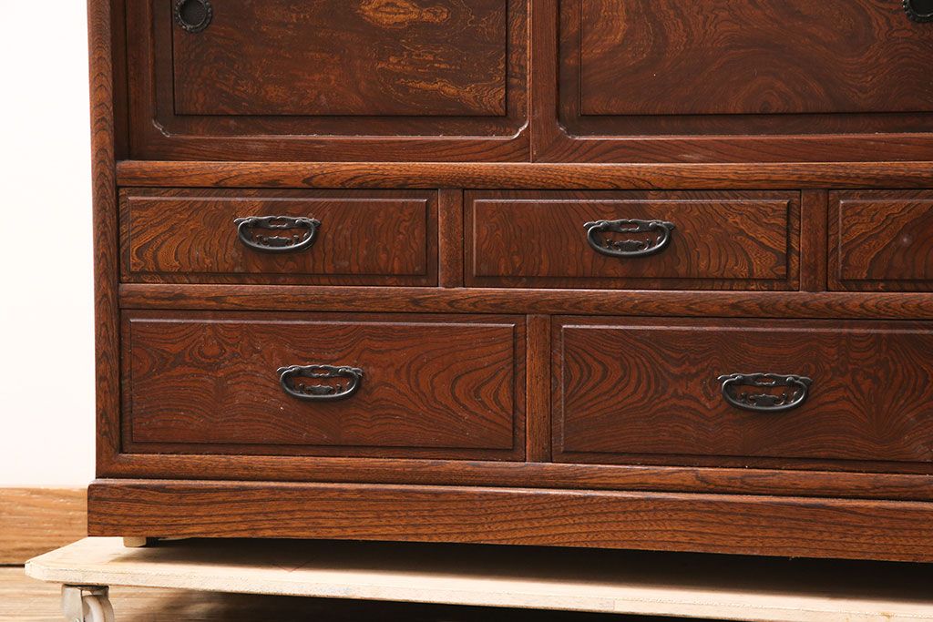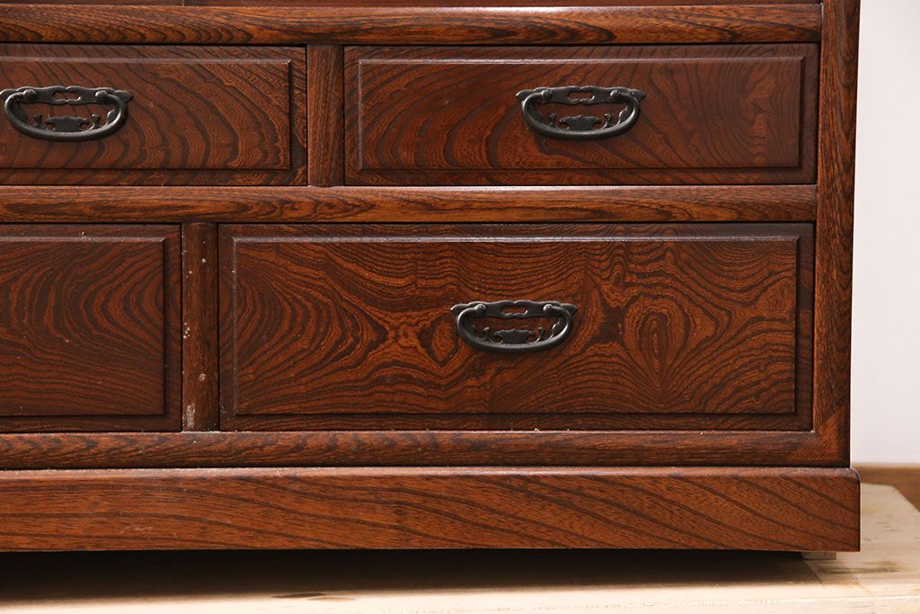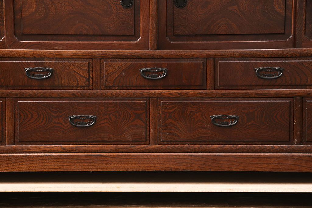 中古 極上品 総漆塗り 前面ケヤキ無垢材 玉杢 最高級品の二段重ね大型茶箪笥(茶棚、飾り棚、収納棚、キャビネット)(定価約250万円)(R-051772)です。