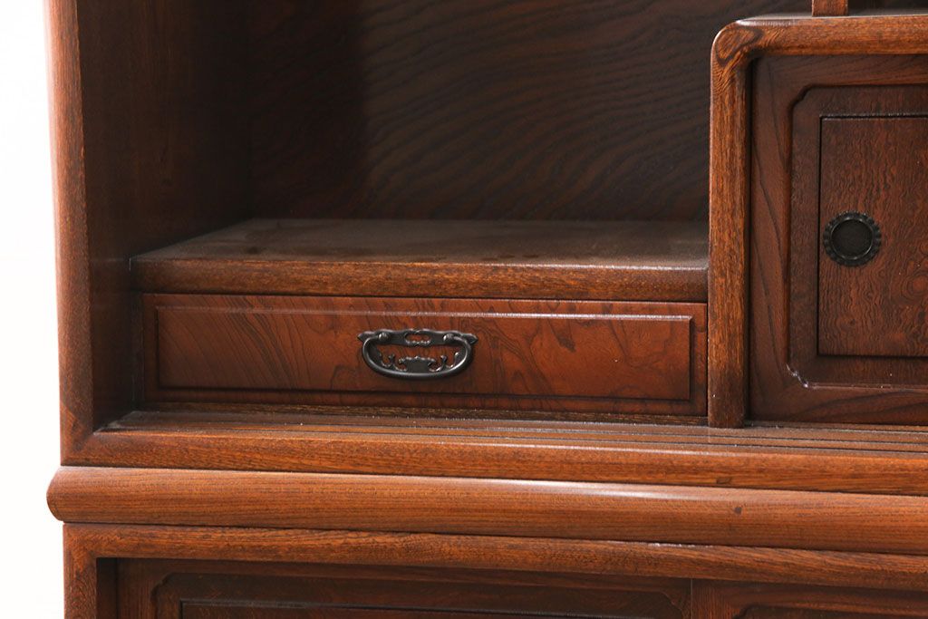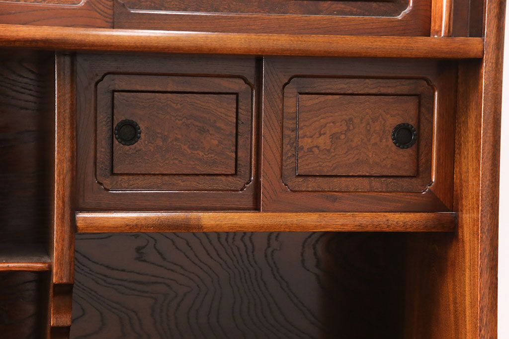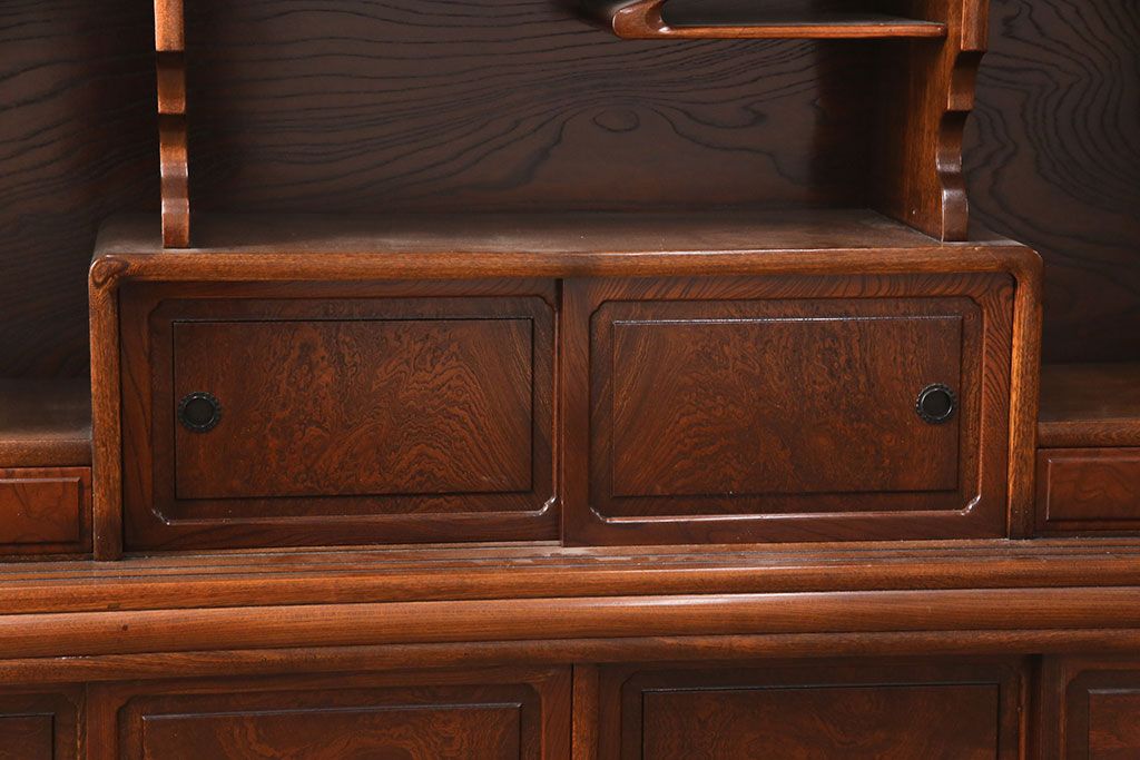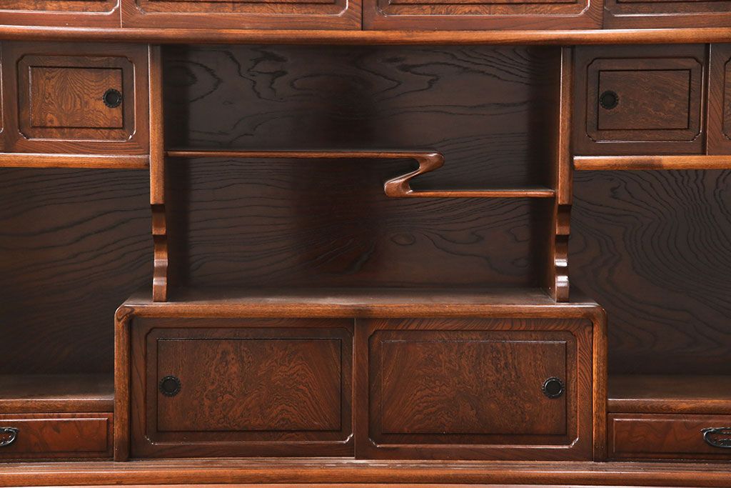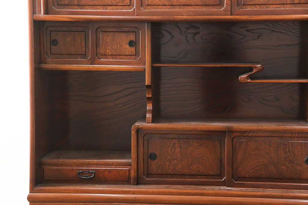 和箪笥> 茶箪笥・茶棚 > 中古 極上品 総漆塗り 前面ケヤキ無垢材 玉杢 最高級品の二段重ね大型茶箪笥(茶棚、飾り棚、収納棚、キャビネット)(定価約250万円)(R-051772)