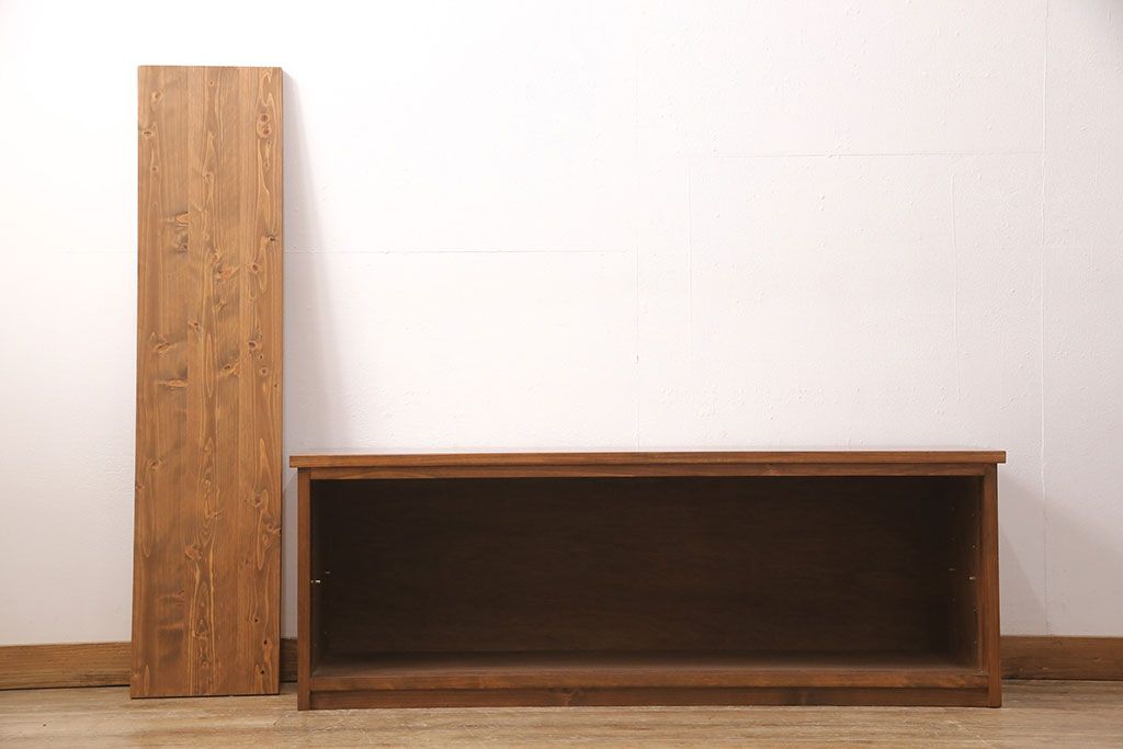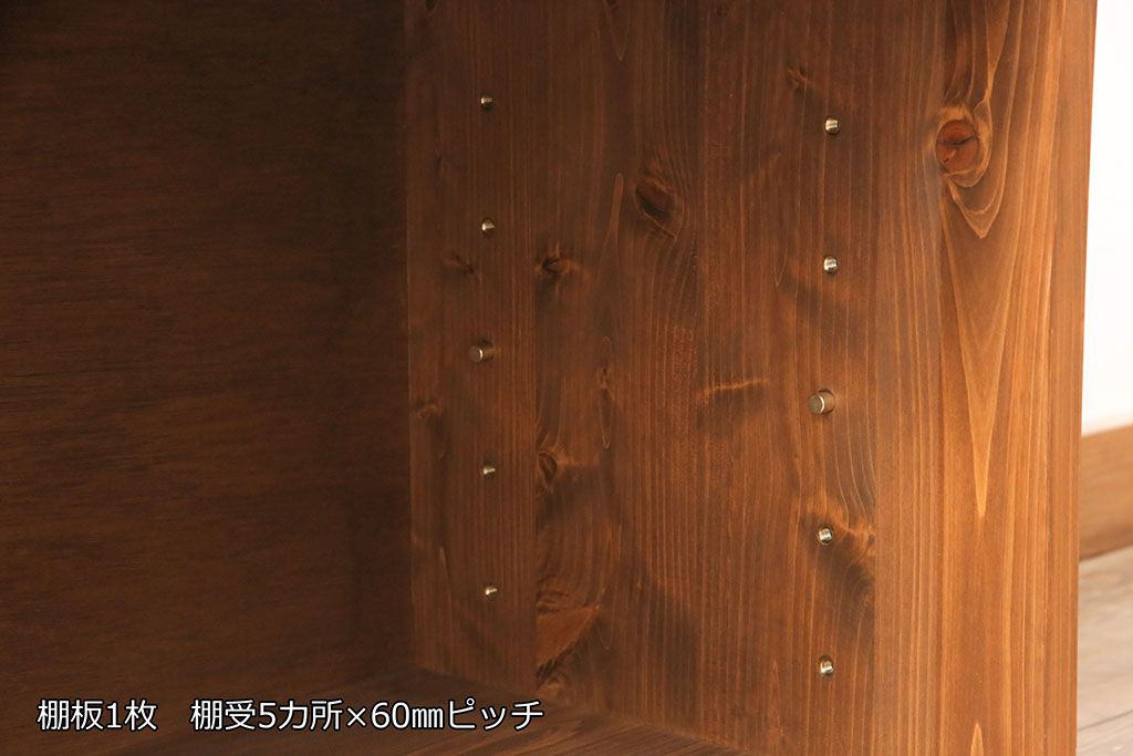 棚板は取り外しできます。棚板は1枚あります。棚受けは5ヶ所、60mmピッチで調整できます。棚幅サイズのものが1枚の作りです。