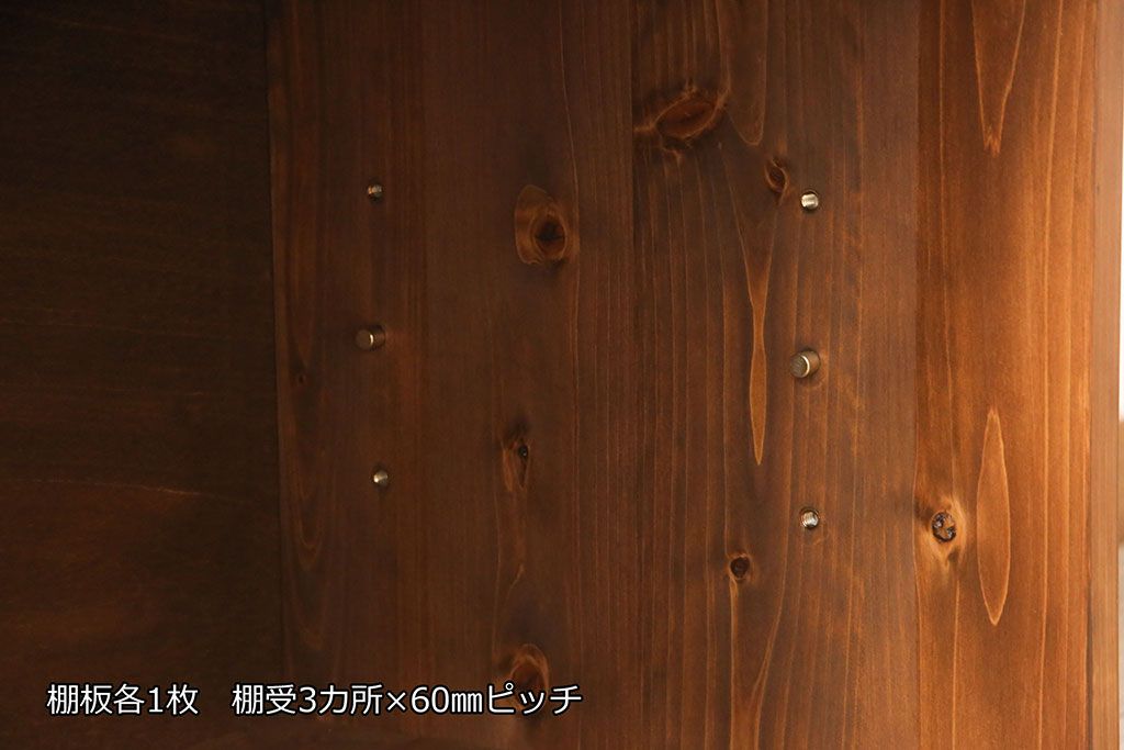 棚板は取り外しできます。棚板は各1枚あります。棚受けは3ヶ所、60mmピッチで調整できます。棚幅サイズのものが1枚の作りです。
