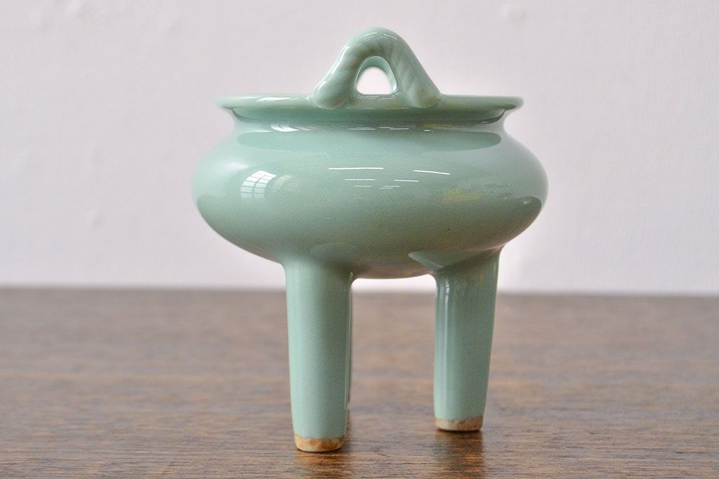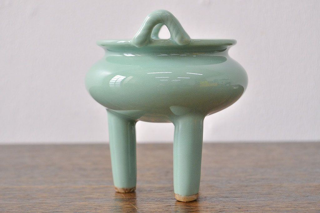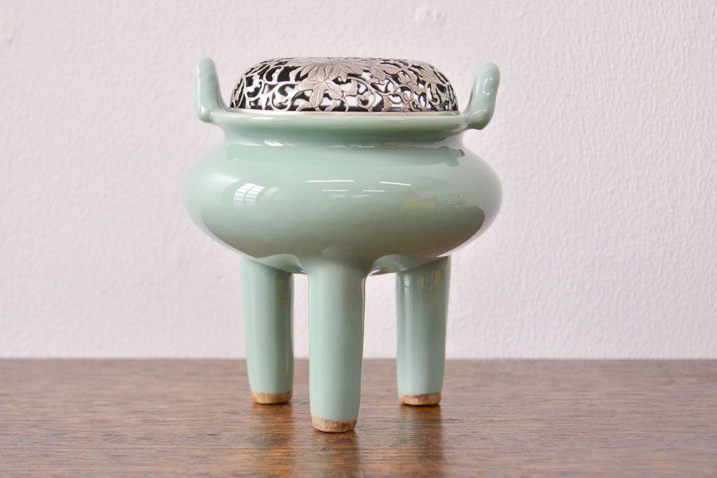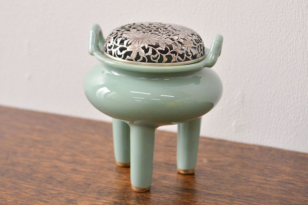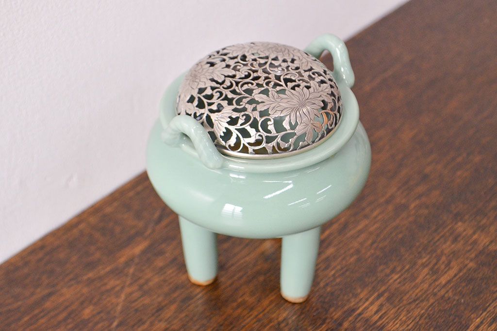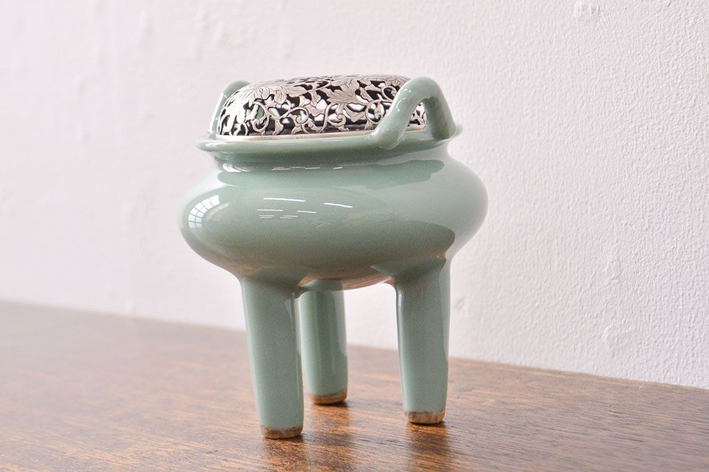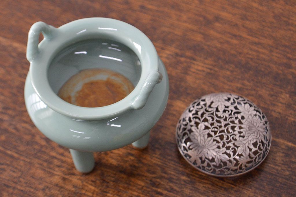 古い 青磁三足香炉 純銀火屋(中国?)(R-051912)