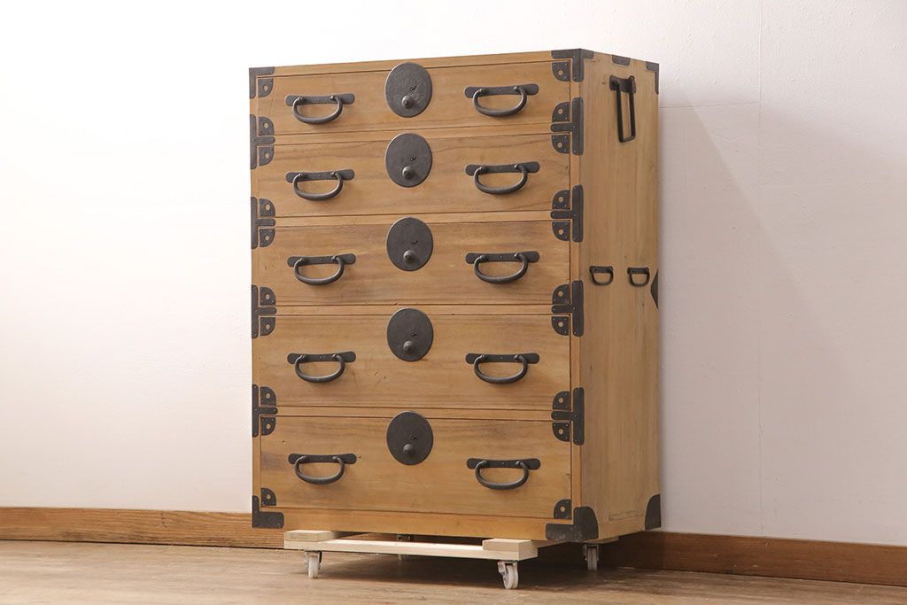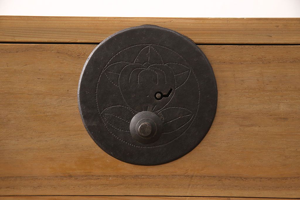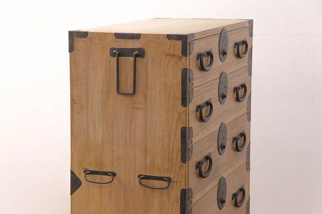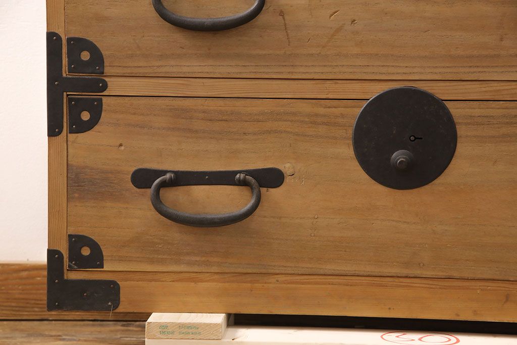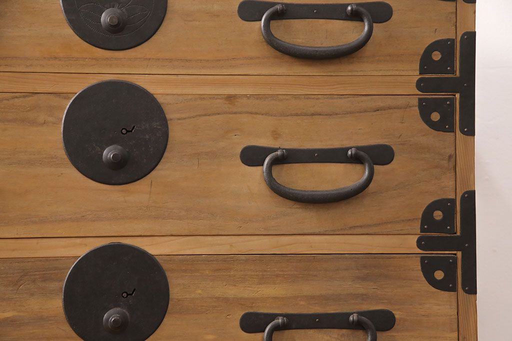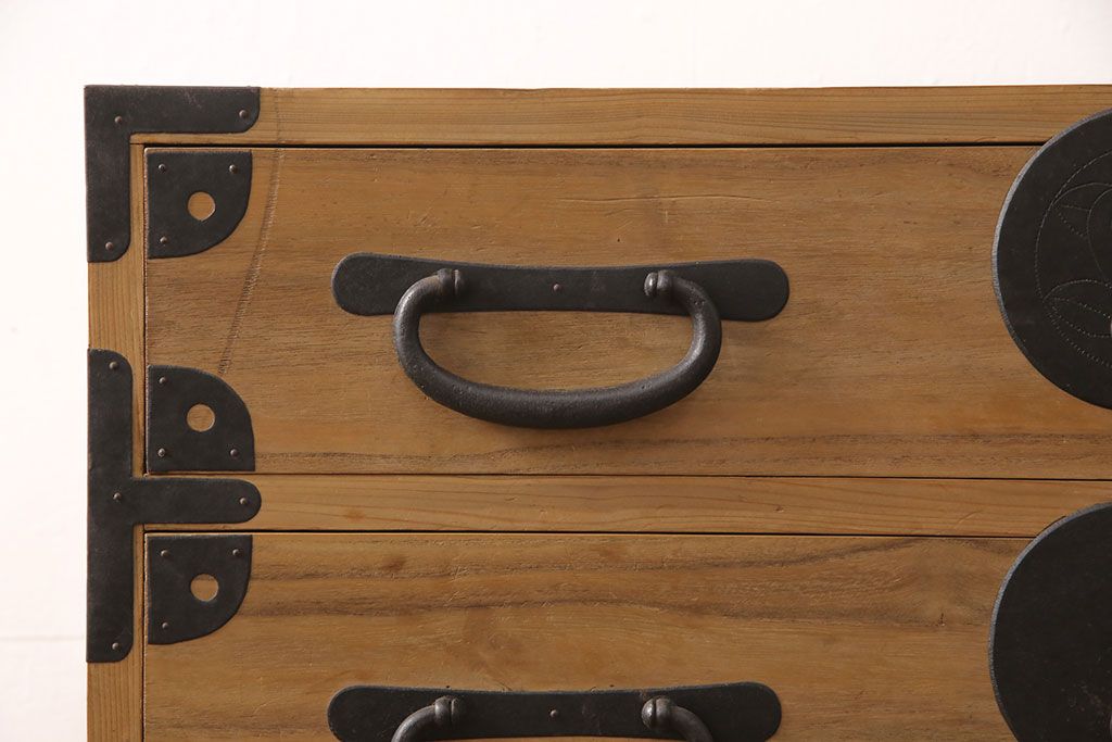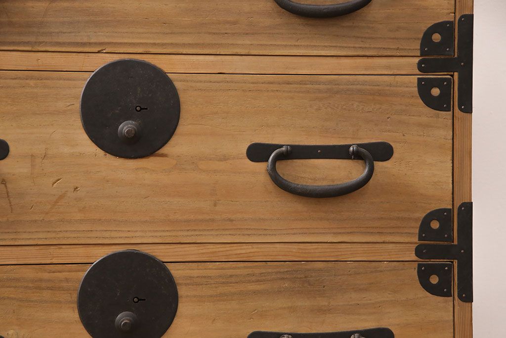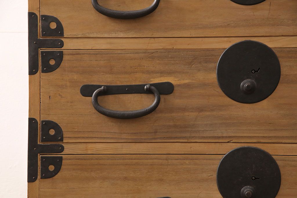 和箪笥 > 和製アンティーク 前面桐材 丸みのあるデザインの金具が可愛らしい松本衣装箪笥(時代箪笥、和タンス、引き出し、チェスト)(R-051928)