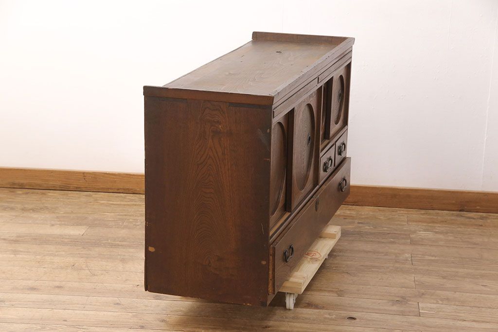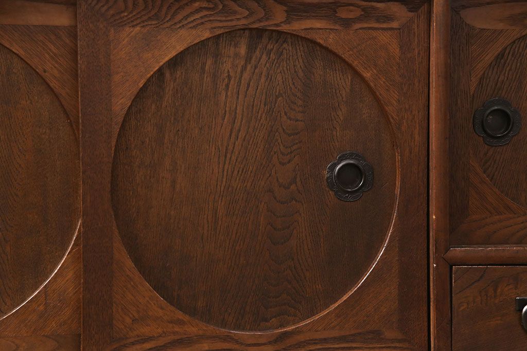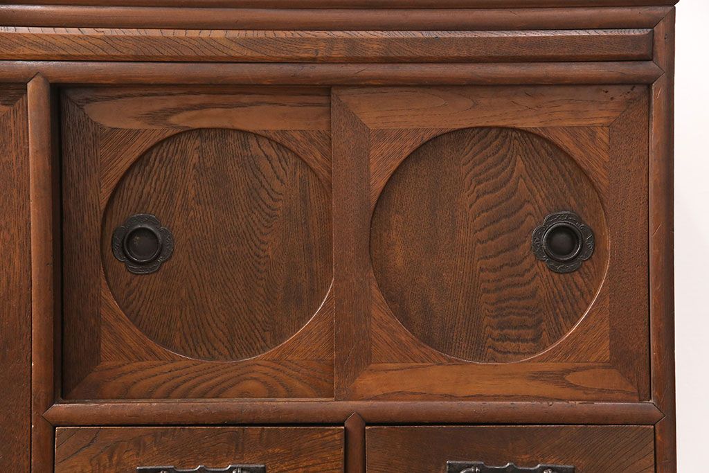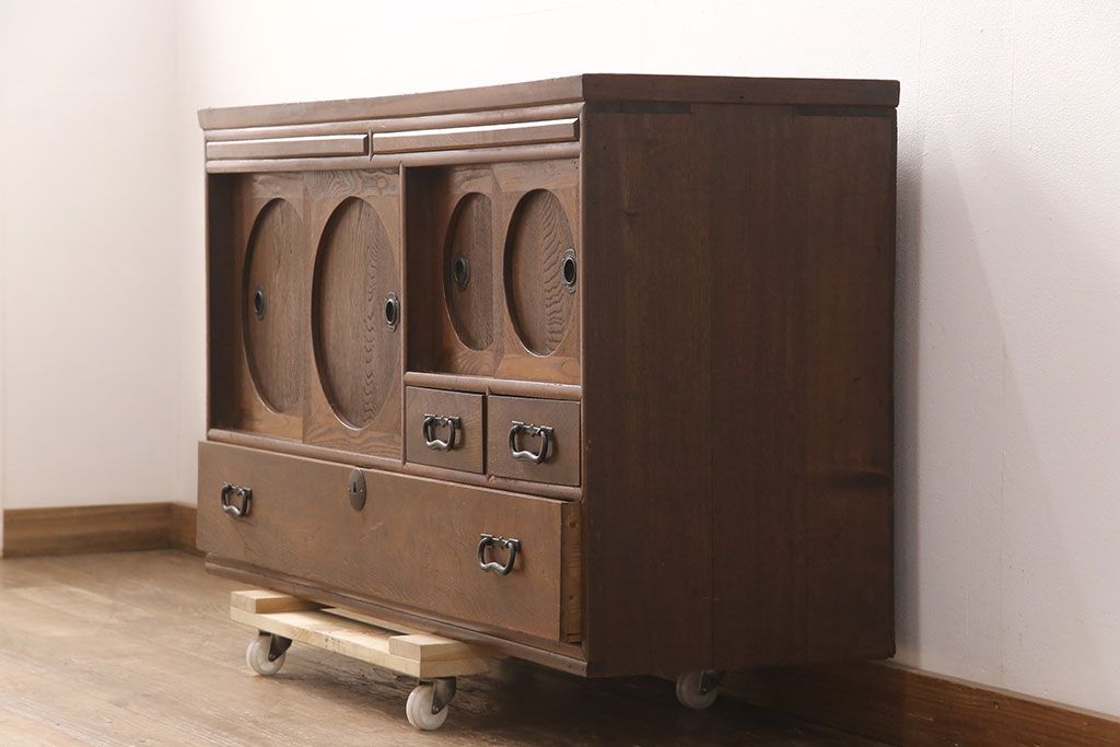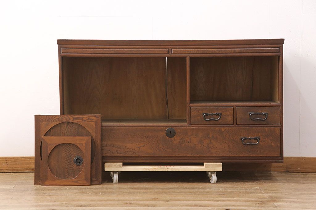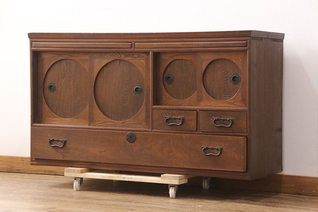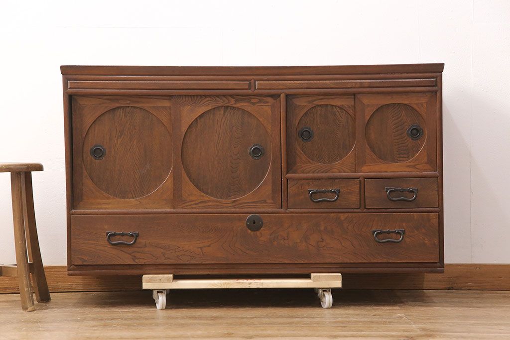 和製アンティーク 前面ケヤキ材 ガラスを入れて丸窓にリメイク! レトロなデザインが可愛らしい収納戸棚(テレビボード、テレビ台、サイドボード、ローボード)(R-051838)