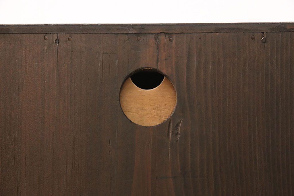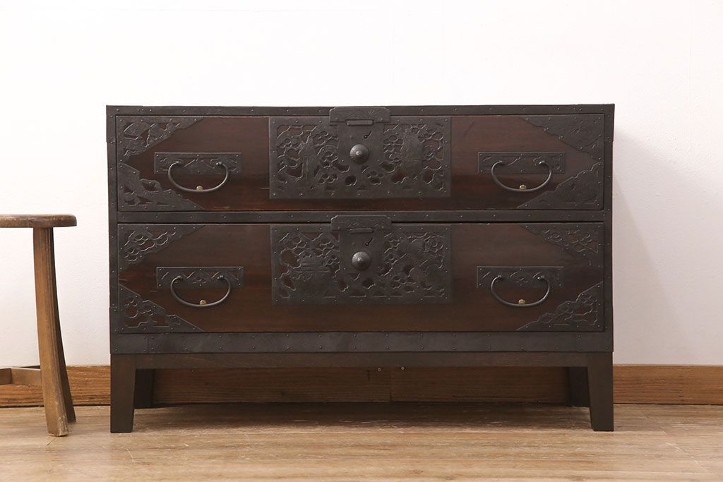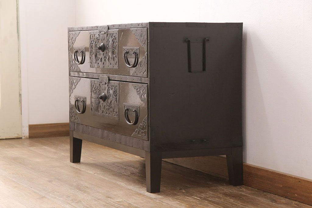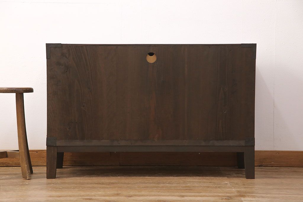 和箪笥> 衣装箪笥 > 佐渡箪笥をリペア&カスタム!天板補強と背面に配線用の穴加工を施し、角脚の取り付け。金具は黒染めし、本体は現状に近しい色味に着色し仕上げ。(衣装箪笥、時代箪笥、リビングボード、チェスト、引き出し、テレビ台、テレビボード)
