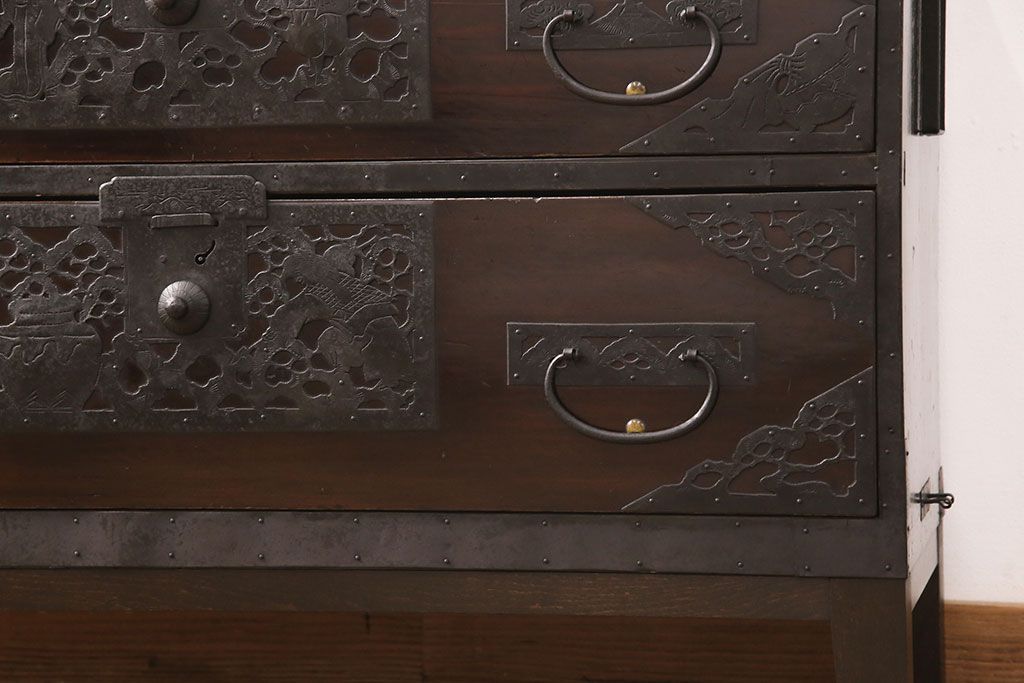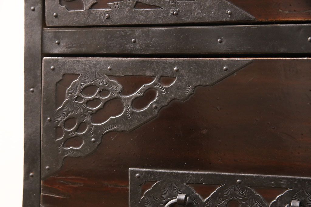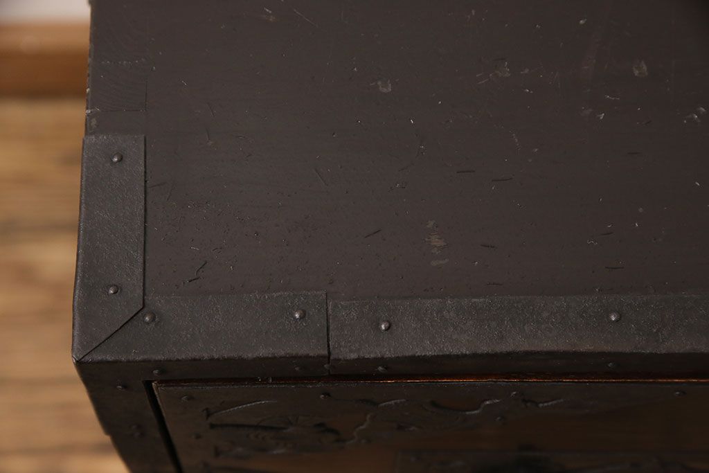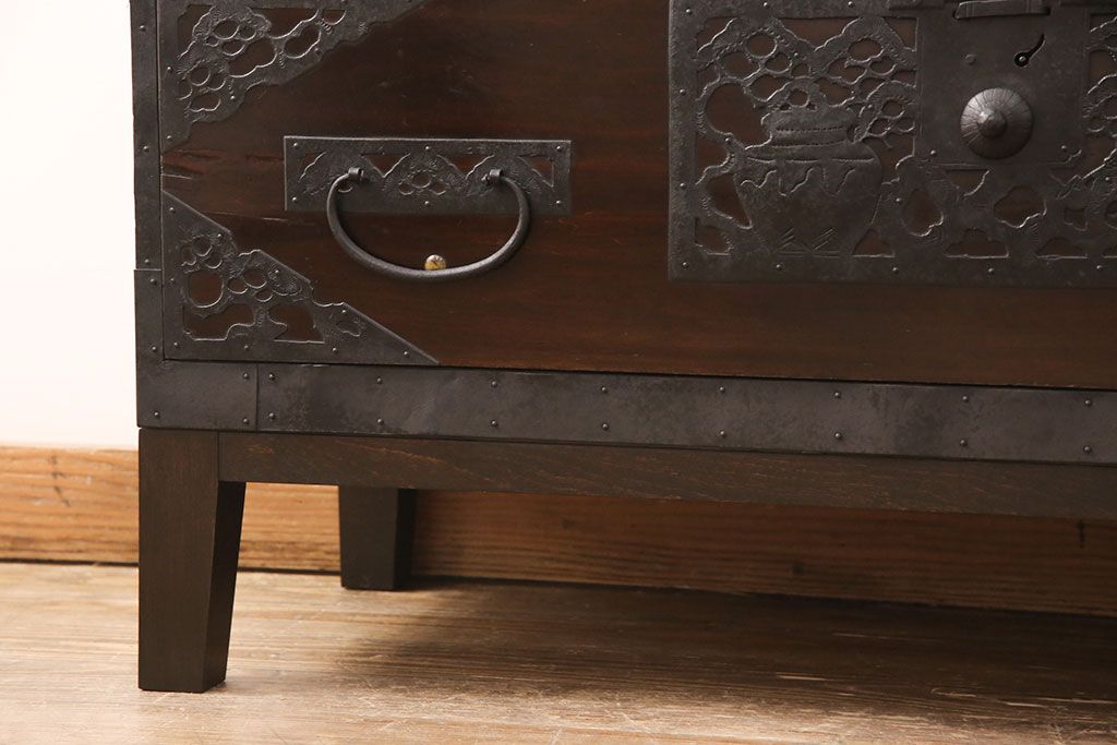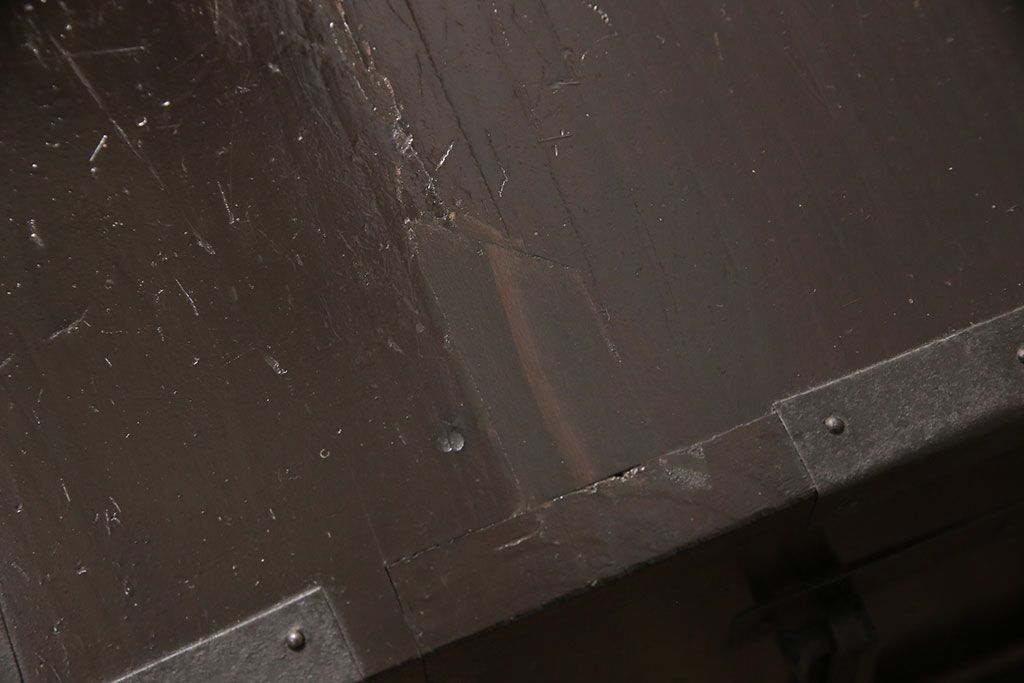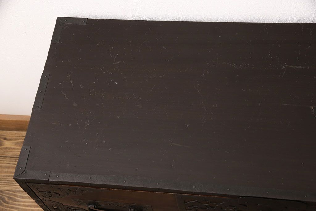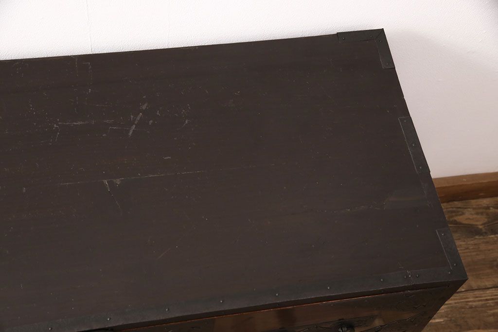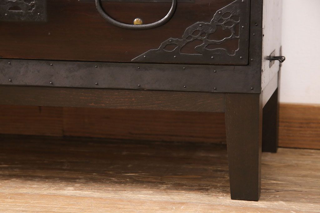 和箪笥 > 佐渡箪笥をリペア&カスタム!天板補強と背面に配線用の穴加工を施し、角脚の取り付け。金具は黒染めし、本体は現状に近しい色味に着色し仕上げ。(衣装箪笥、時代箪笥、リビングボード、チェスト、引き出し、テレビ台、テレビボード)