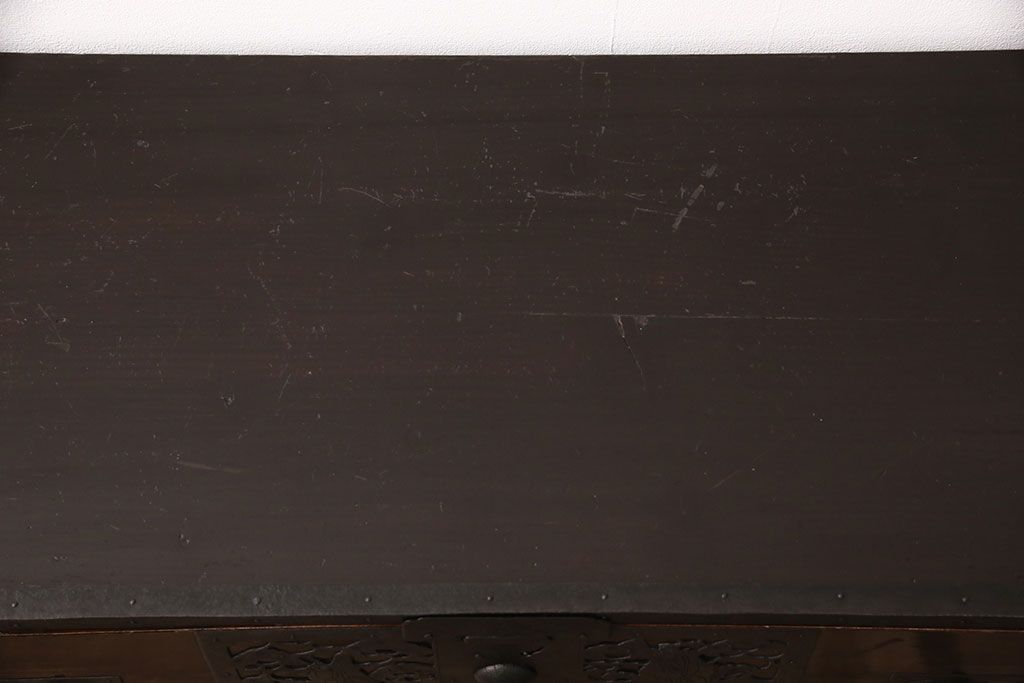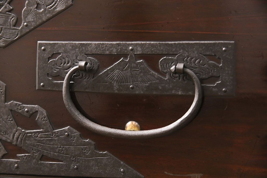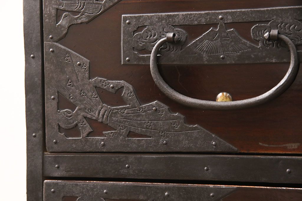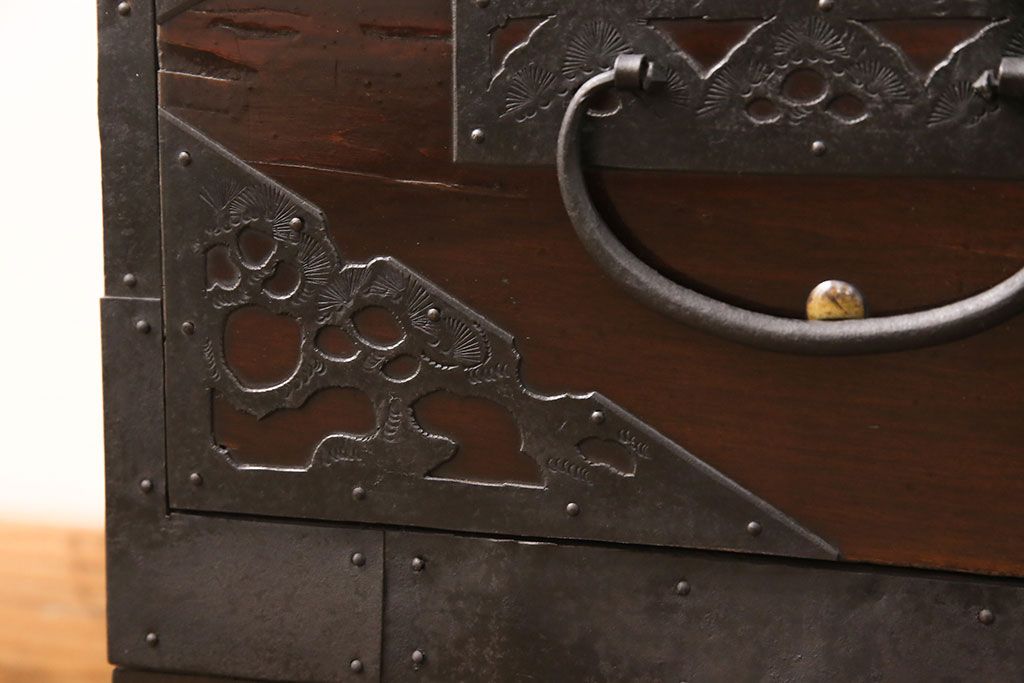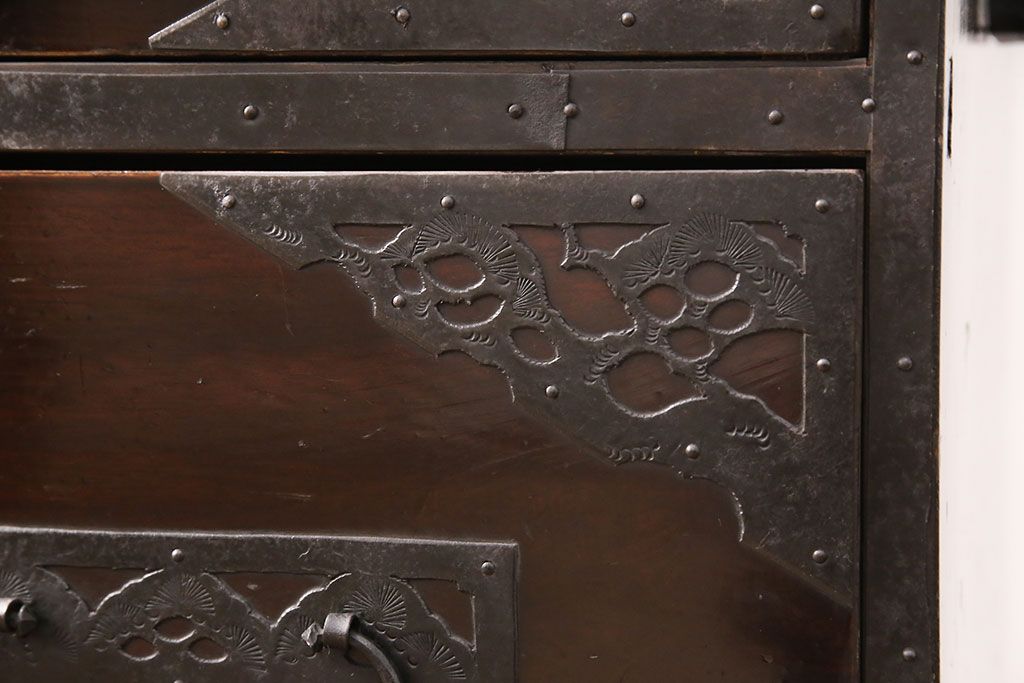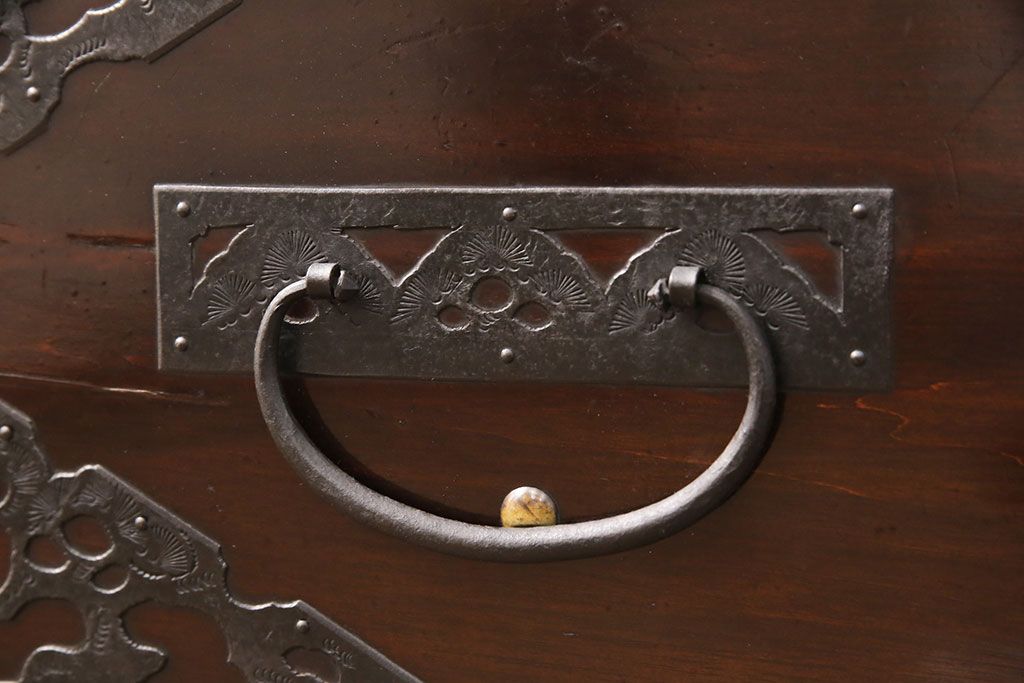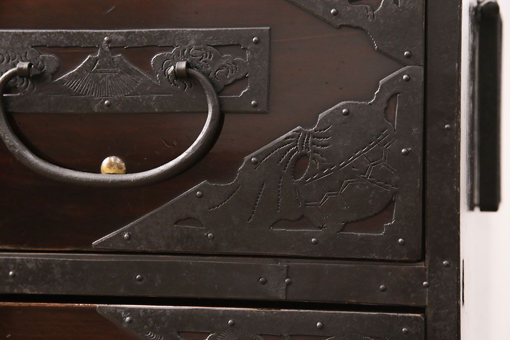 和箪笥 > 佐渡箪笥をリペア&カスタム!天板補強と背面に配線用の穴加工を施し、角脚の取り付け。金具は黒染めし、本体は現状に近しい色味に着色し仕上げ。(衣装箪笥、時代箪笥、リビングボード、チェスト、引き出し、テレビ台、テレビボード)