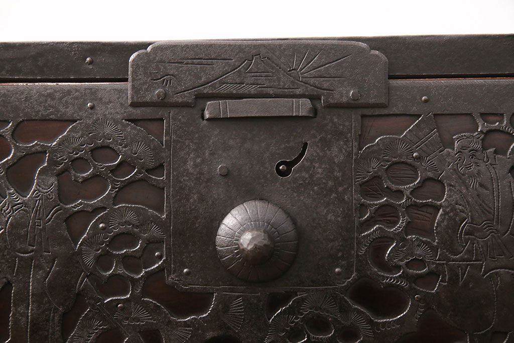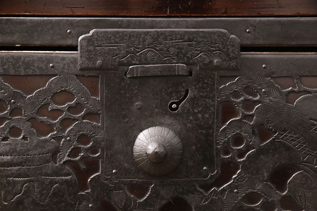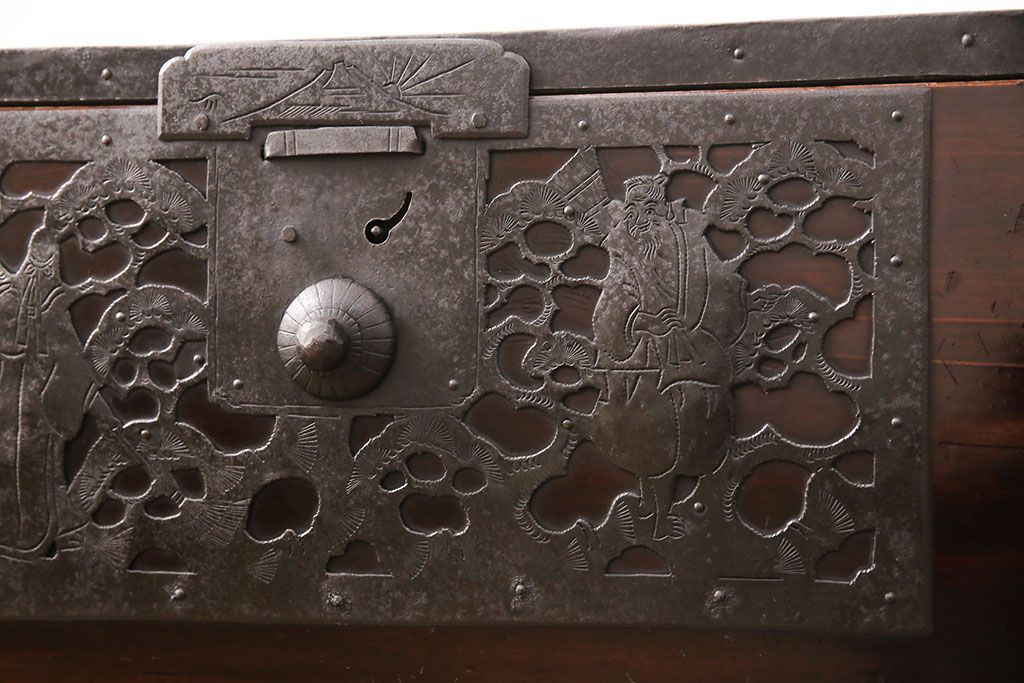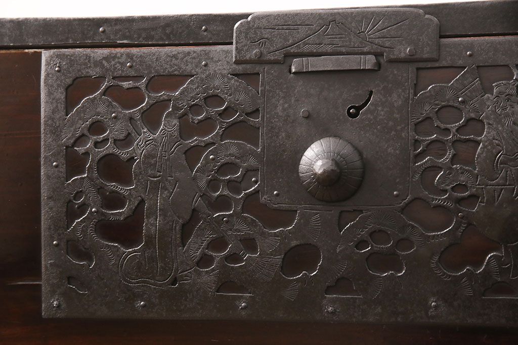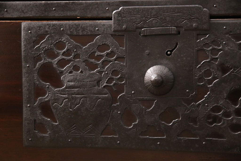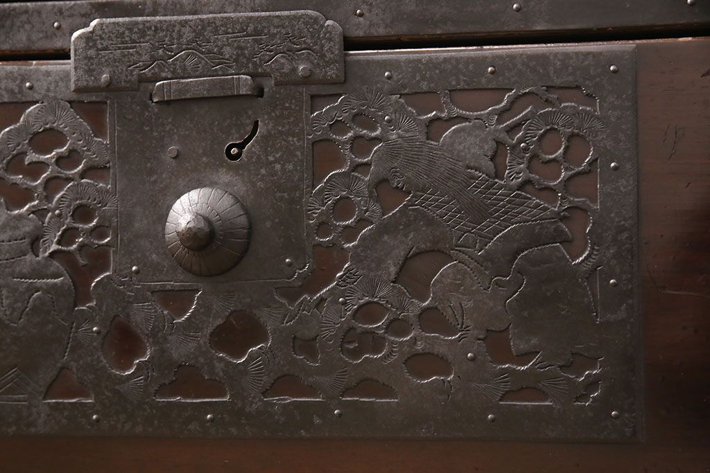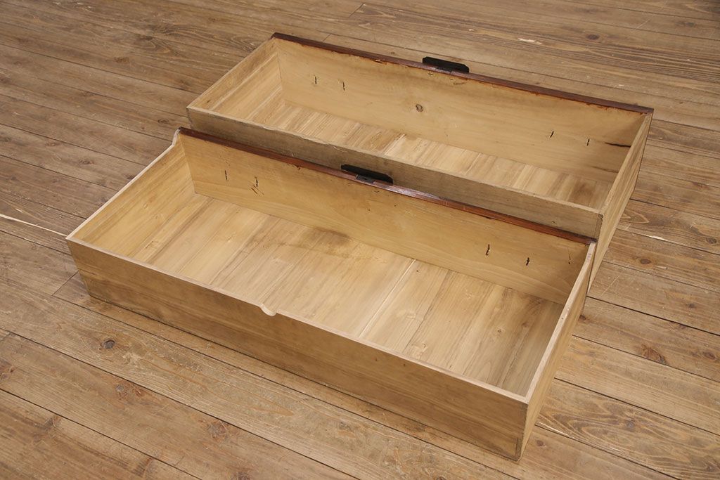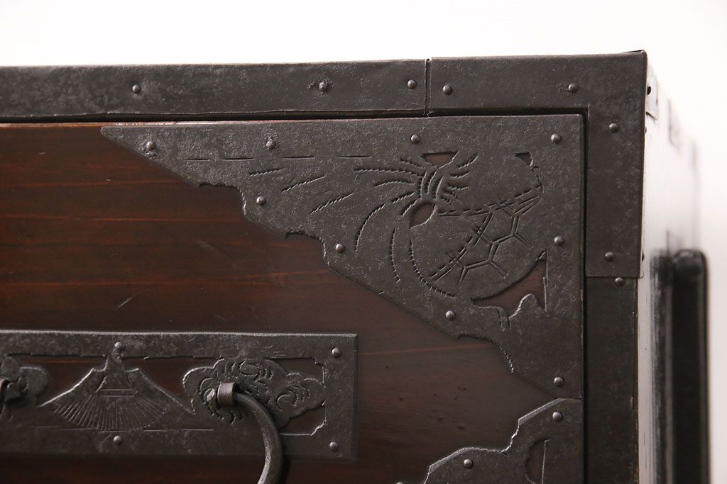 和箪笥 > 佐渡箪笥をリペア&カスタム!天板補強と背面に配線用の穴加工を施し、角脚の取り付け。金具は黒染めし、本体は現状に近しい色味に着色し仕上げ。(衣装箪笥、時代箪笥、リビングボード、チェスト、引き出し、テレビ台、テレビボード)