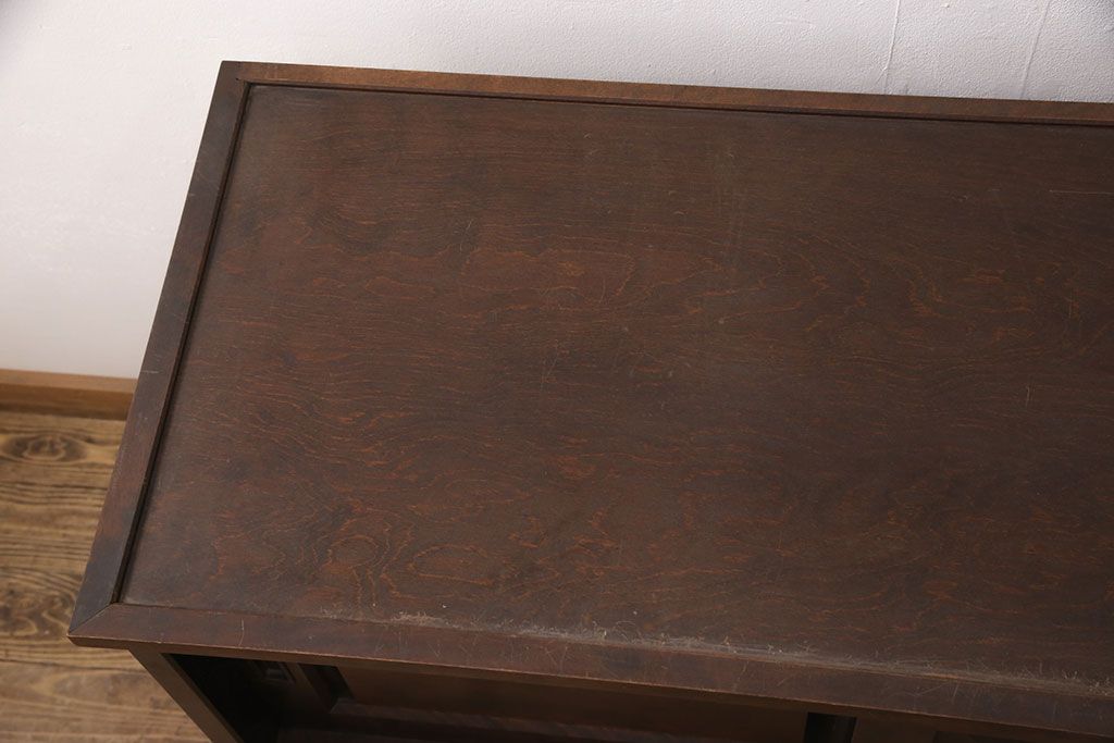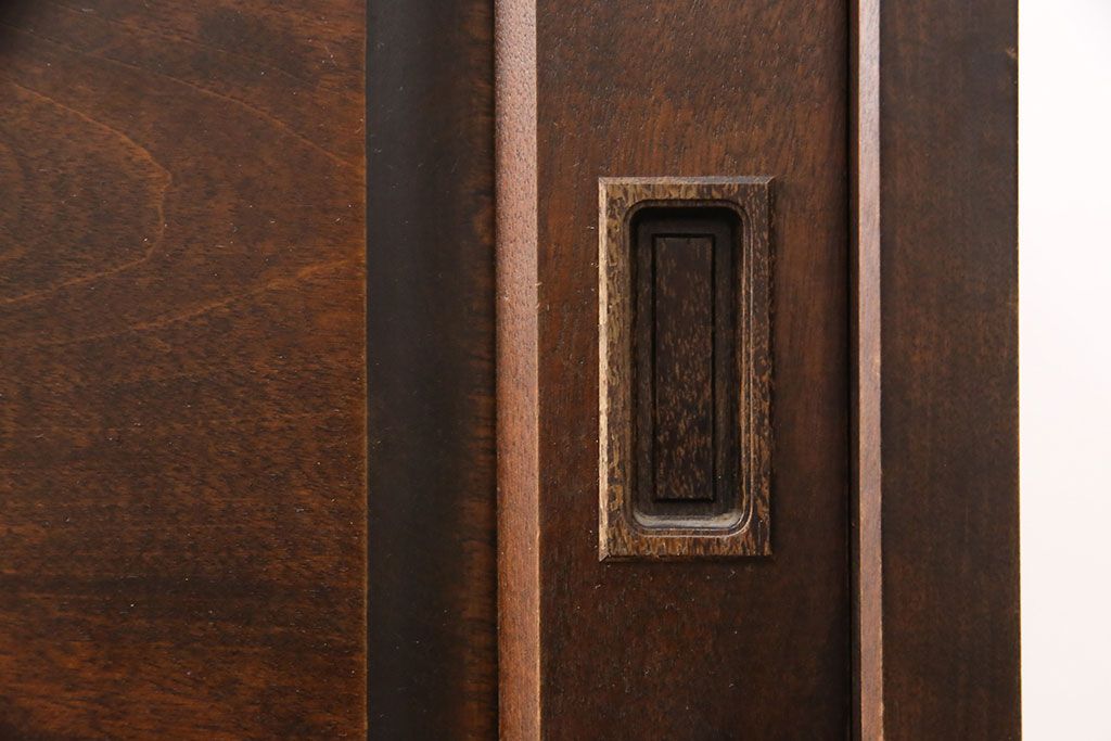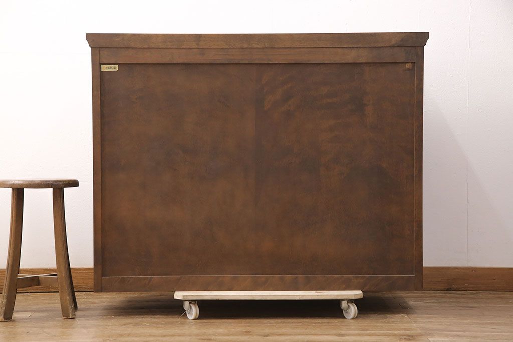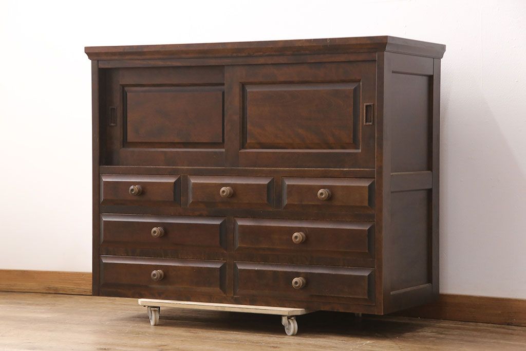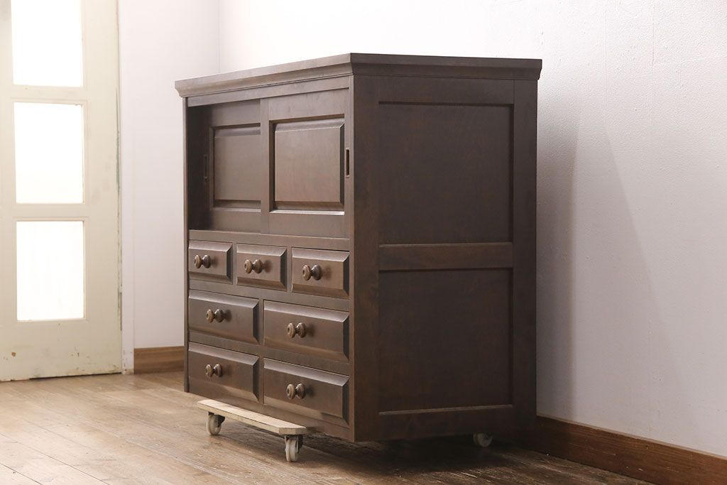 ラフジュ工房> キャビネット・戸棚> サイドキャビネット > 中古 北海道民芸家具 脚(台輪)付きリメイク 取り入れやすいサイズが嬉しい!シックな佇まいが魅力の収納棚(サイドキャビネット、サイドボード、戸棚、引き出し、サイドチェスト)(R-051762)