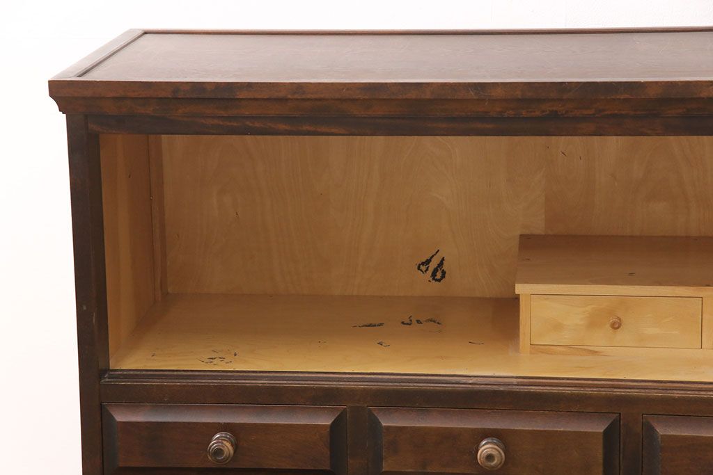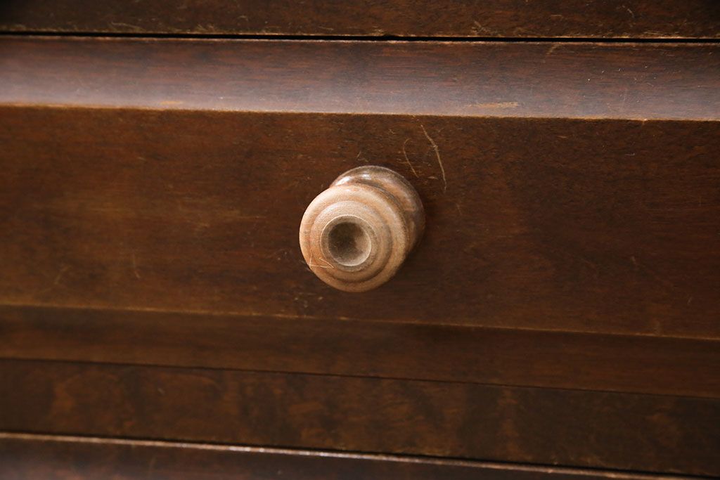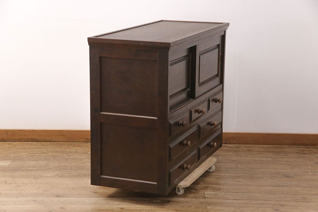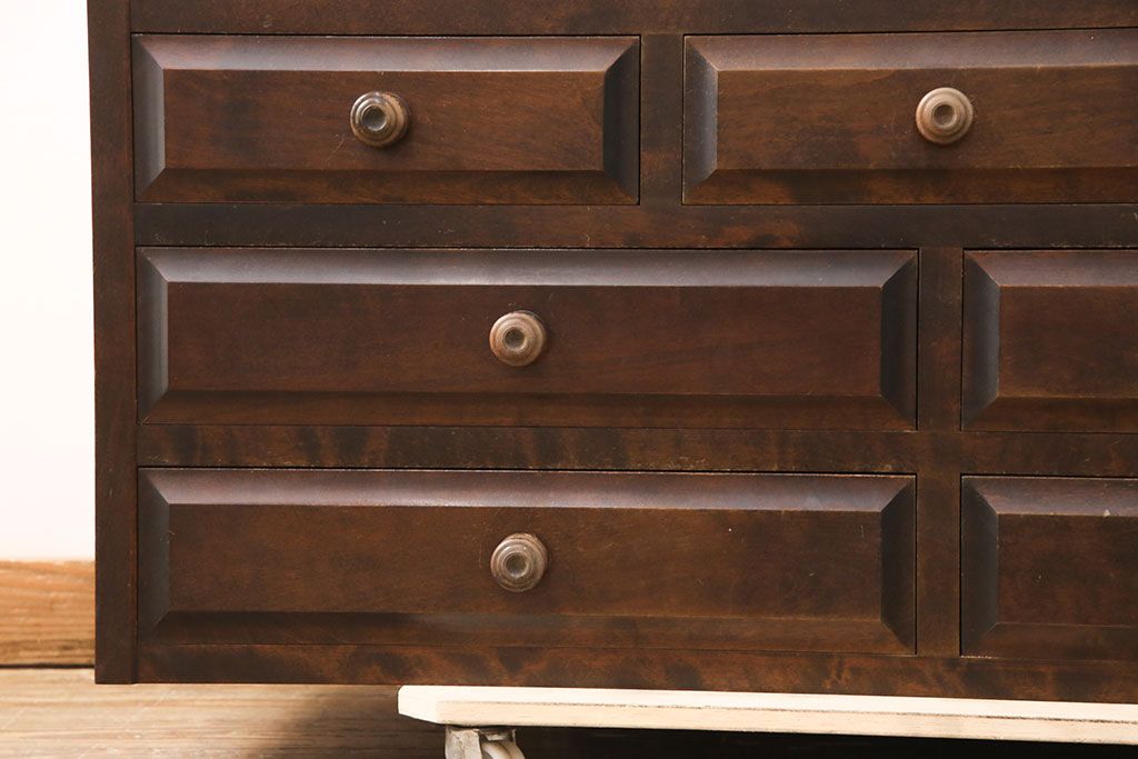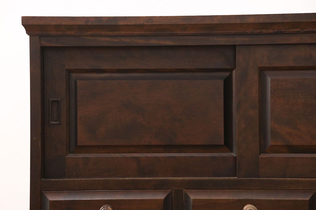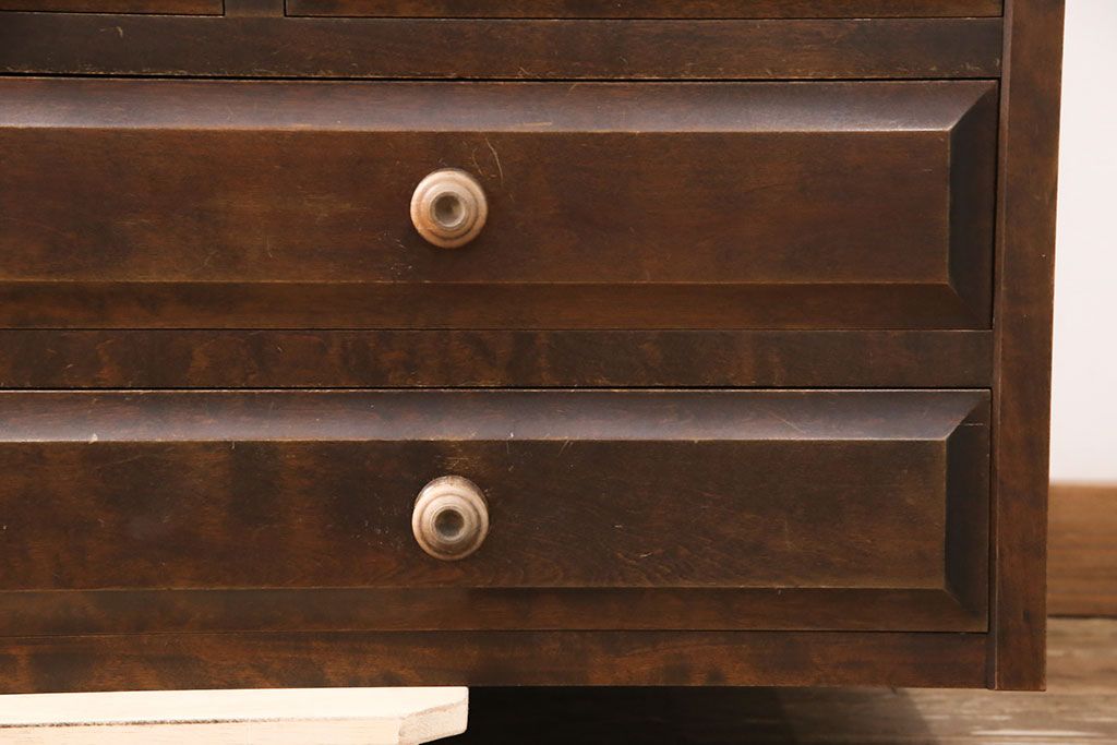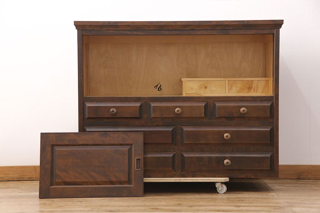 ラフジュ工房> チェスト・引き出し> サイドチェスト > 中古 北海道民芸家具 脚(台輪)付きリメイク 取り入れやすいサイズが嬉しい!シックな佇まいが魅力の収納棚(サイドキャビネット、サイドボード、戸棚、引き出し、サイドチェスト)(R-051762)