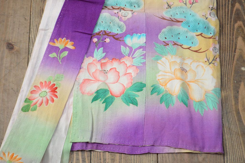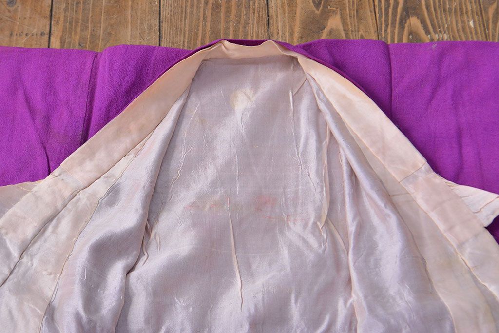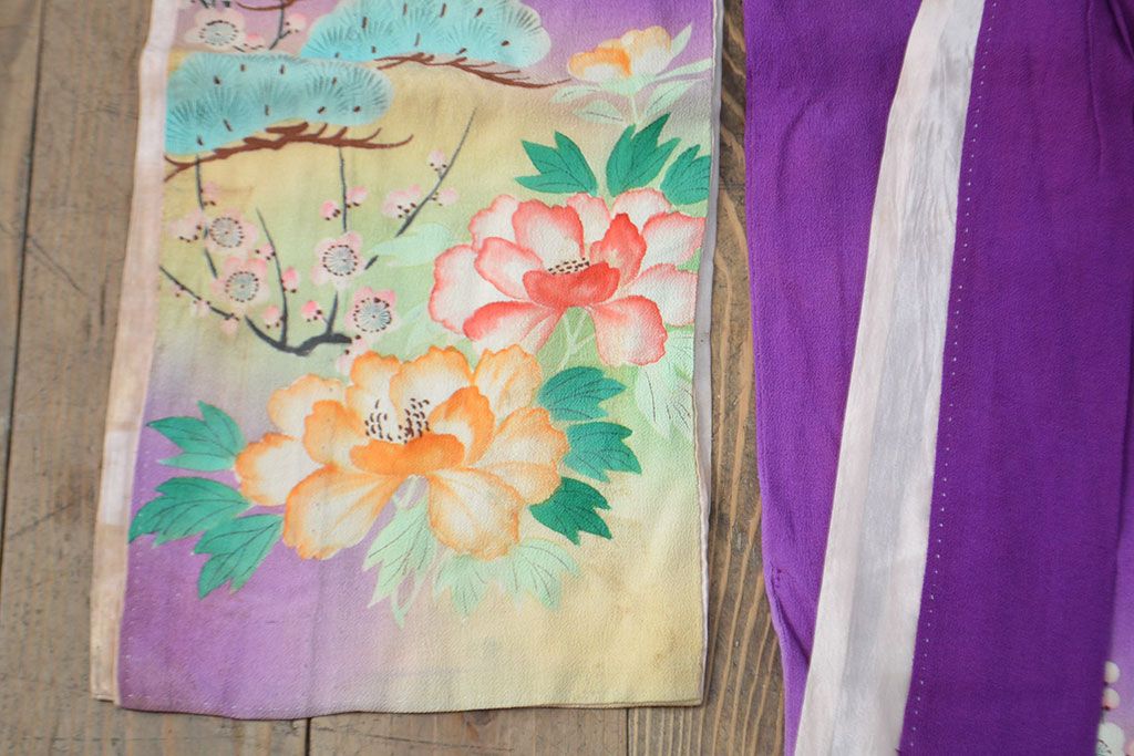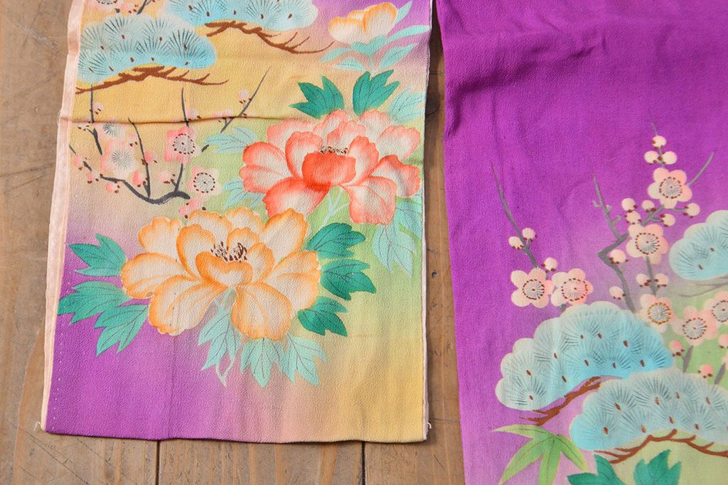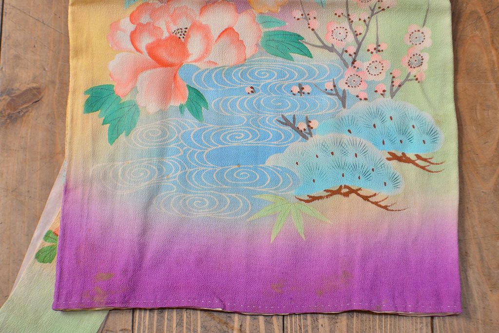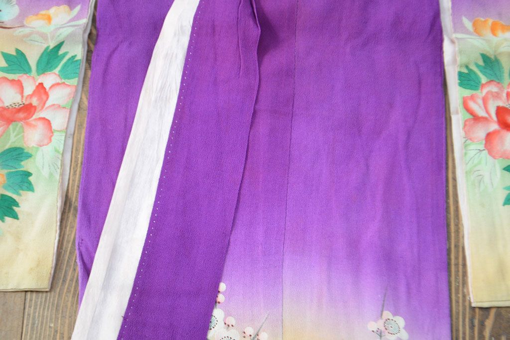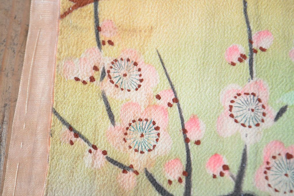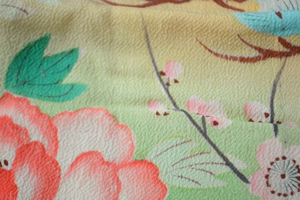 大正〜昭和初期 梅に牡丹 アンティーク 縮緬着物(正絹、古布、ちりめん)(R-051869)