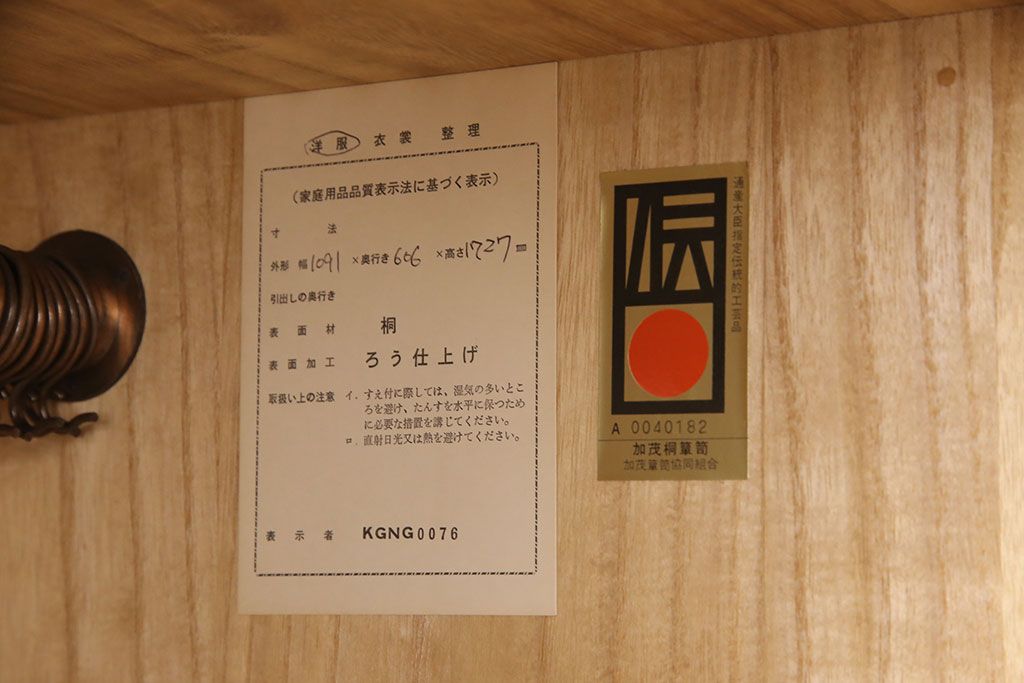 ラフジュ工房> 和箪笥> 衣装箪笥 > 中古 美品 伝統工芸士・中沢和夫作 かくし付き 繊細な金具が上品な雰囲気を高める小引き出し付き加茂総桐箪笥(胴丸、総桐たんす、ワードローブ、衣装箪笥、和タンス、洋服タンス)(定価約100万円)(R-052182)
