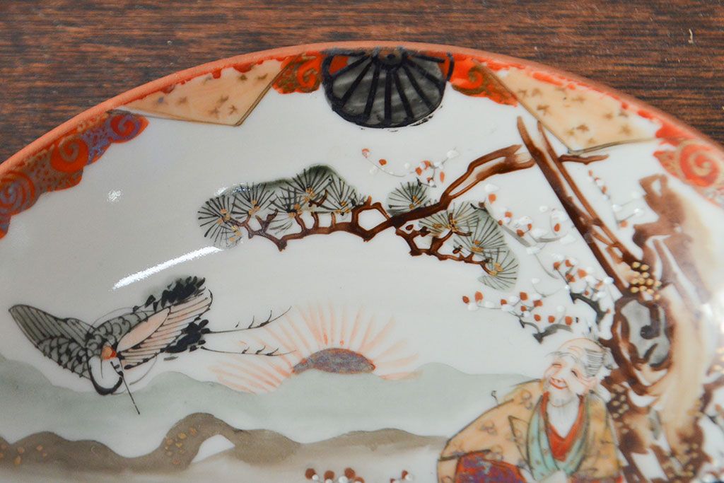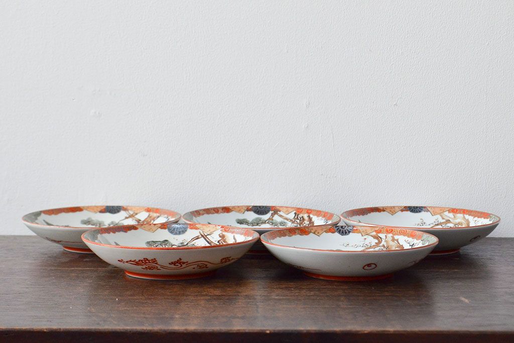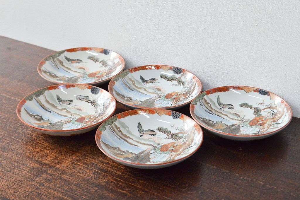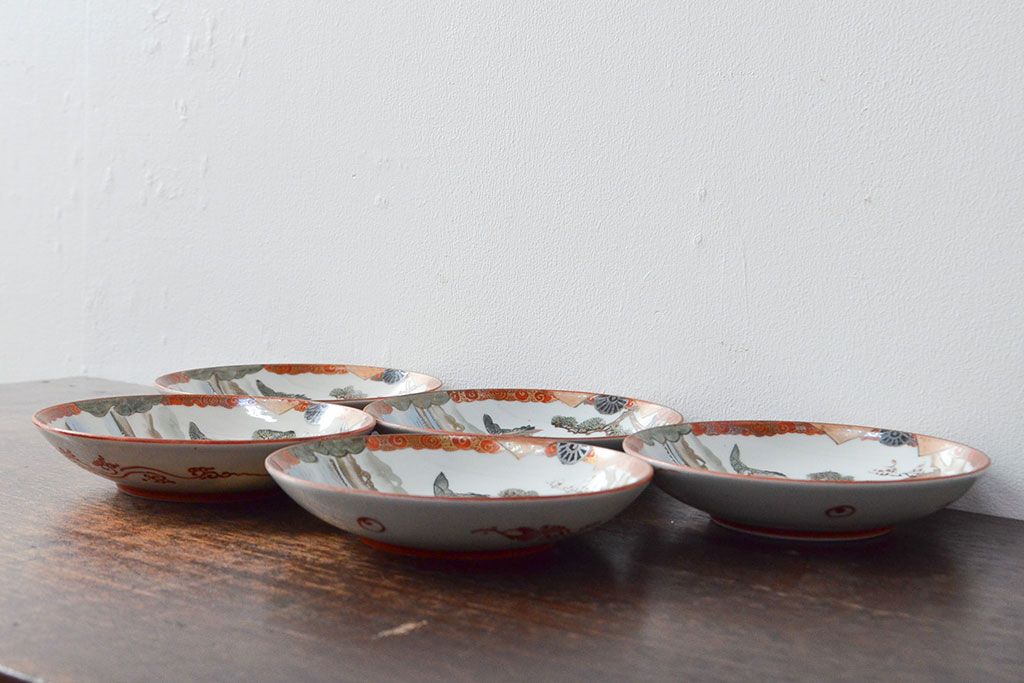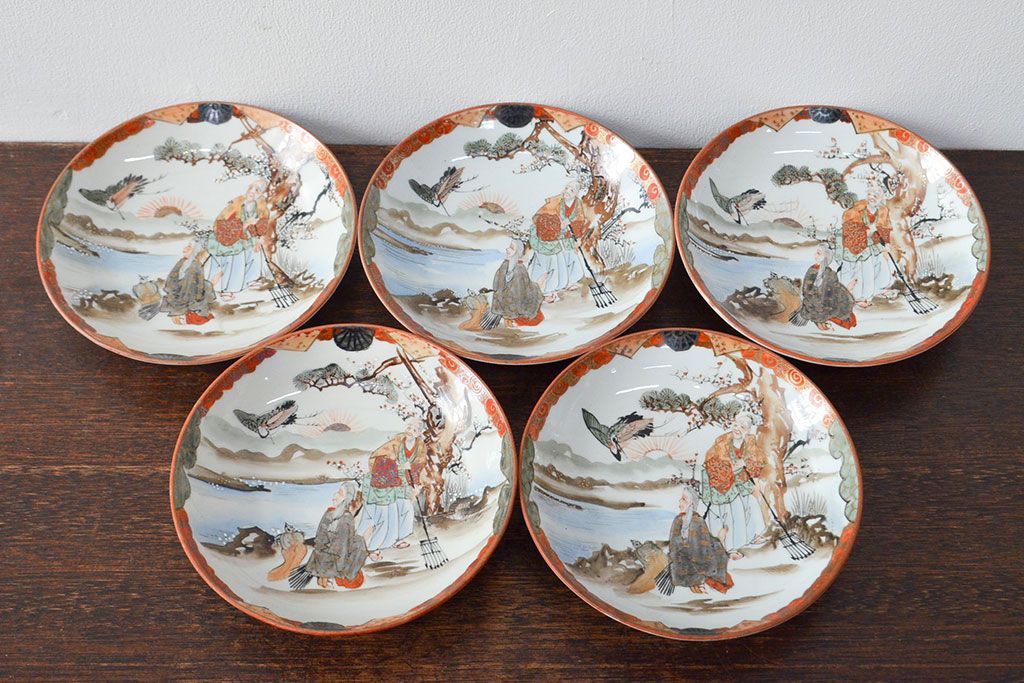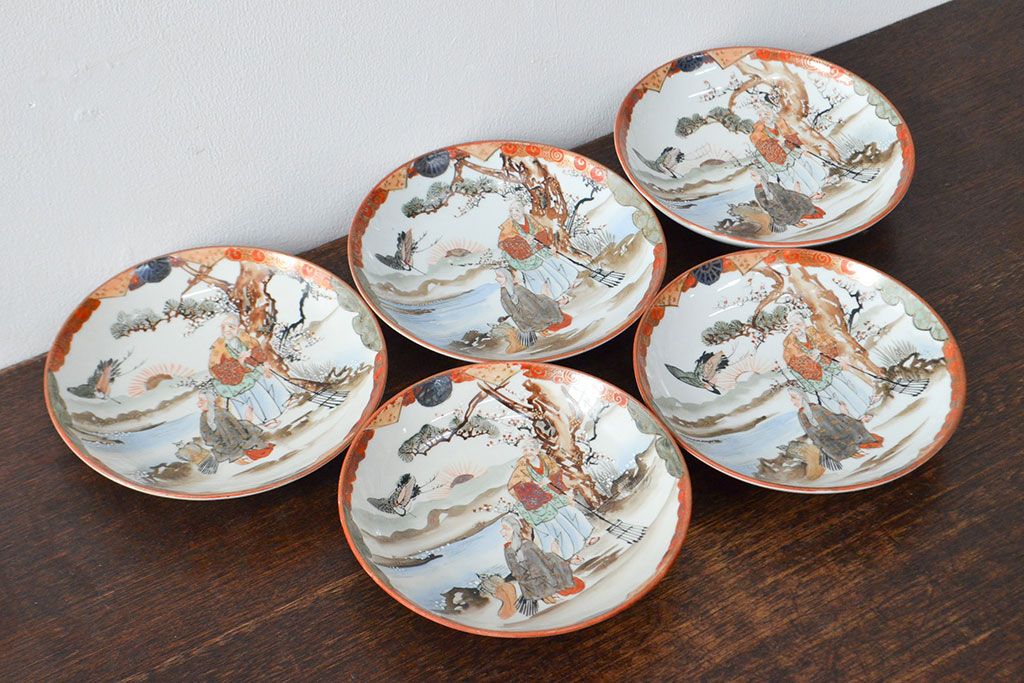 ラフジュ工房> 和食器・茶道具 > 明治期 九谷焼 鶴亀に高砂図 色絵 小皿5枚セット(和食器)(R-052061)