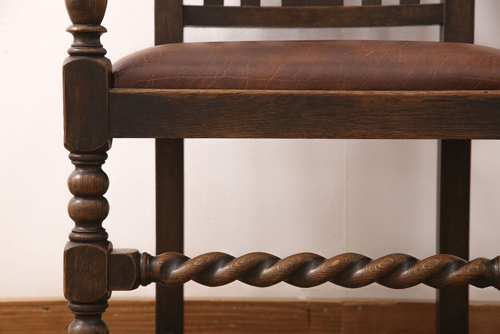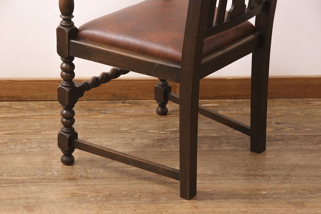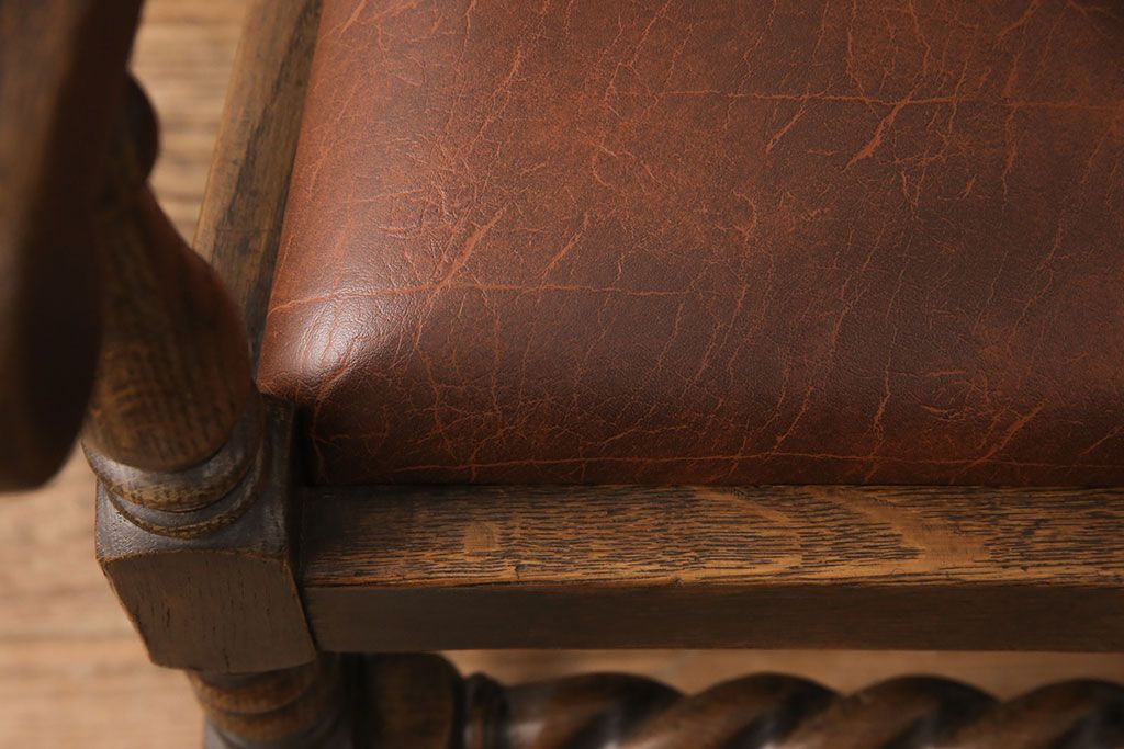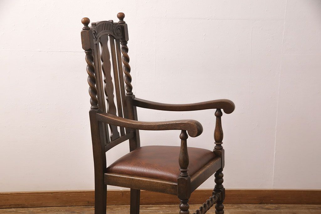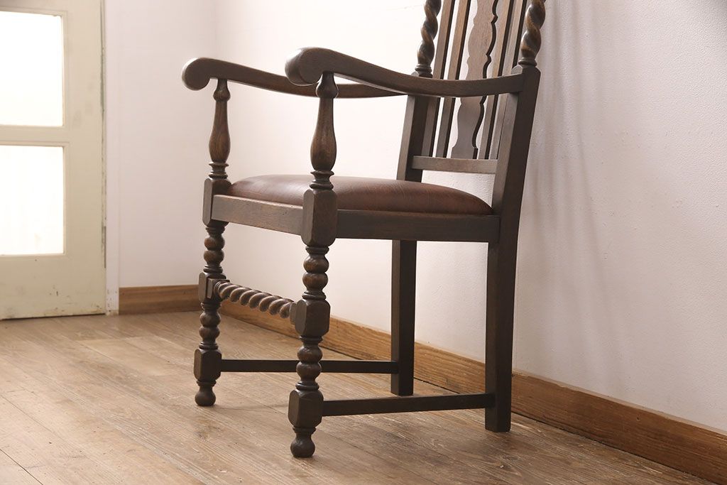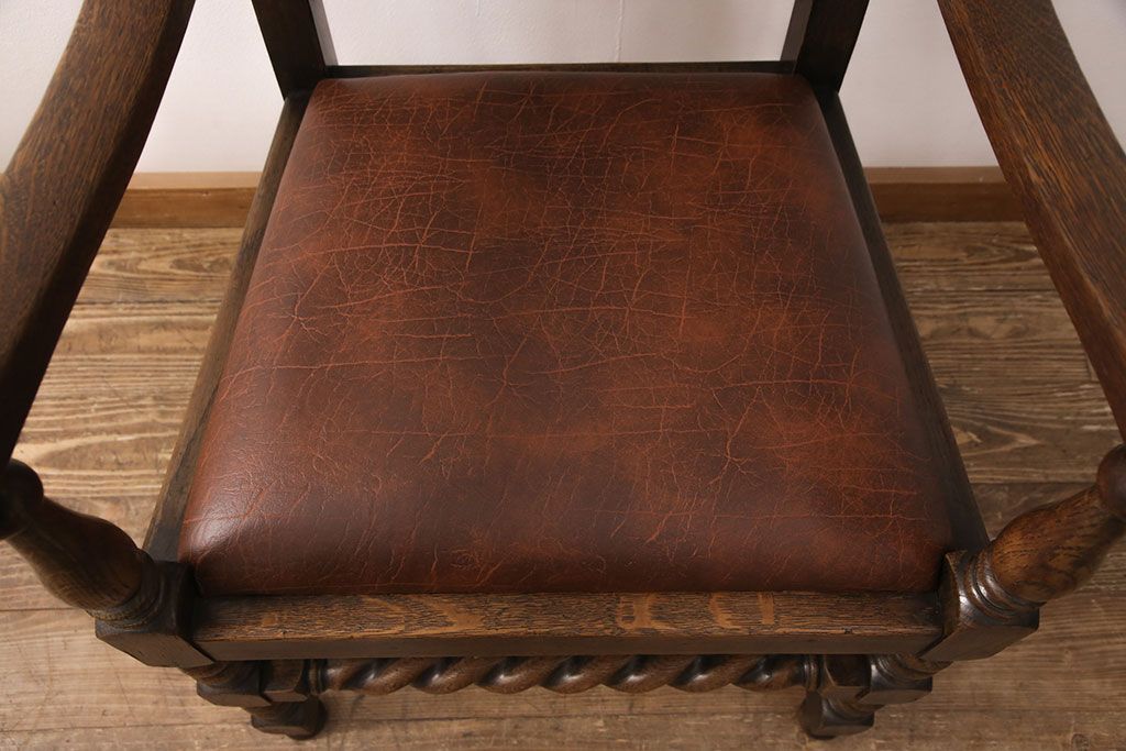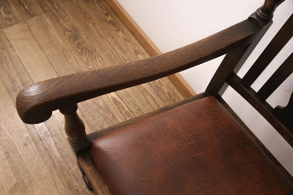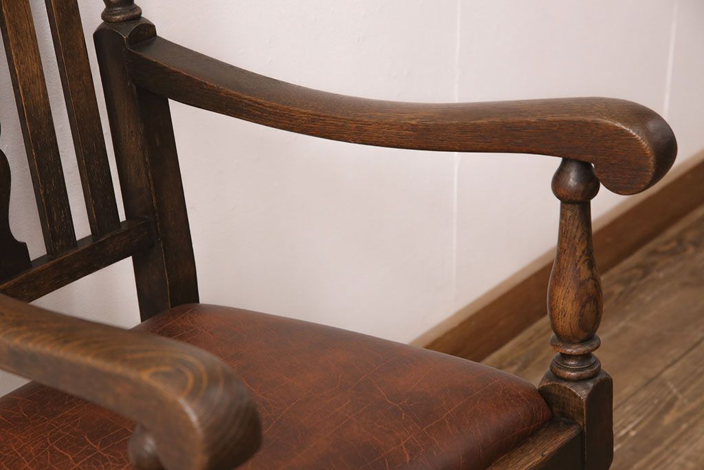 椅子・ベンチ> ダイニングチェア > イギリスアンティークのアームチェアをリペア&カスタム!座面の張り替えを行い、現状に近しい色味に着色し仕上げ。(椅子、ダイニングチェア)
