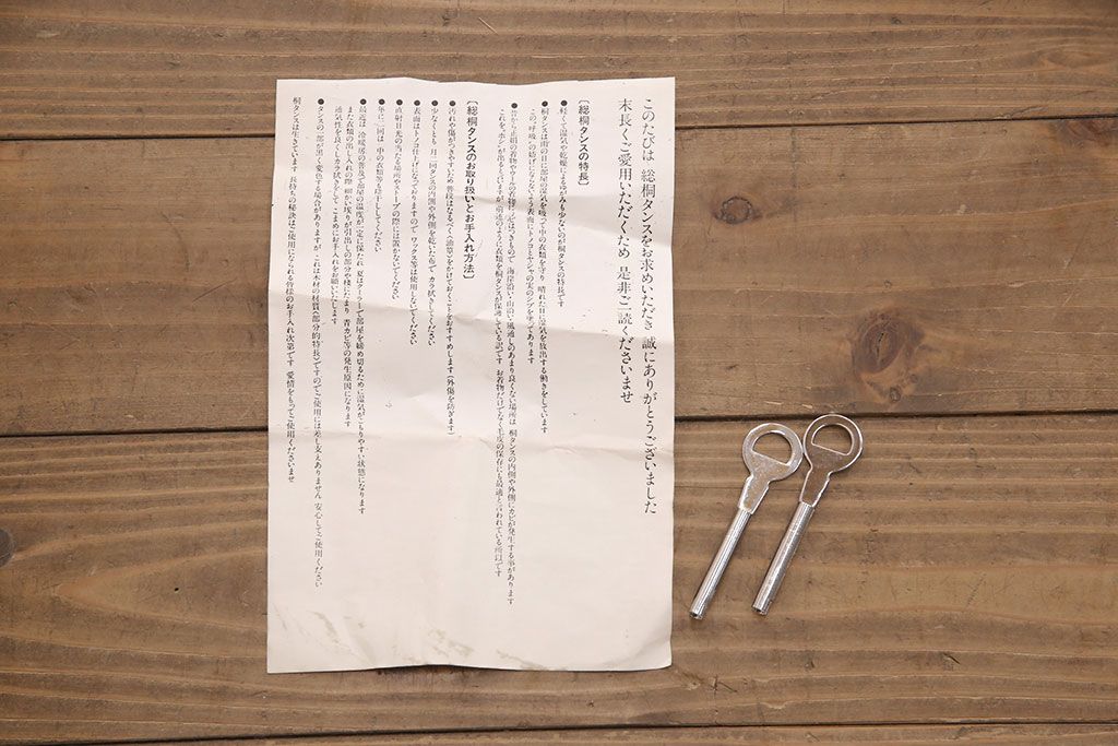 鍵は付属します。画像にありますように、袋に入れお付けします。スムーズに動くように調整して仕上げますが、あくまでも古いものや中古品ですので、長期の使用保証は出来かねます。ご購入後不具合が発生した場合は、当店でサポートさせていただきますので、お気軽にご相談くださいませ。