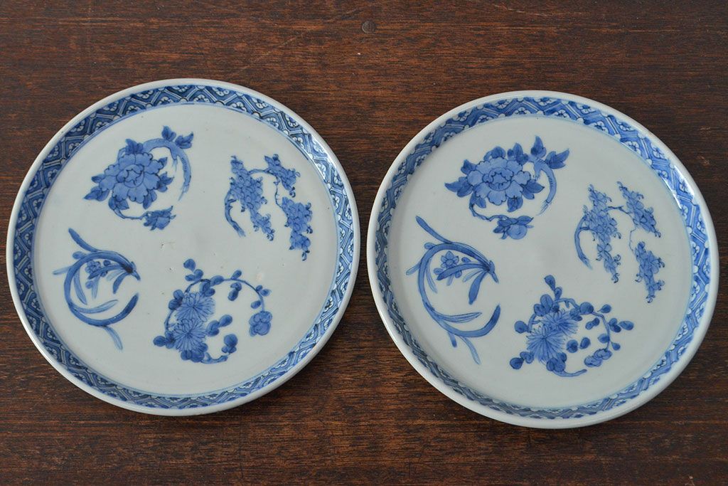 ラフジュ工房> 骨董・美術品> 骨董-陶磁器 > 江戸期 古伊万里 四花文染付 六寸皿2枚セット(和食器、中皿)(R-052070)