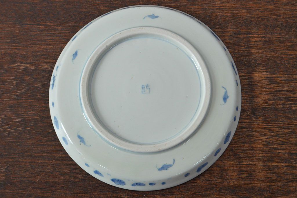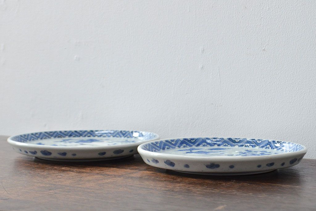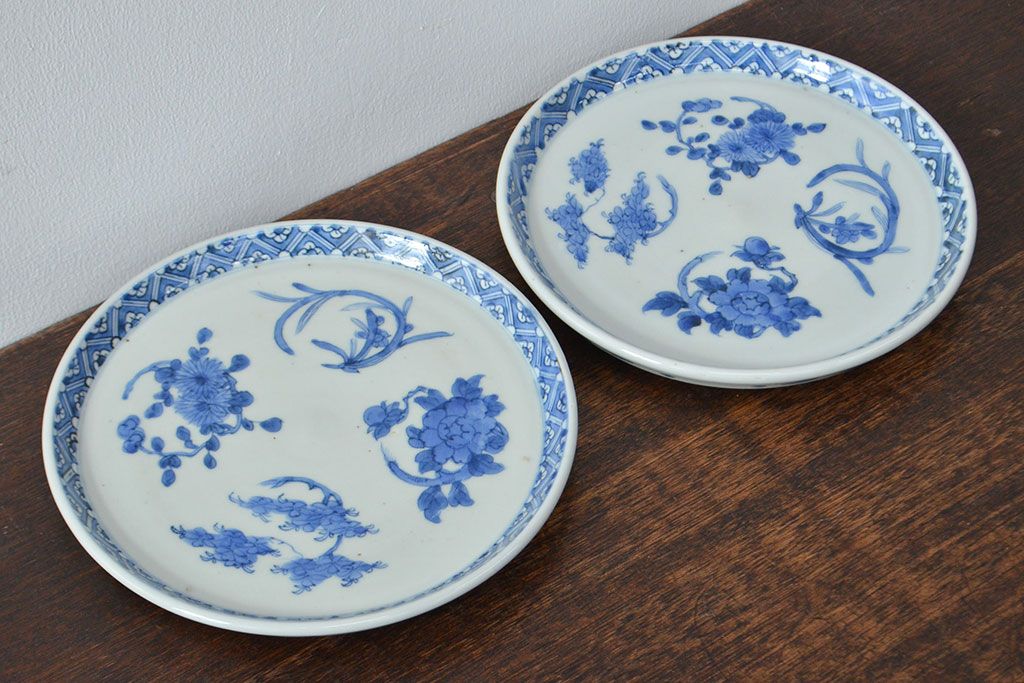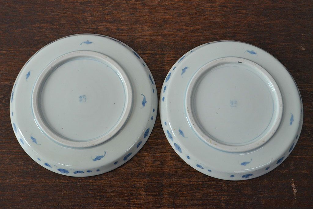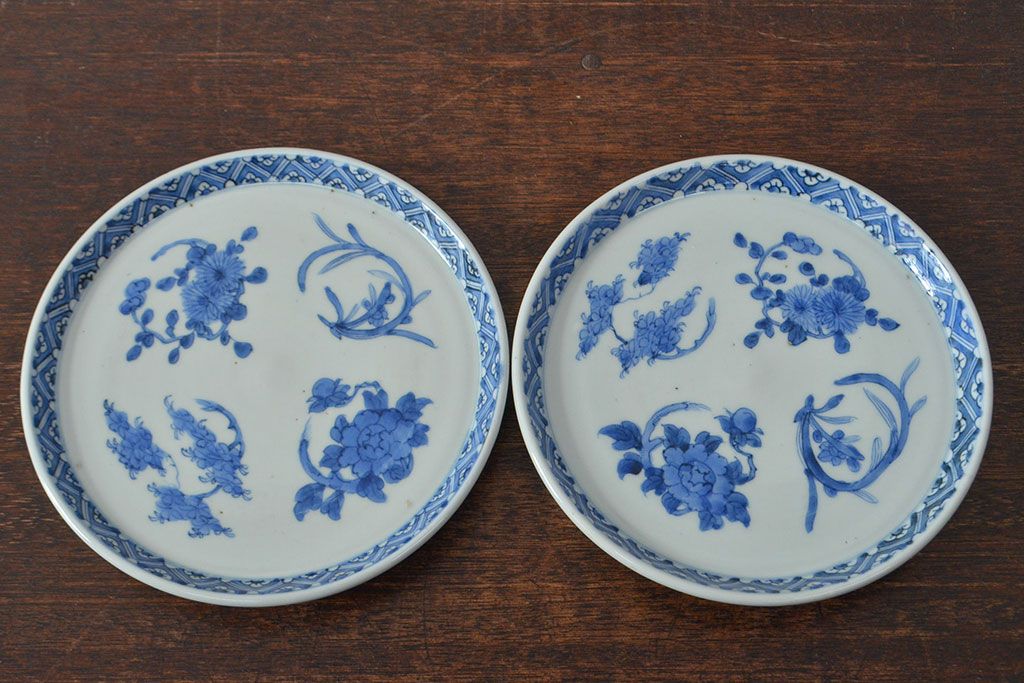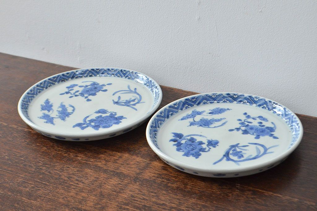 ラフジュ工房> 骨董・美術品> 骨董-陶磁器 > 江戸期 古伊万里 四花文染付 六寸皿2枚セット(和食器、中皿)(R-052071)