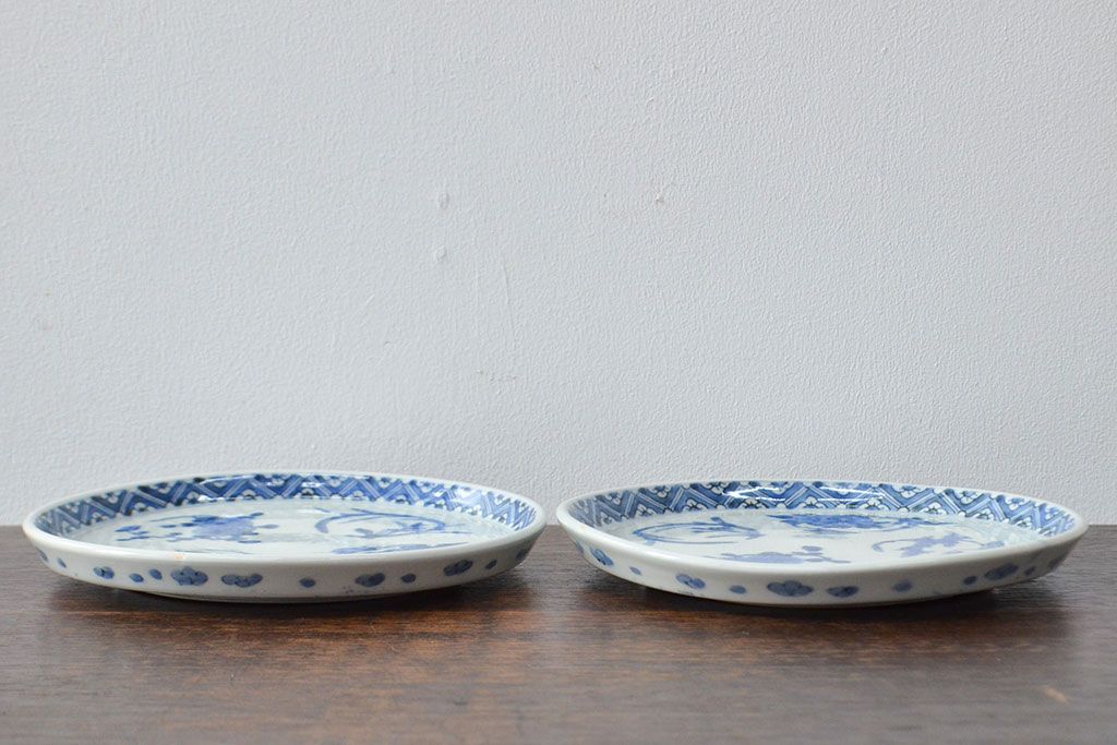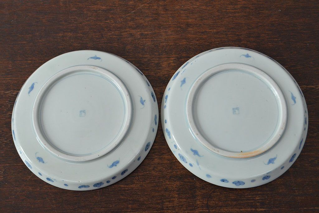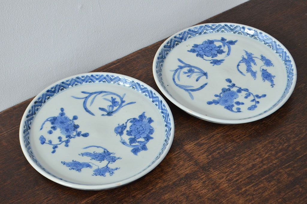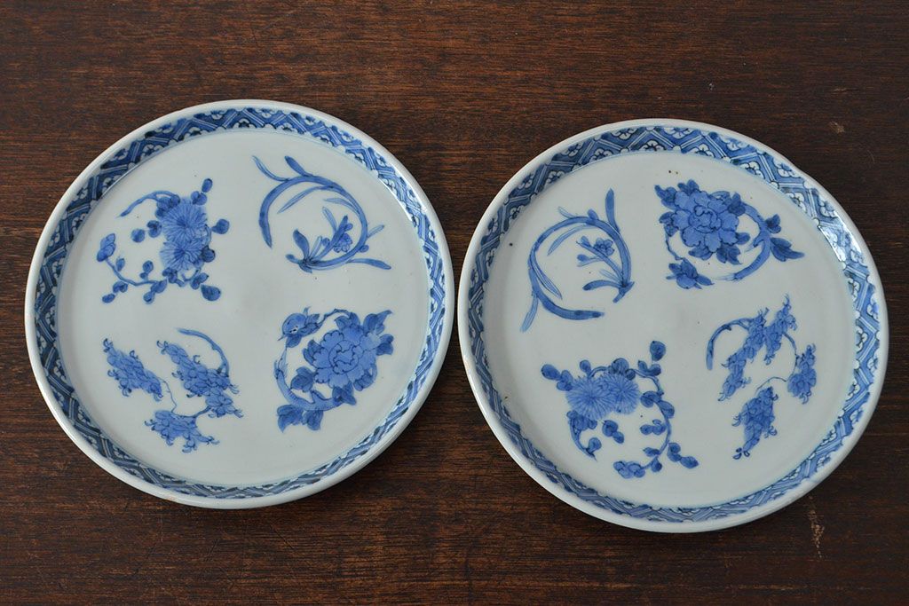 ラフジュ工房> 骨董・美術品> 骨董-陶磁器 > 江戸期 古伊万里 四花文染付 六寸皿2枚セット(和食器、中皿)(R-052077)