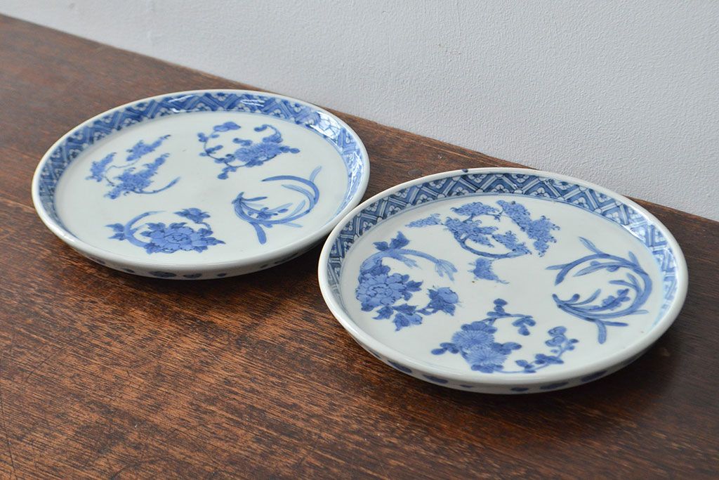 ラフジュ工房> 骨董・美術品> 骨董-陶磁器 > 江戸期 古伊万里 四花文染付 六寸皿2枚セット(和食器、中皿)(R-052078)
