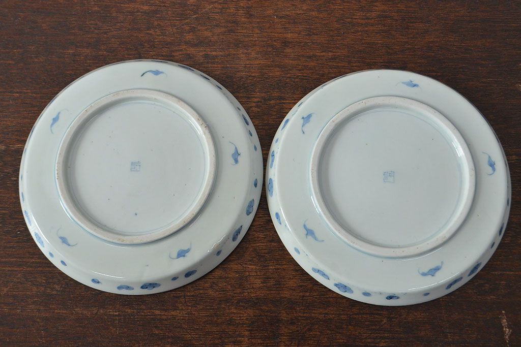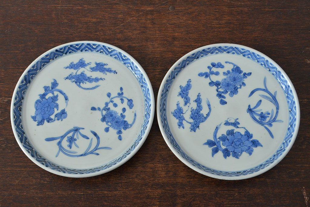 ラフジュ工房> 骨董・美術品> 骨董-陶磁器 > 江戸期 古伊万里 四花文染付 六寸皿2枚セット(和食器、中皿)(R-052079)