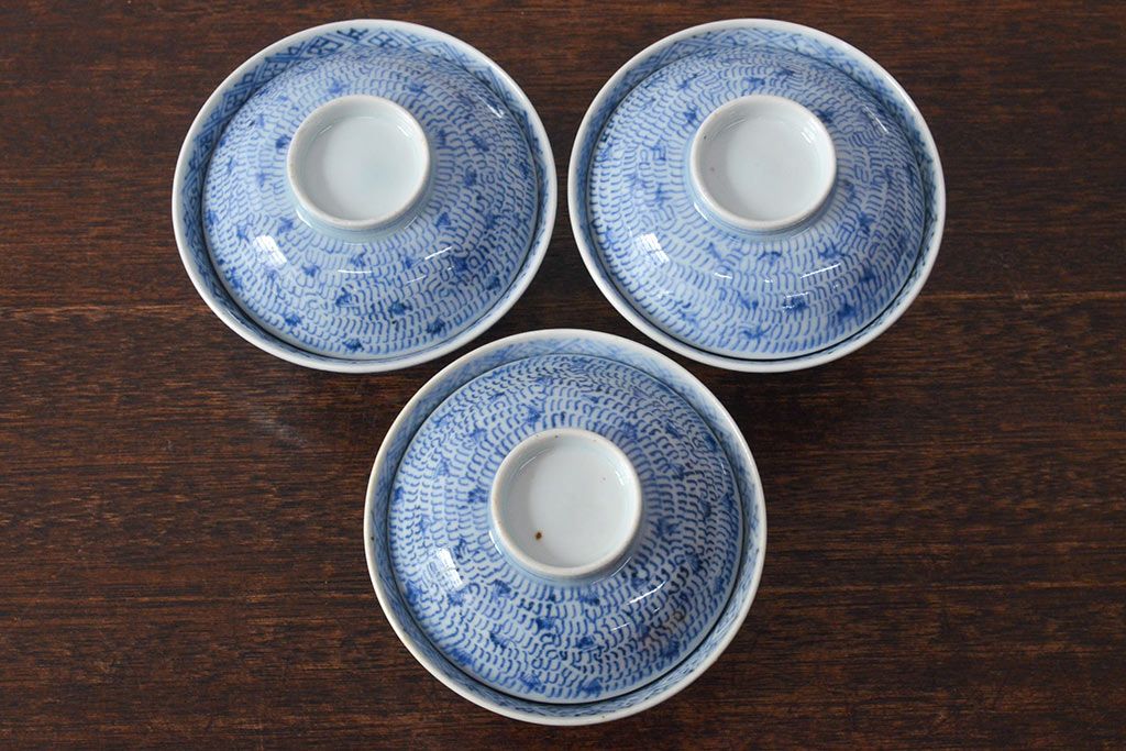 江戸期 古伊万里 染付微塵唐草 蓋茶碗3客セット(和食器)(R-052124)