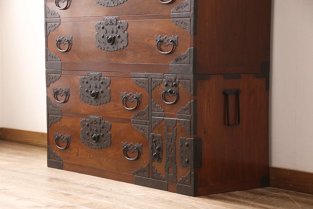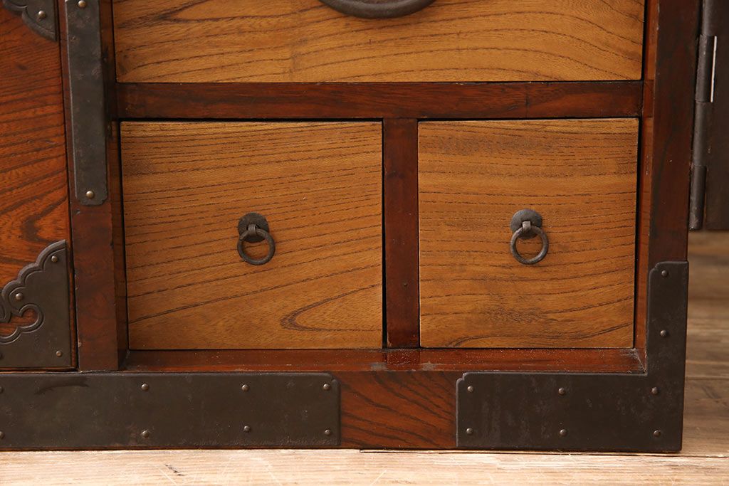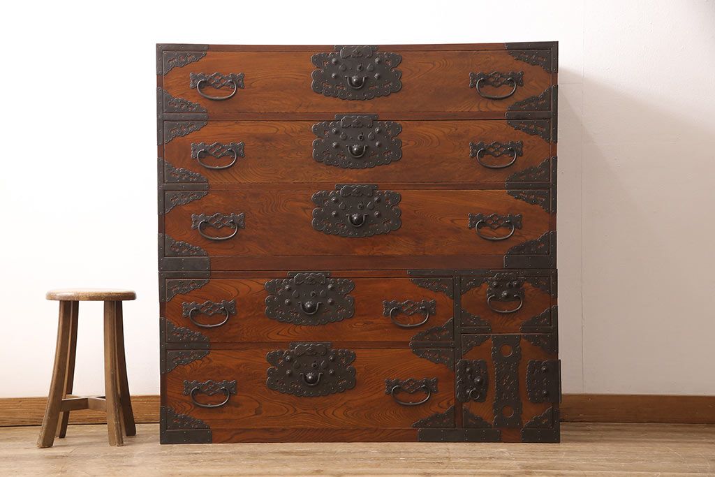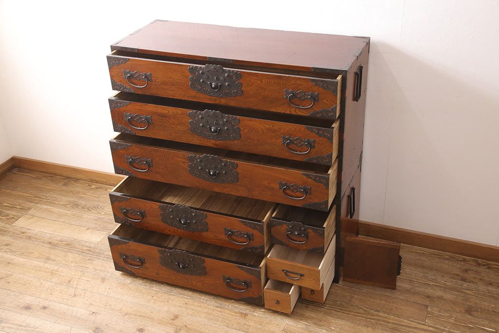 和製アンティーク 前面ケヤキ材 希少 迫力ある金具が目を引く五丁引き佐渡小木箪笥(衣装箪笥、引き出し、チェスト、重ねタンス)(R-052405)