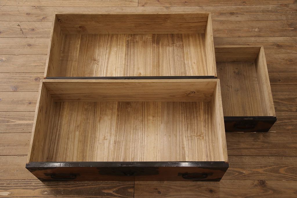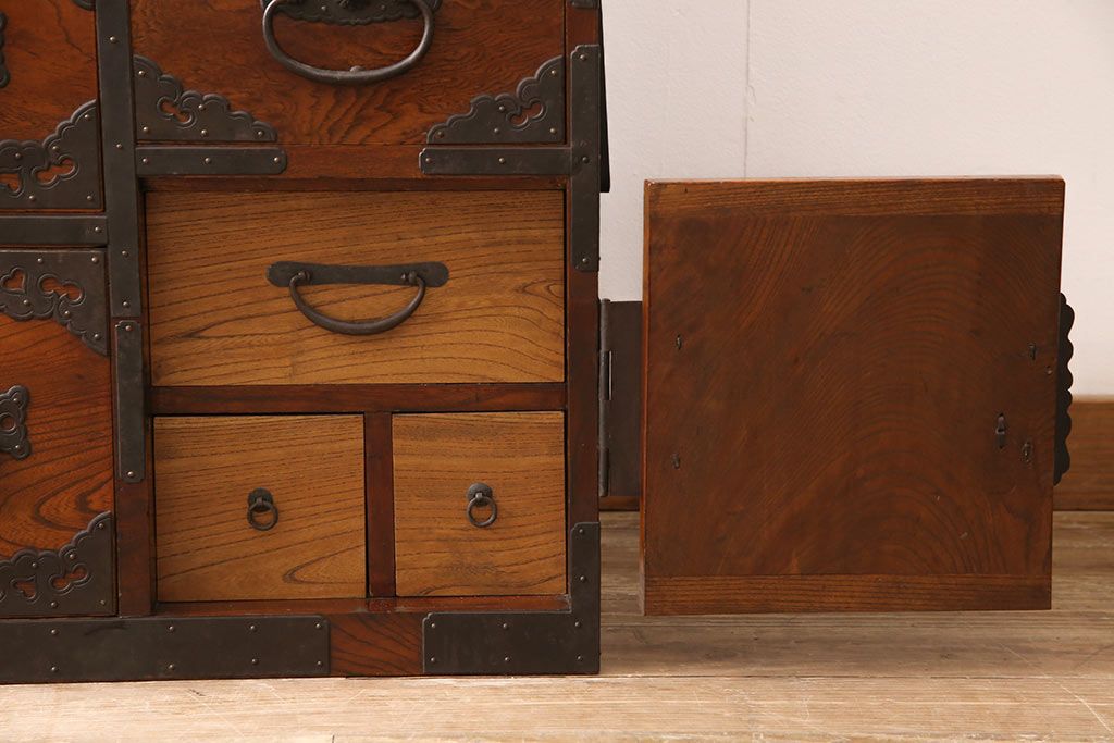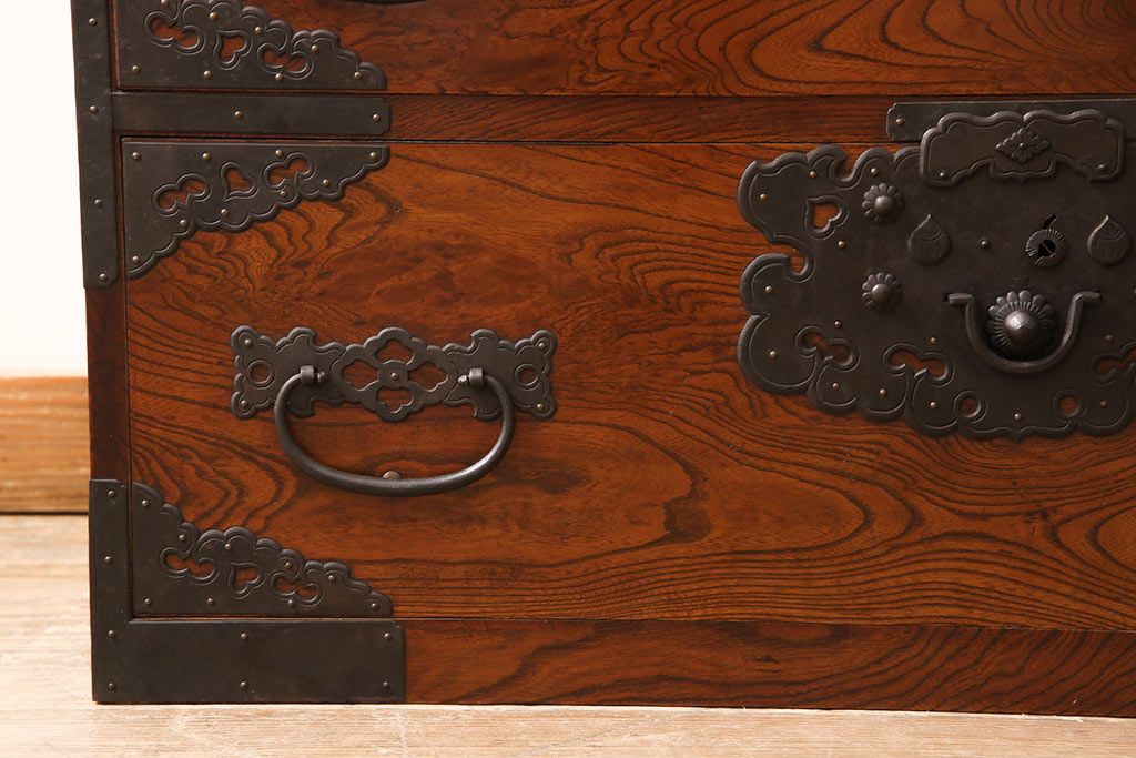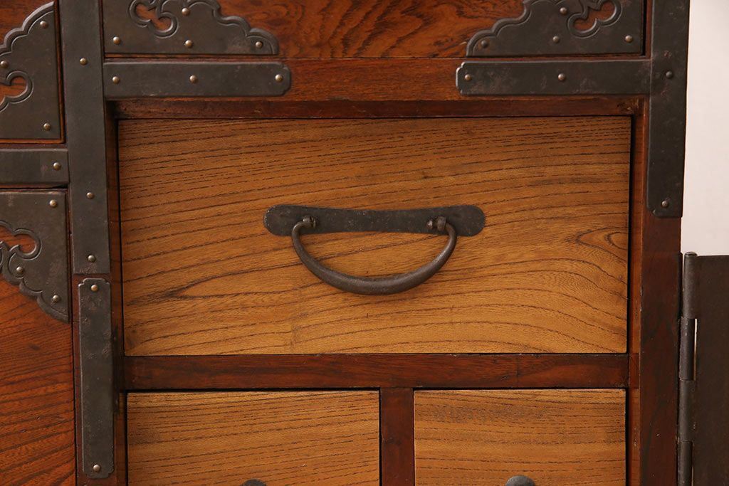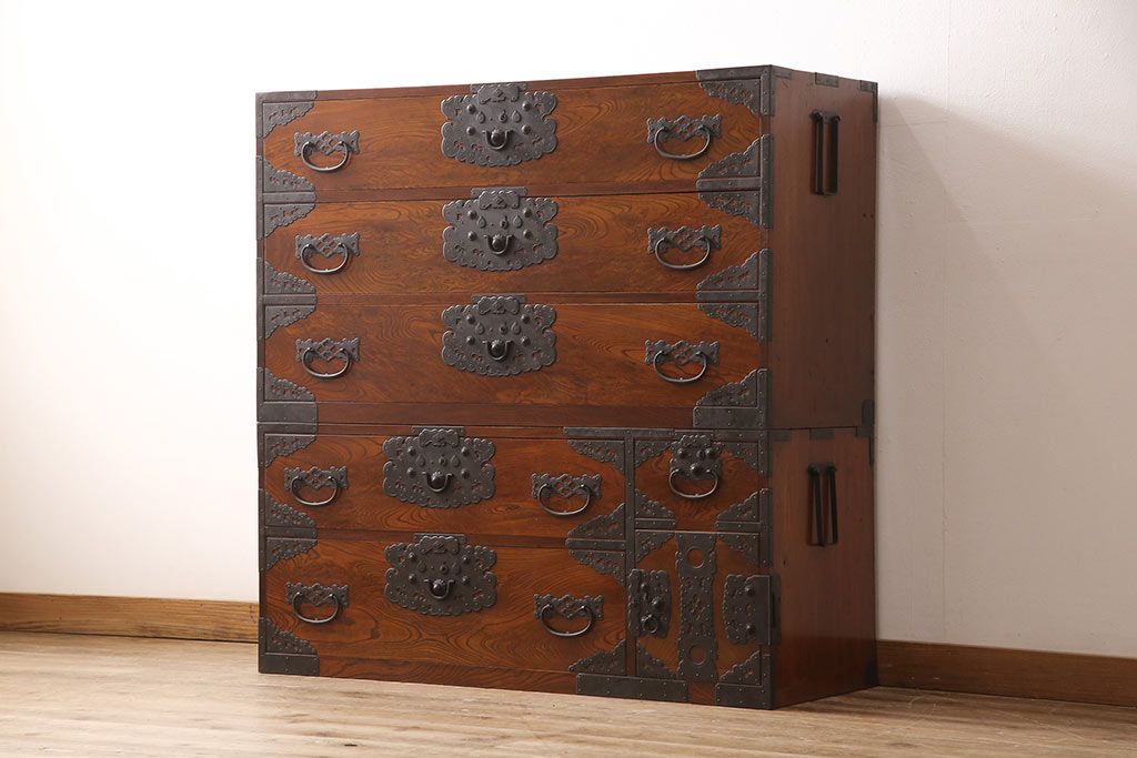 和製アンティーク 前面ケヤキ材 希少 迫力ある金具が目を引く五丁引き佐渡小木箪笥(衣装箪笥、引き出し、チェスト、重ねタンス)(R-052405)