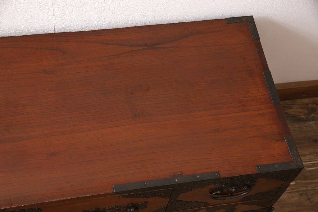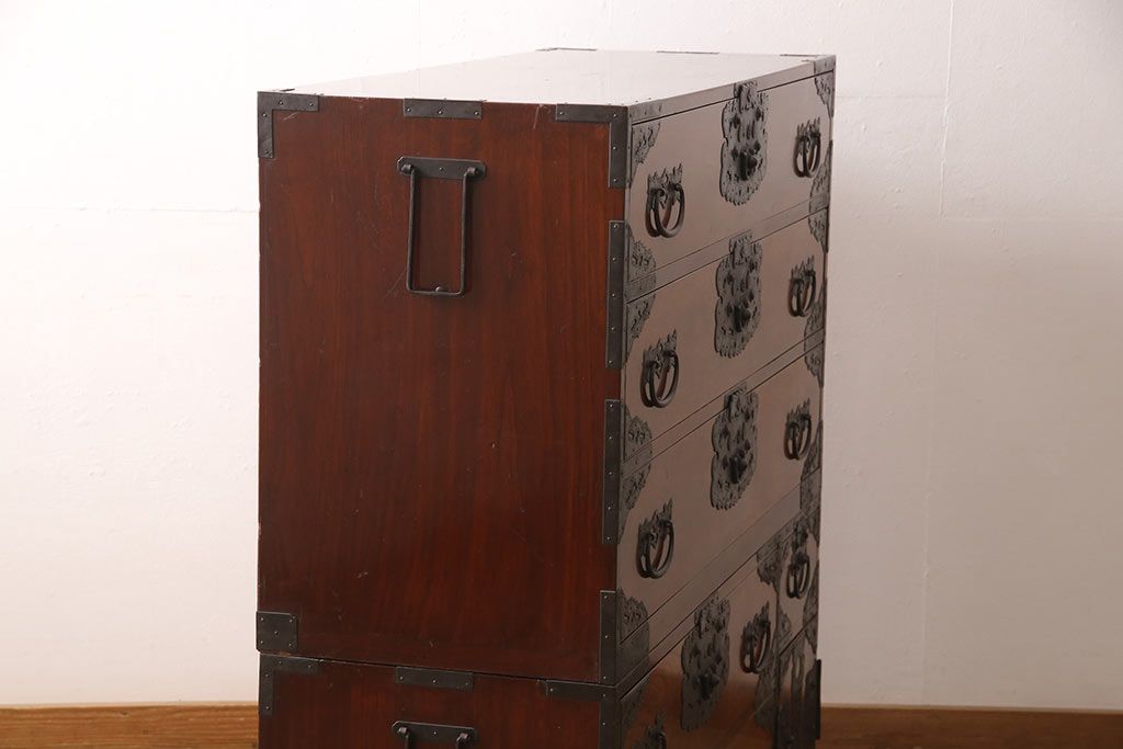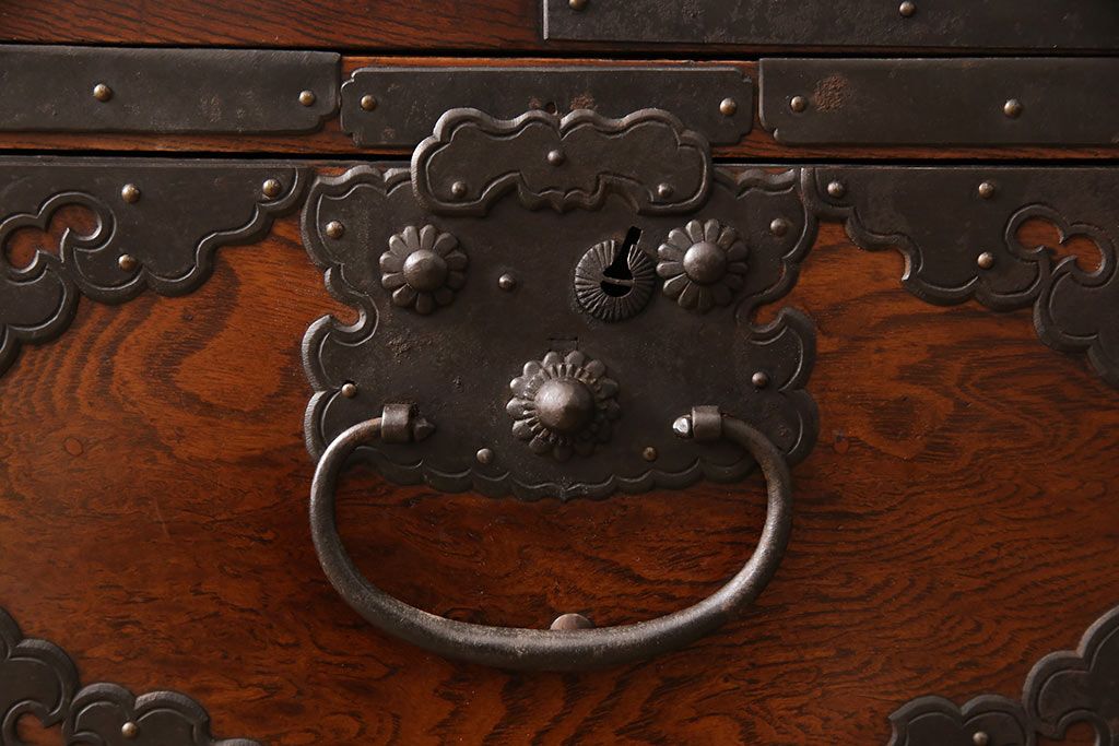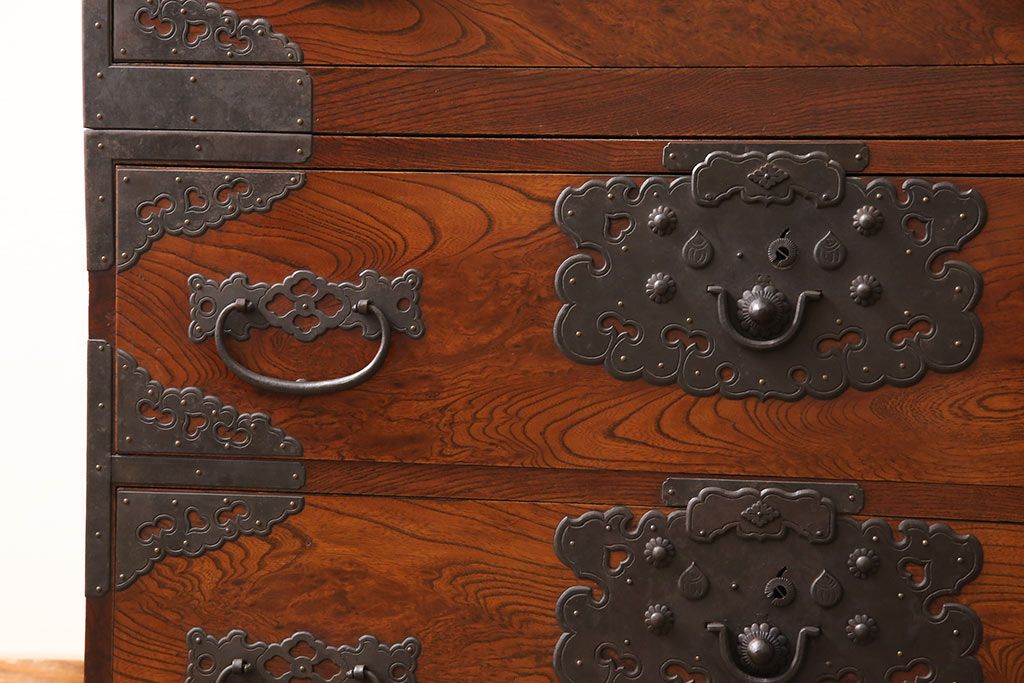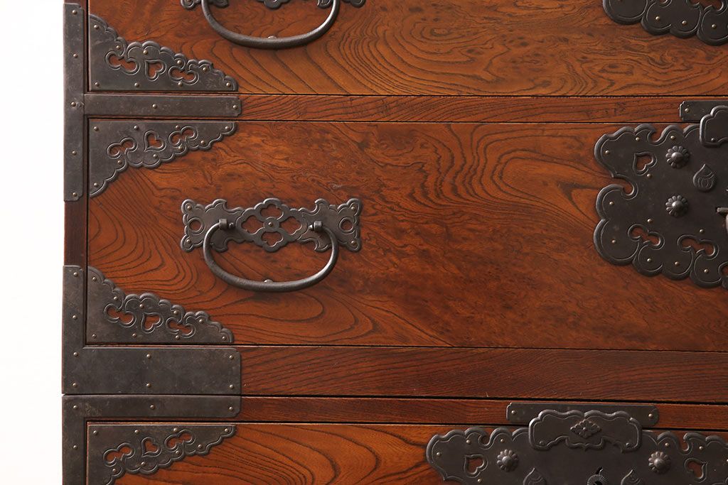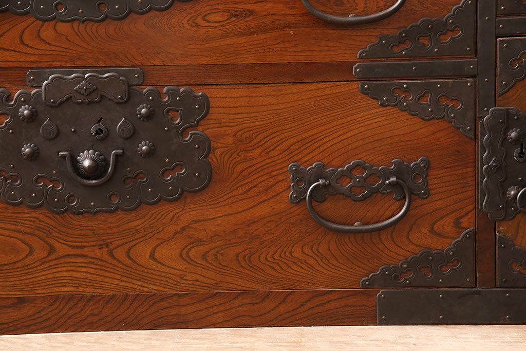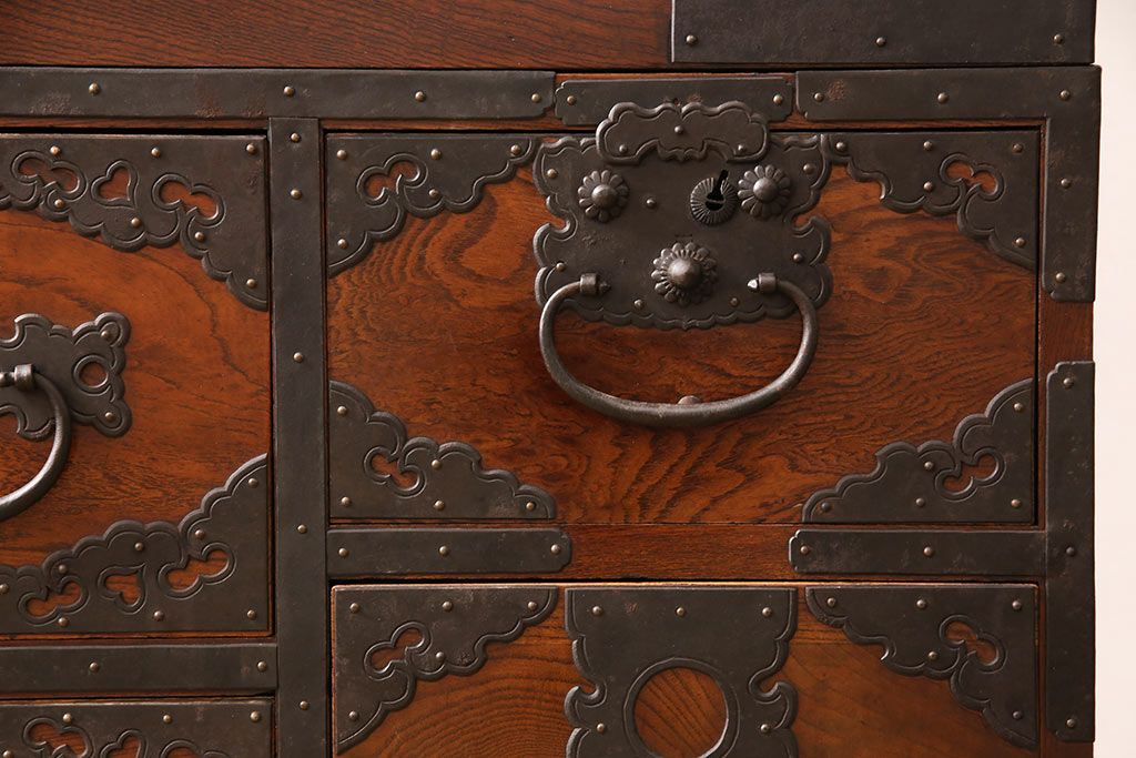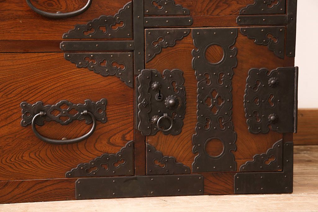 和箪笥> 衣装箪笥 > 和製アンティーク 前面ケヤキ材 希少 迫力ある金具が目を引く五丁引き佐渡小木箪笥(衣装箪笥、引き出し、チェスト、重ねタンス)(R-052405)