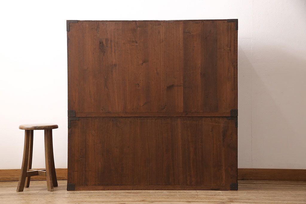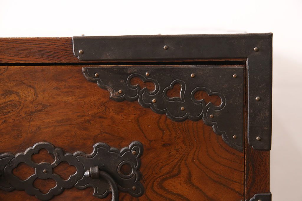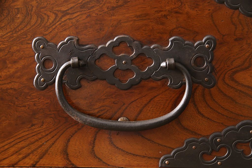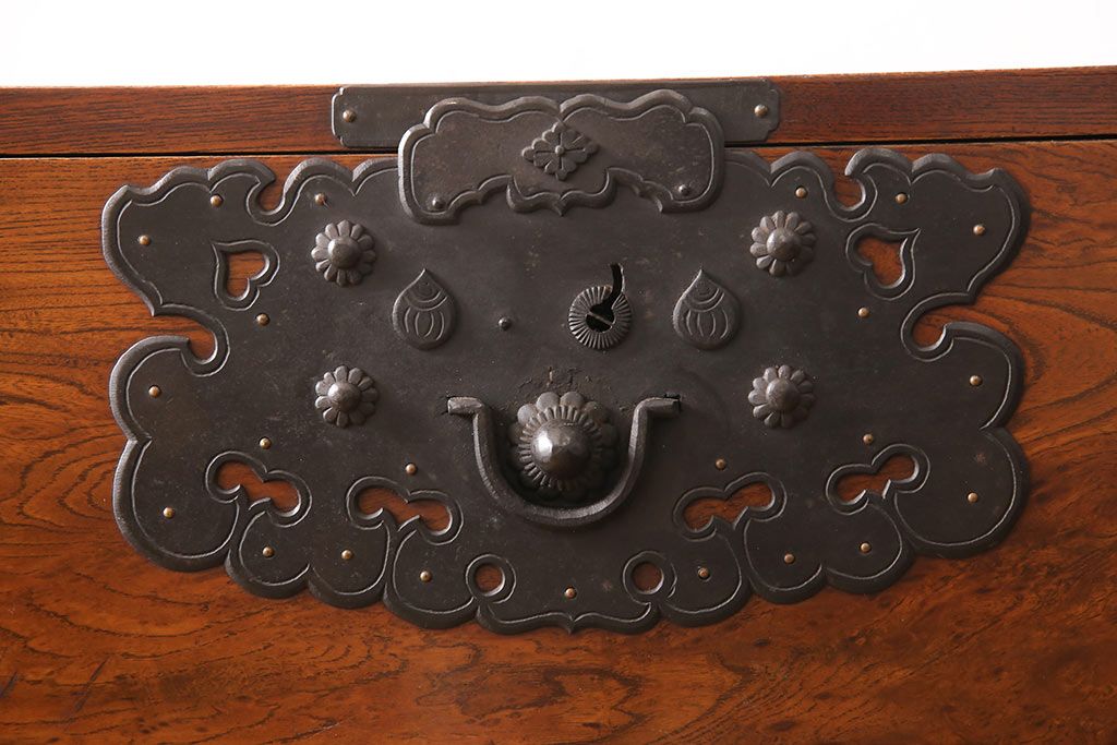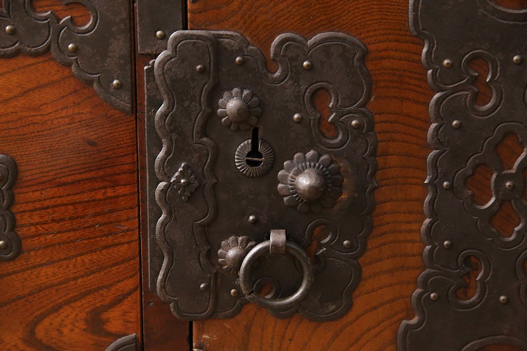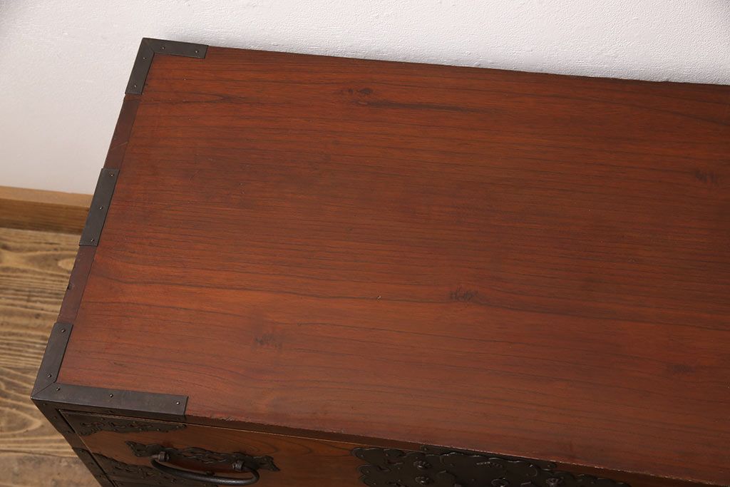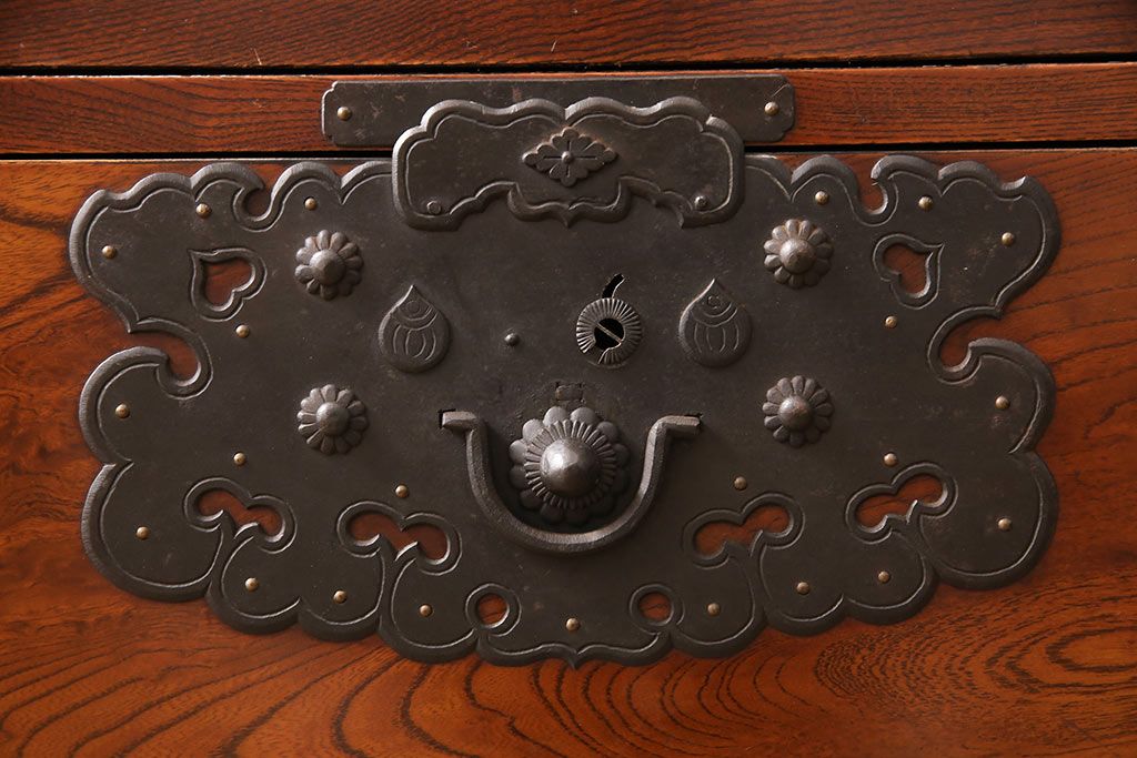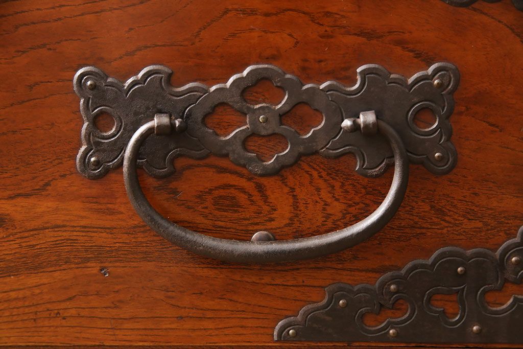 和箪笥> 衣装箪笥 > 和製アンティーク 前面ケヤキ材 希少 迫力ある金具が目を引く五丁引き佐渡小木箪笥(衣装箪笥、引き出し、チェスト、重ねタンス)(R-052405)
