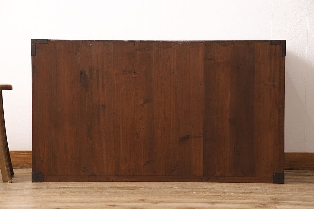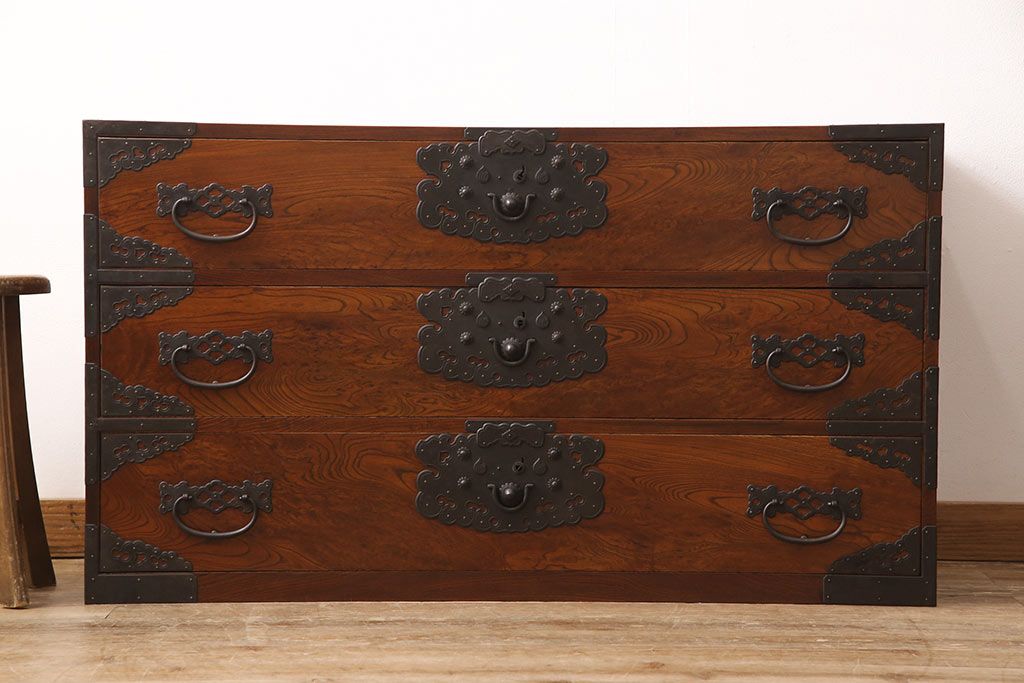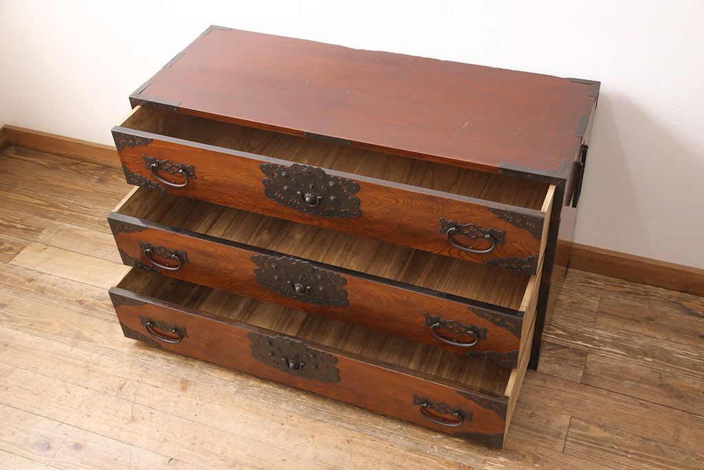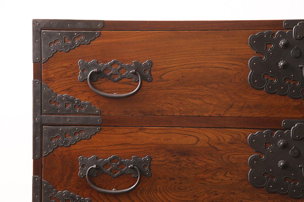 和製アンティーク 前面ケヤキ材 希少 迫力ある金具が目を引く佐渡小木箪笥・上段(衣装箪笥、引き出し、ローチェスト、ローボード)(R-052406)